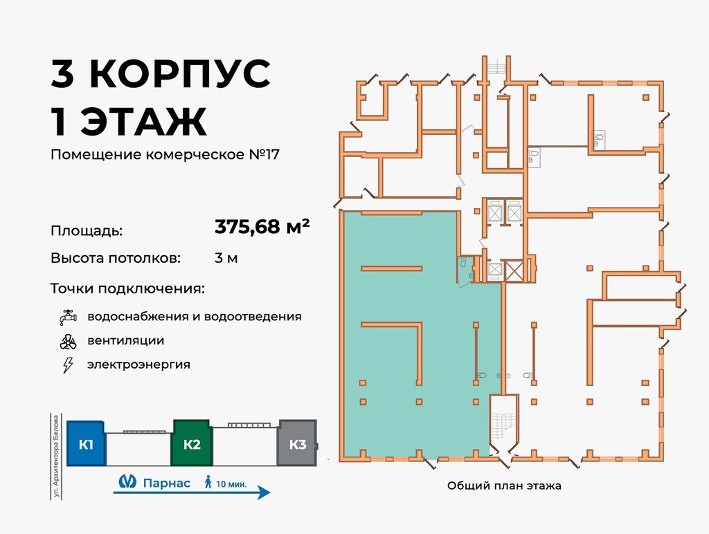 м 375,68 м2 Площадь: Высота потолков: водоснабжения и водоотведения Точки подключения: вентиляции электроэнергия Помещение комерческое №17 3 корпус 1 этаж Общий план этажа