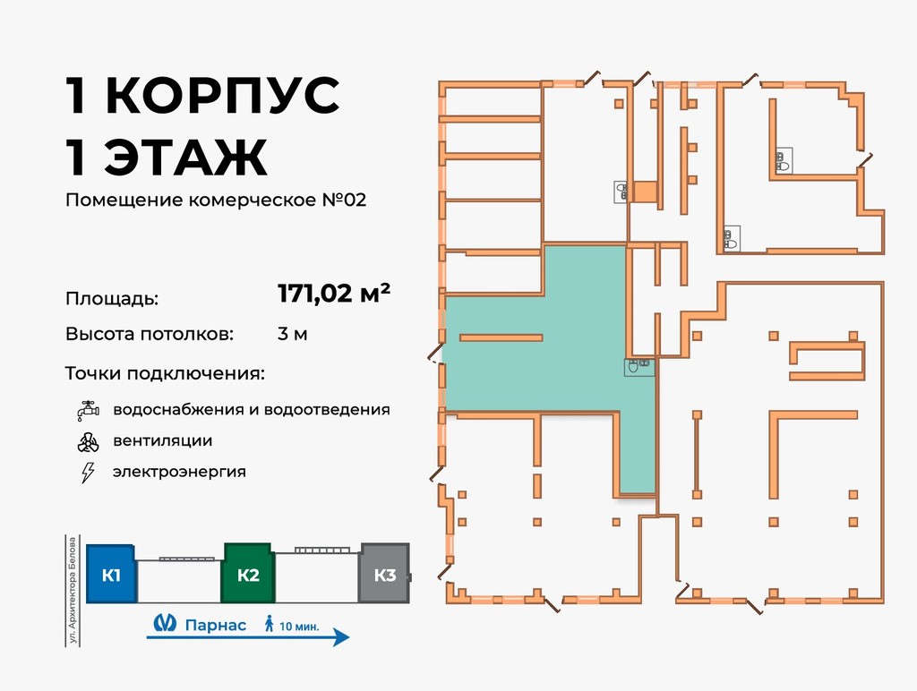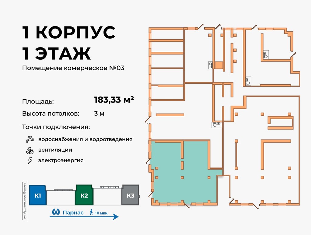 этажа ул. Архитектора Белова Парнас 10 мин. К1 К2 К3 Площадь: Высота потолков: водоснабжения и водоотведения Точки подключения: вентиляции электроэнергия Помещение комерческое №01