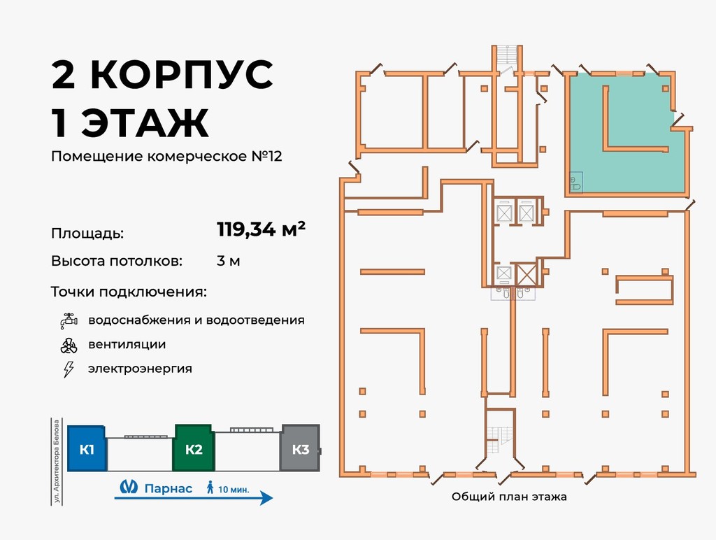 этажа ул. Архитектора Белова Парнас 10 мин. К1 К2 К3 Площадь: Высота потолков: водоснабжения и водоотведения Точки подключения: вентиляции электроэнергия Помещение комерческое №12