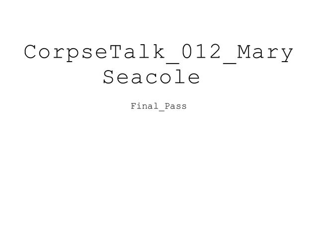 you on your feet in no time - It’s a powerful mixture! 16 ADAM 16 Speaking of powerful mixtures, you were half-Jamaican, half-Scottish- 17 MARY 17 I see what you did there. 18 ADAM 18 Thanks. But did that make things difficult for you given all the racism in the British Empire? 19 MARY 19 It did. But it wasn't too bad for me growing up in Jamaica. I was what we called ‘Creole’ and I was very proud of my roots. Speaking of which, pass the ginger root, please. Adam passes the ginger root. 20 ADAM 20 I see what YOU did there. 21 MARY 21 Thanks. There were still some very unfair rules though - like I wasn’t allowed to inherit anything from my father when he died. But actually I came across racism more when I started to travel the world. There, all done. CorpseTalk_012_Mary Seacole Final_Pass Page 131/564