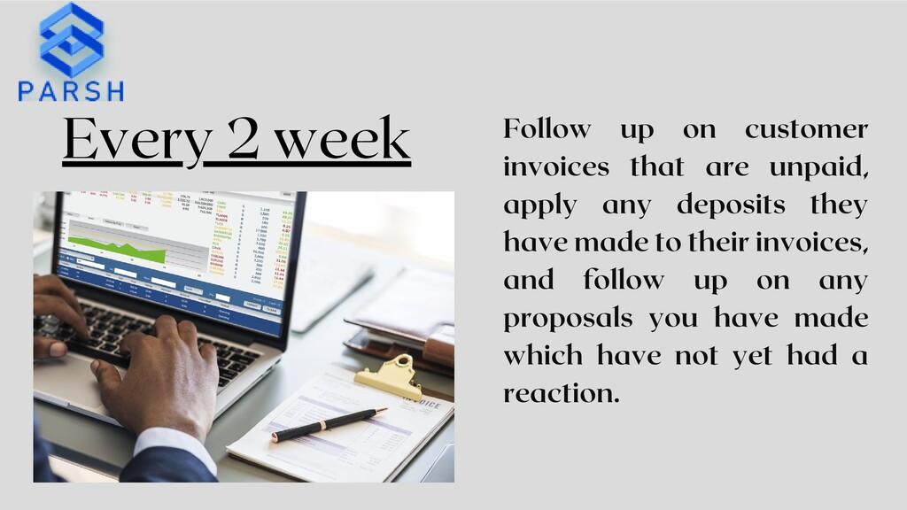 intensive reconciliations using the week’s cash sheets to refresh financial data, record payments received and categorize the expenses incurred, as well as keeping your inventory list up to date. It’s also time to deposit cash received, issue invoices, schedule any bills for payment and, if you are using accounting or bookkeeping software, to be sure to back up your data. Weekly