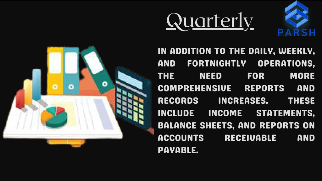 NEED FOR MORE COMPREHENSIVE REPORTS AND RECORDS INCREASES. THESE INCLUDE INCOME STATEMENTS, BALANCE SHEETS, AND REPORTS ON ACCOUNTS RECEIVABLE AND PAYABLE. Quarterly