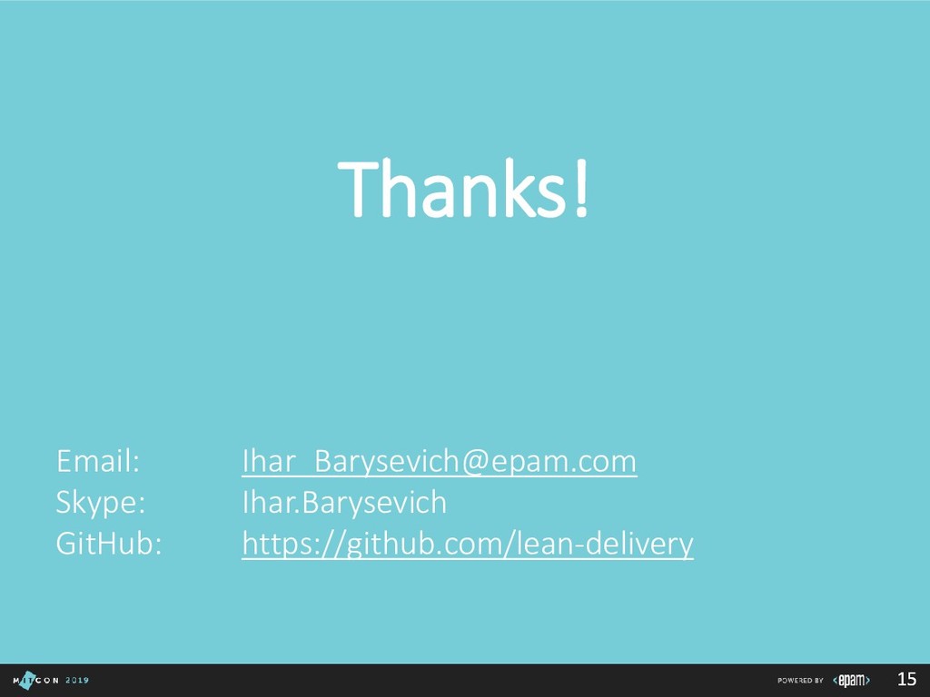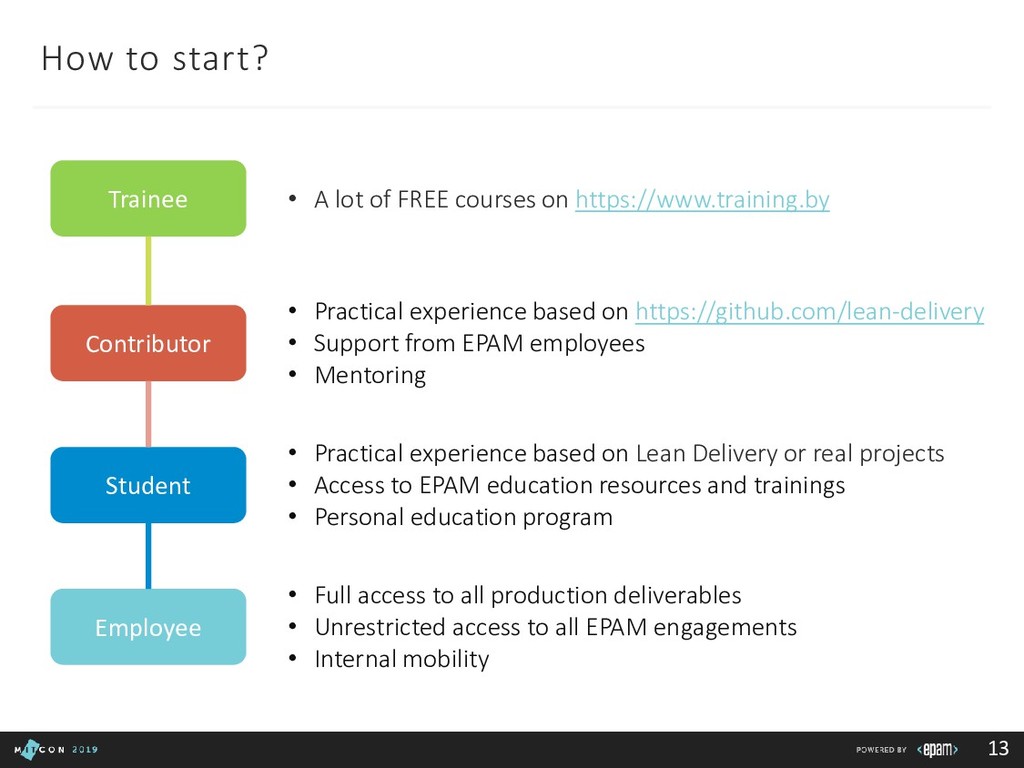lot of FREE courses on https://www.training.by • Practical experience based on https://github.com/lean-delivery • Support from EPAM employees • Mentoring • Practical experience based on Lean Delivery or real projects • Access to EPAM education resources and trainings • Personal education program • Full access to all production deliverables • Unrestricted access to all EPAM engagements • Internal mobility