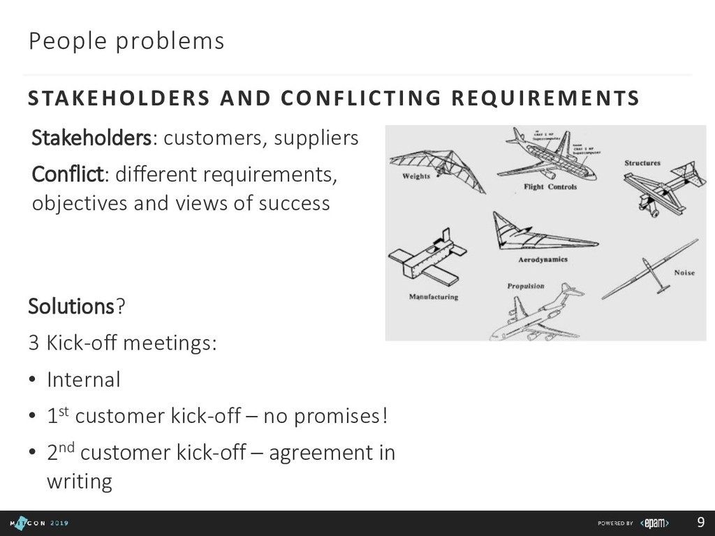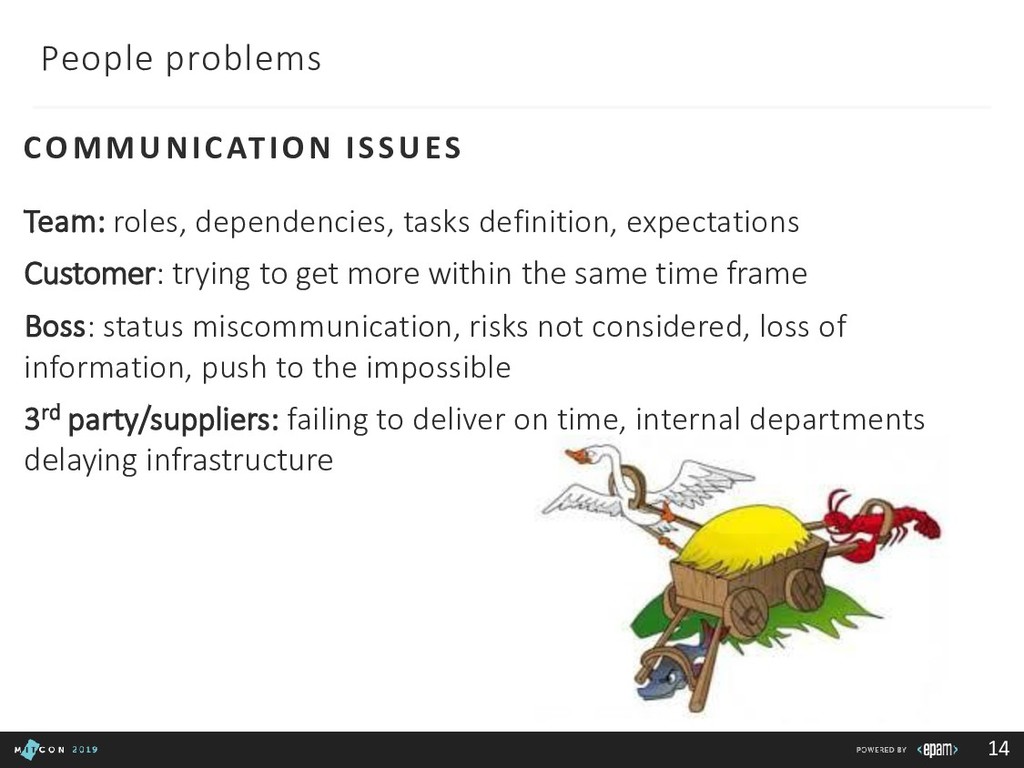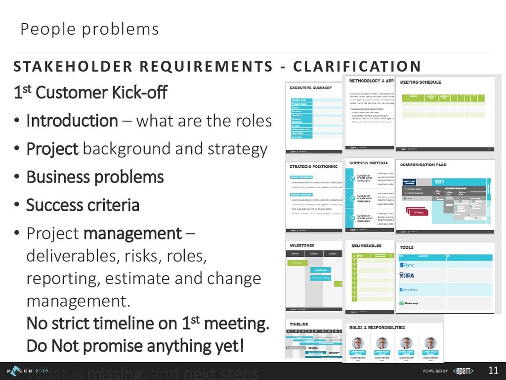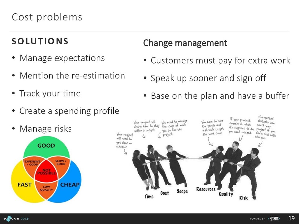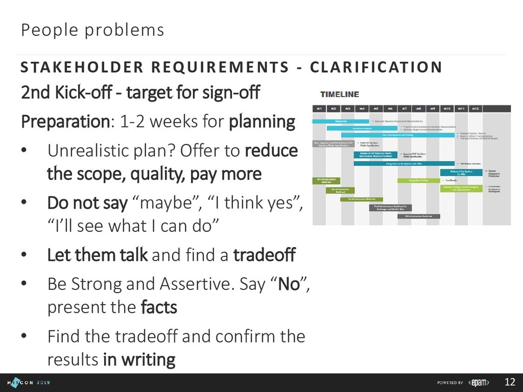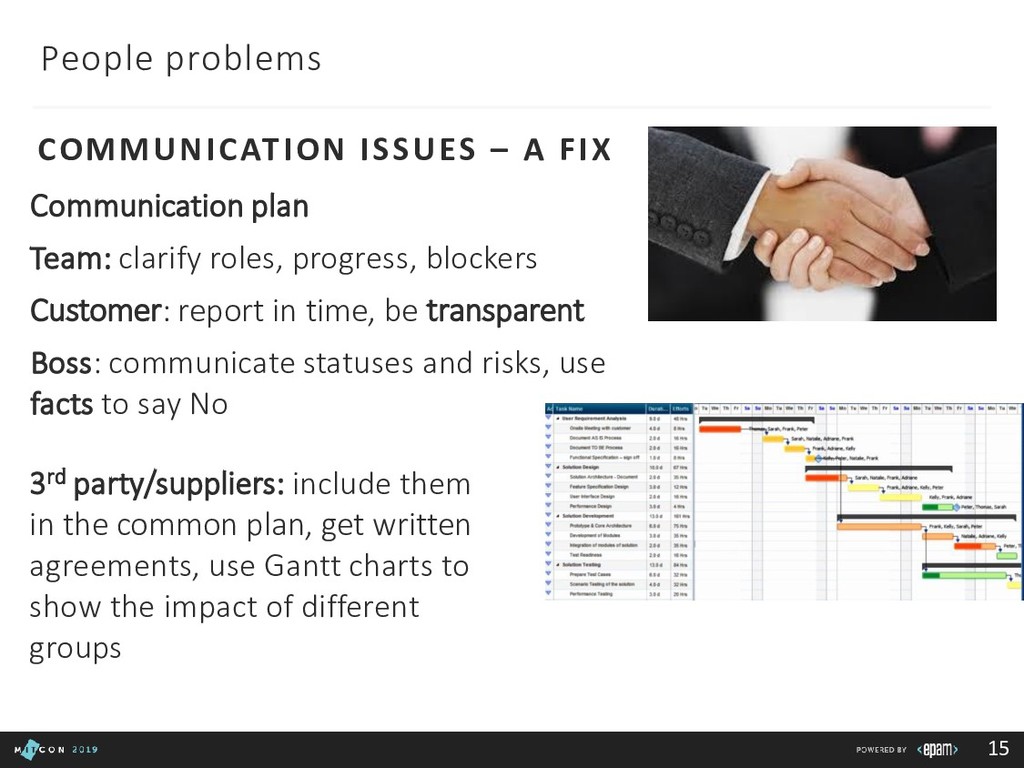 Team: clarify roles, progress, blockers Customer: report in time, be transparent Boss: communicate statuses and risks, use facts to say No 3rd party/suppliers: include them in the common plan, get written agreements, use Gantt charts to show the impact of different groups