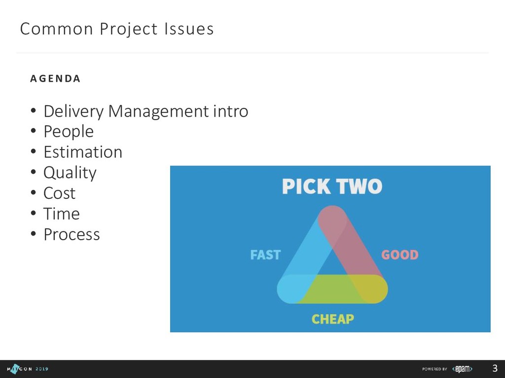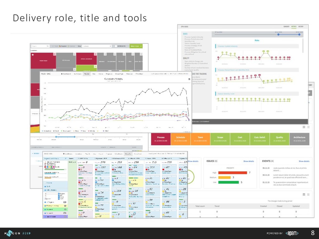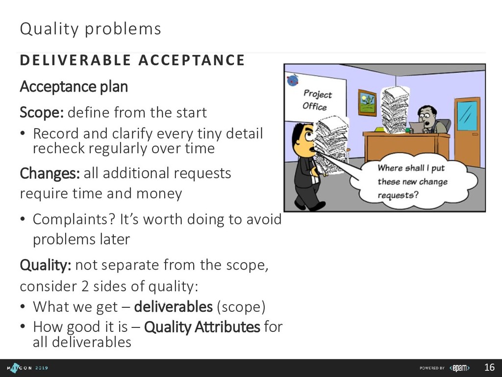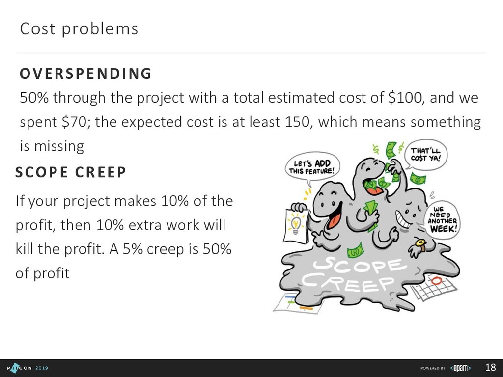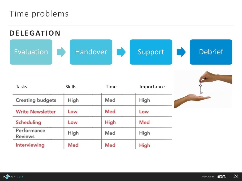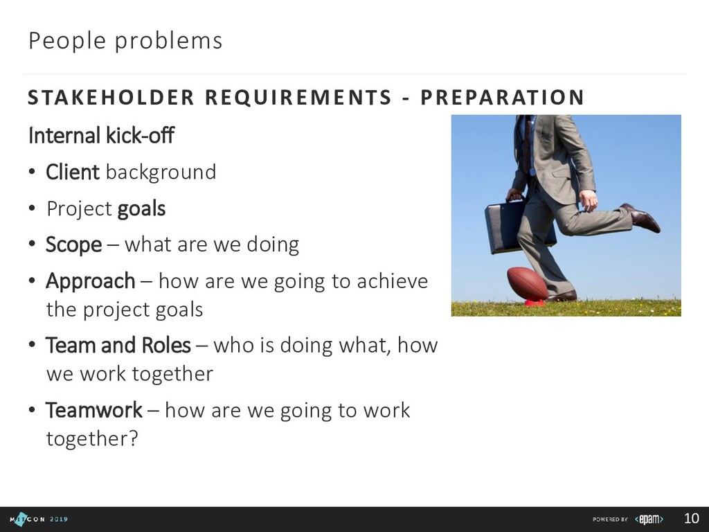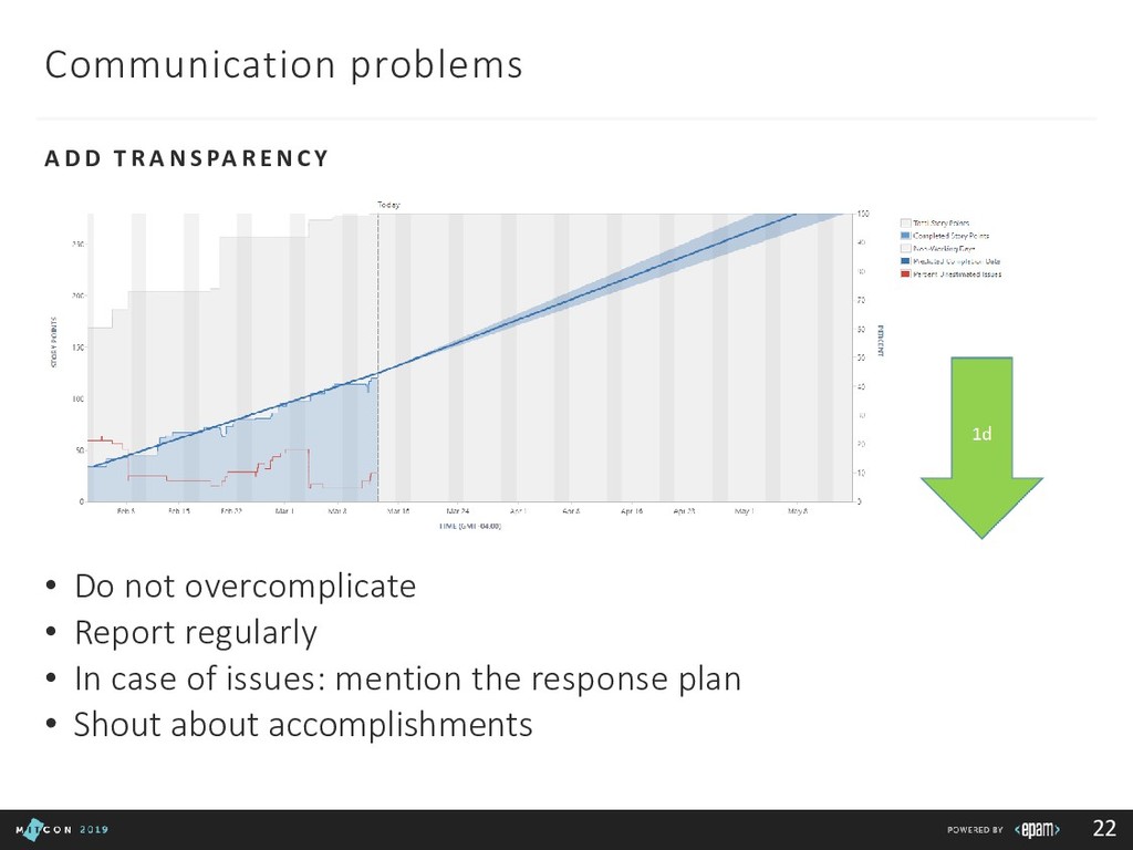 Team: clarify roles, progress, blockers Customer: report in time, be transparent Boss: communicate statuses and risks, use facts to say No 3rd party/suppliers: include them in the common plan, get written agreements, use Gantt charts to show the impact of different groups
