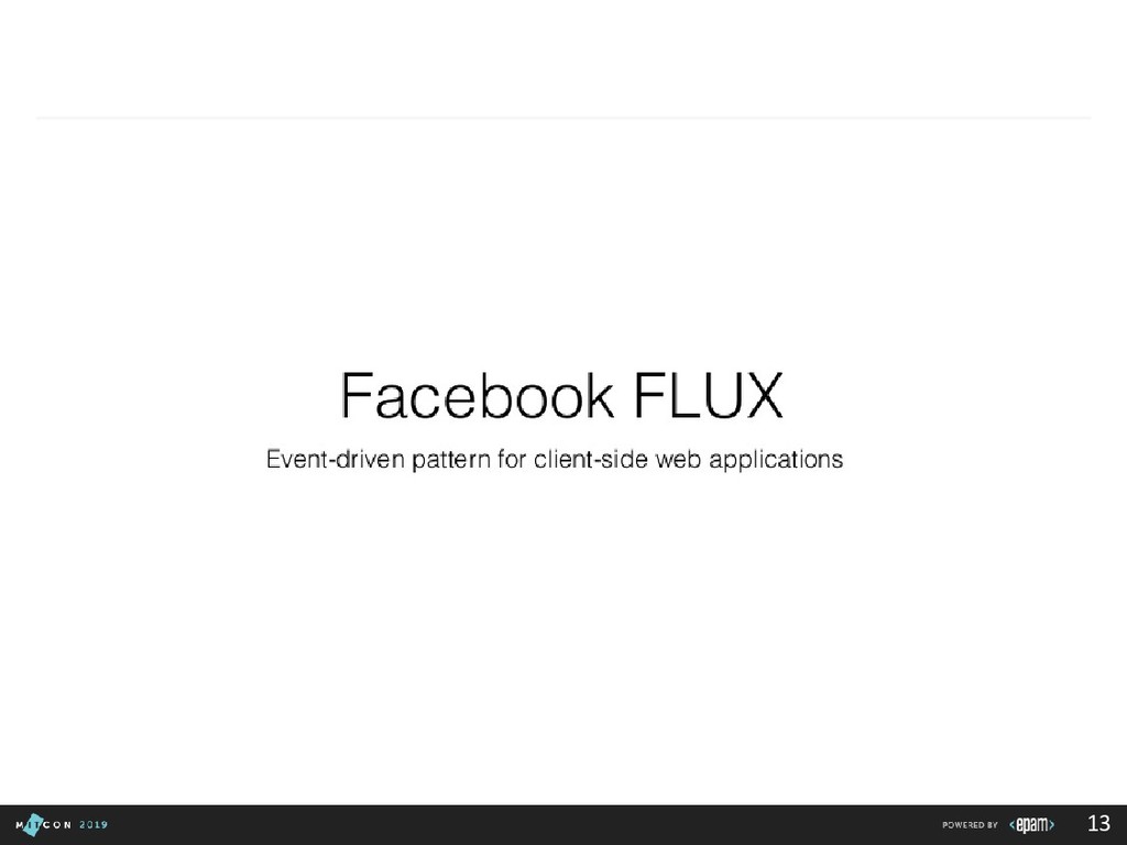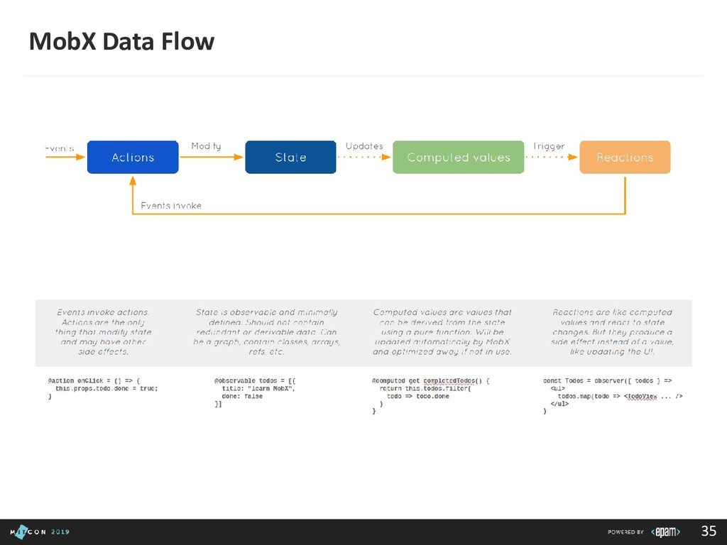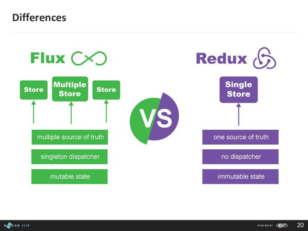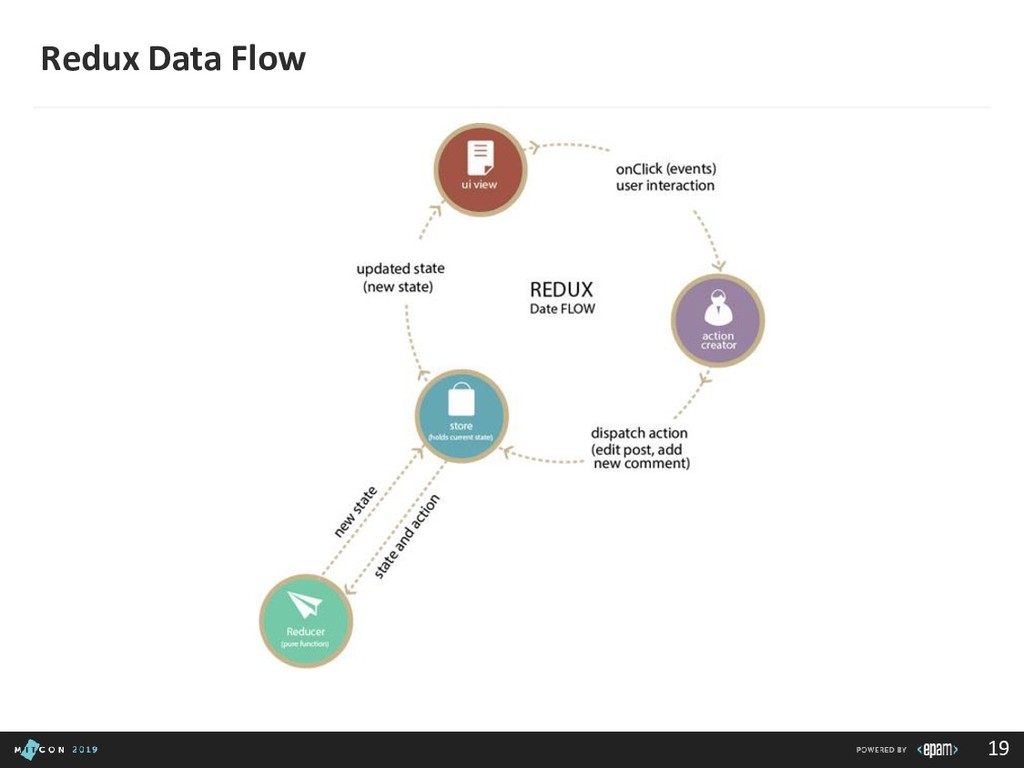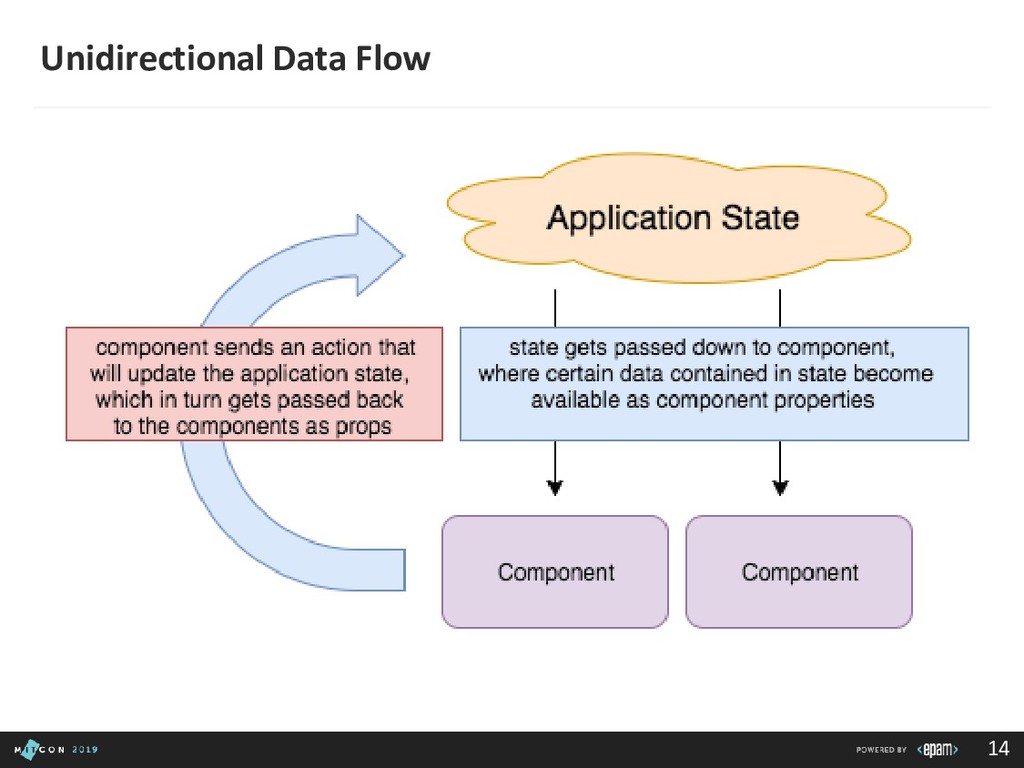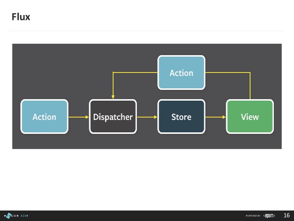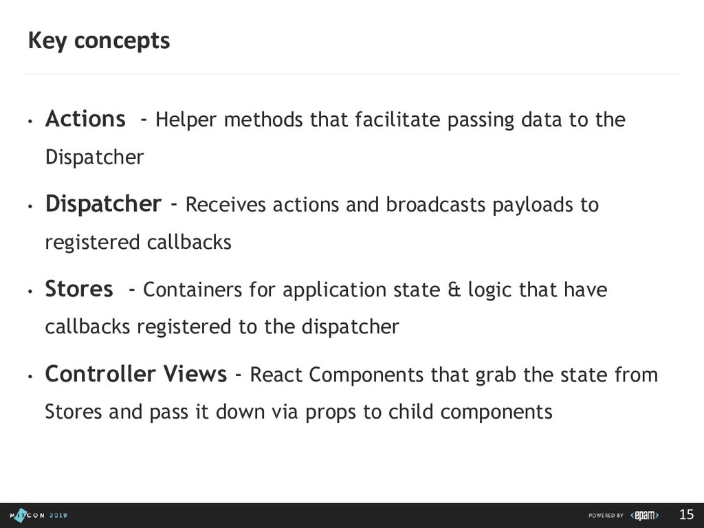 passing data to the Dispatcher • Dispatcher - Receives actions and broadcasts payloads to registered callbacks • Stores - Containers for application state & logic that have callbacks registered to the dispatcher • Controller Views - React Components that grab the state from Stores and pass it down via props to child components