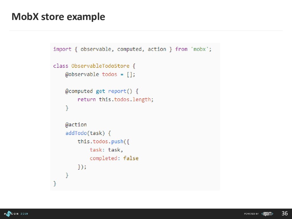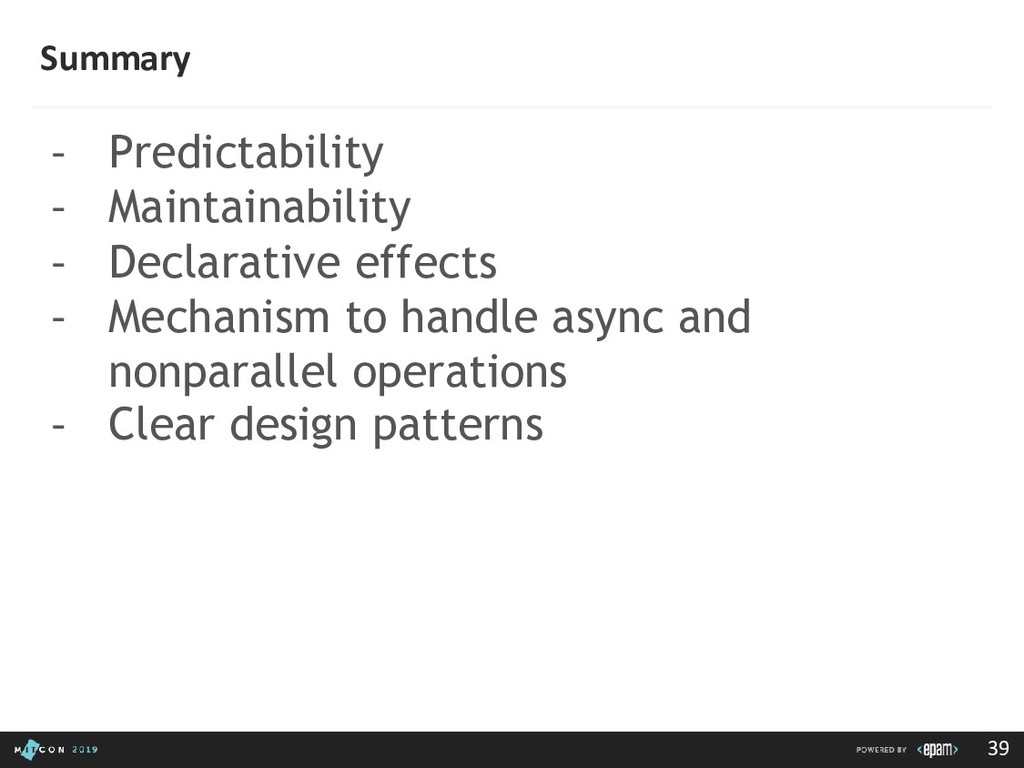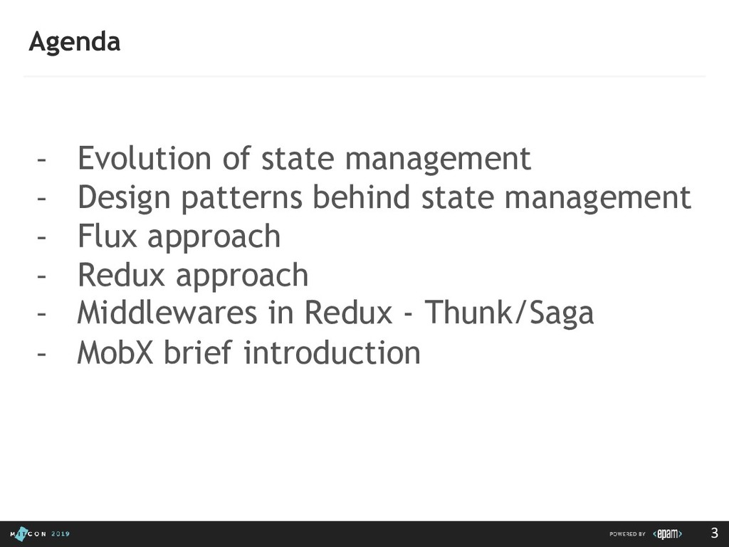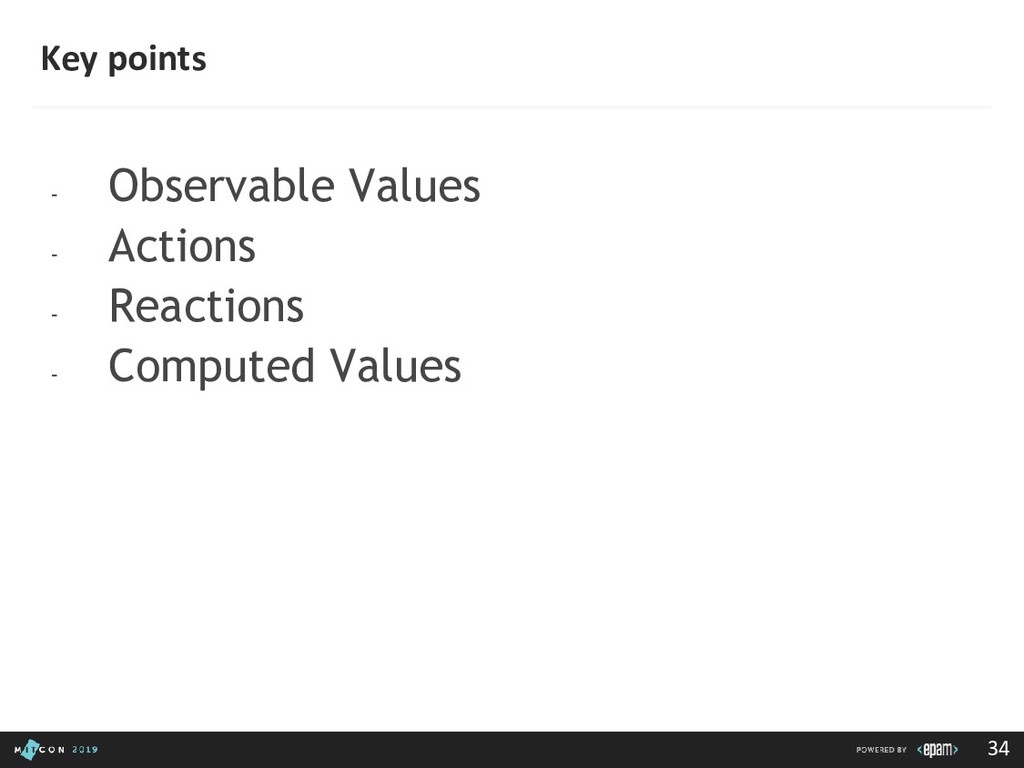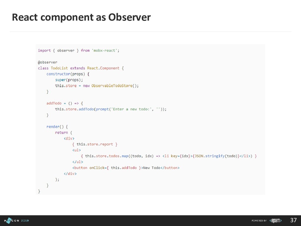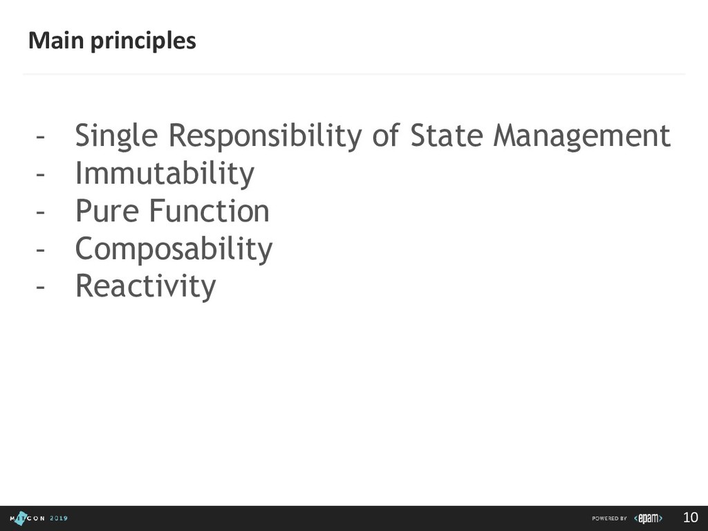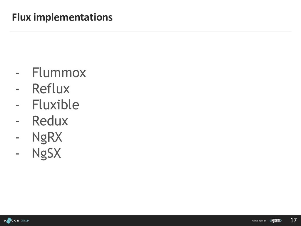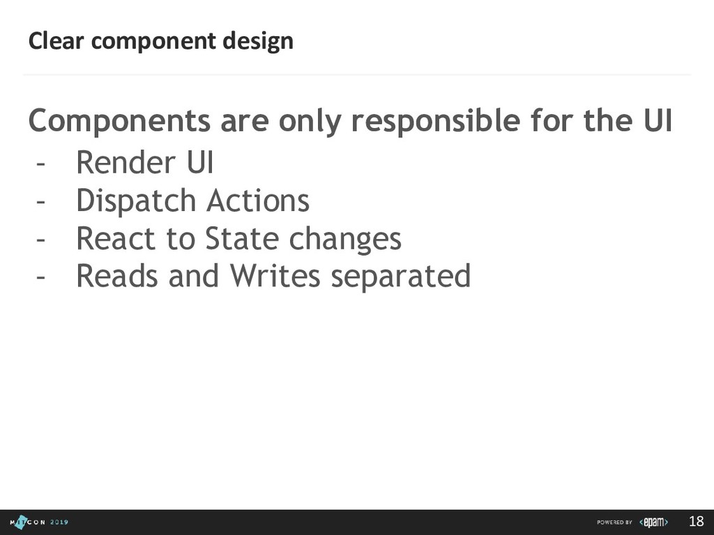 passing data to the Dispatcher • Dispatcher - Receives actions and broadcasts payloads to registered callbacks • Stores - Containers for application state & logic that have callbacks registered to the dispatcher • Controller Views - React Components that grab the state from Stores and pass it down via props to child components