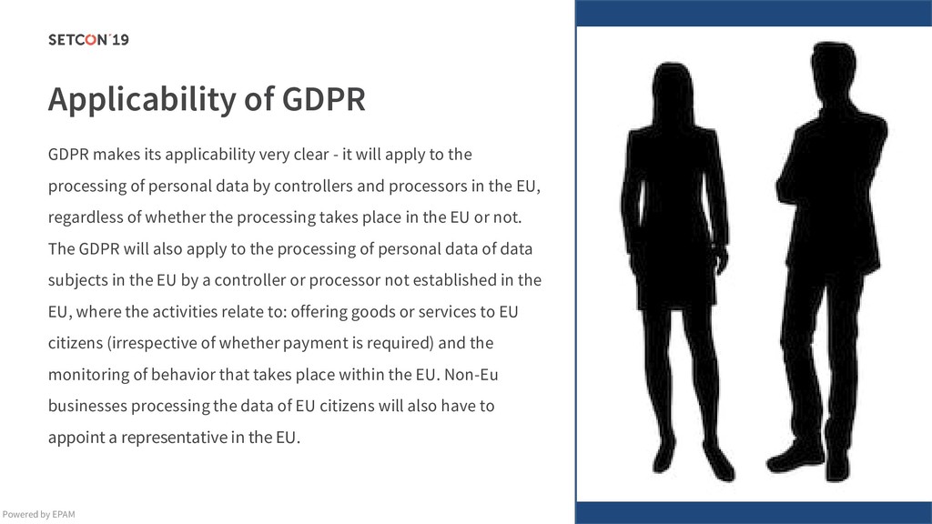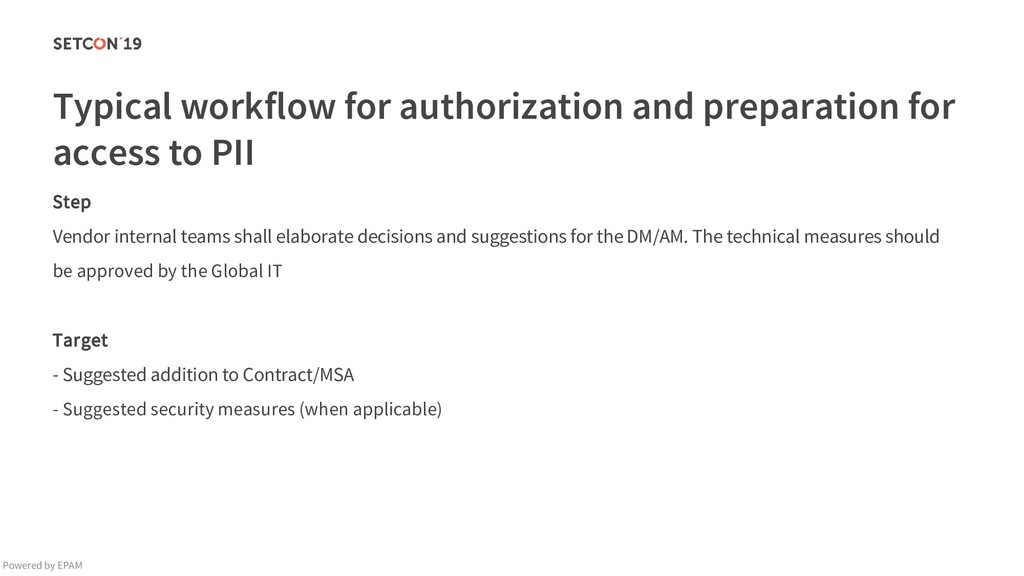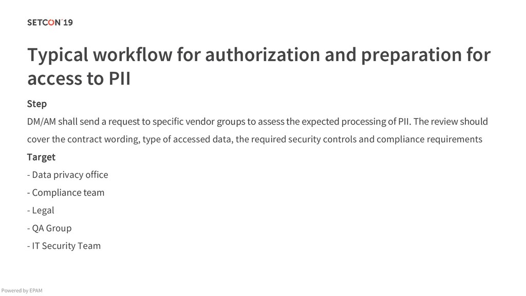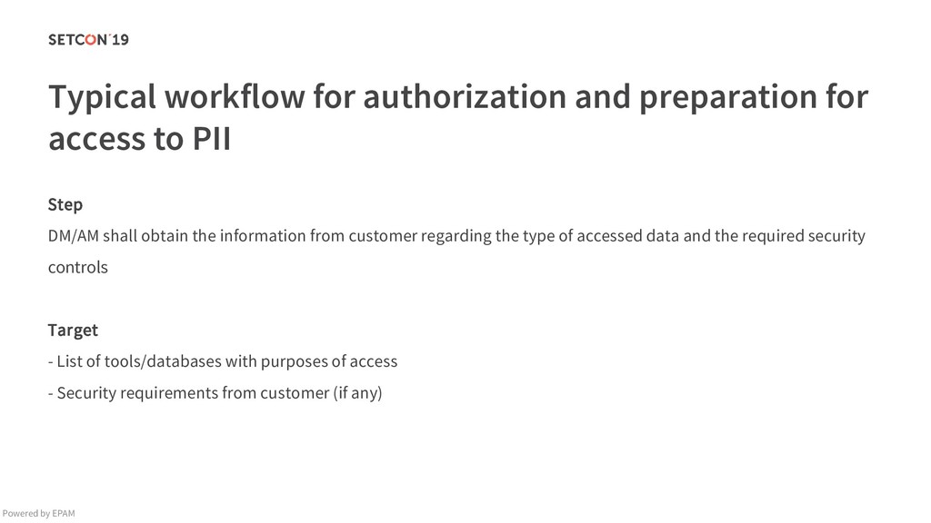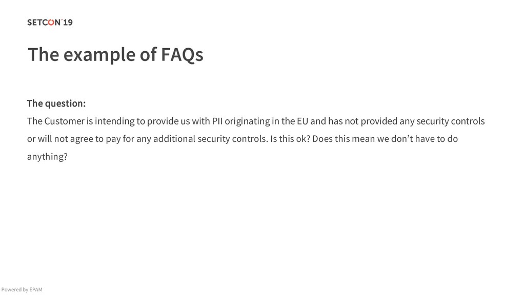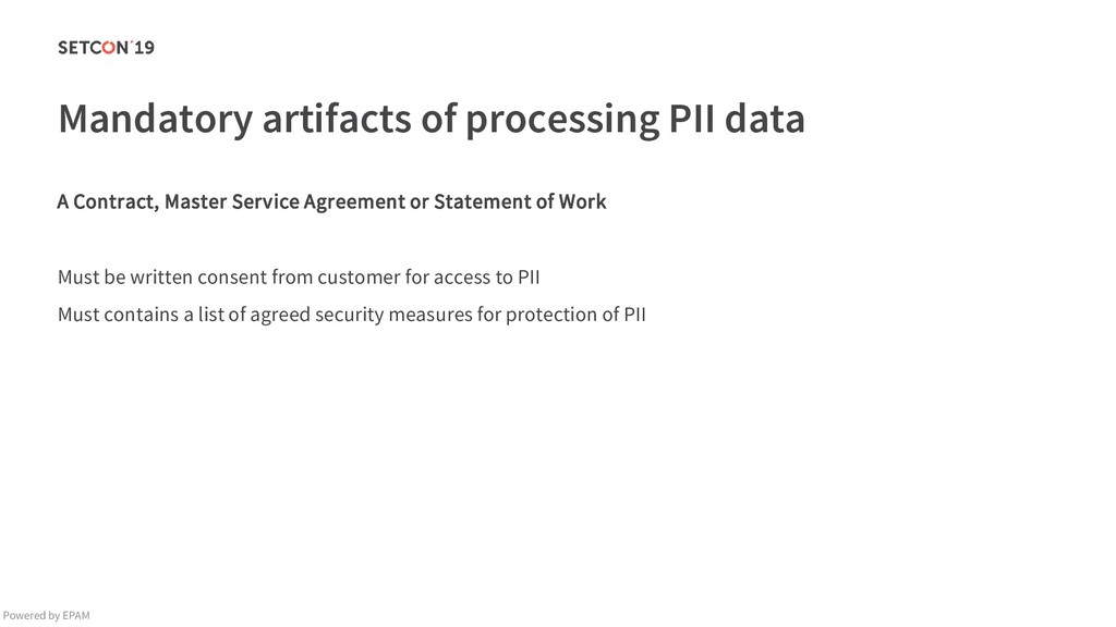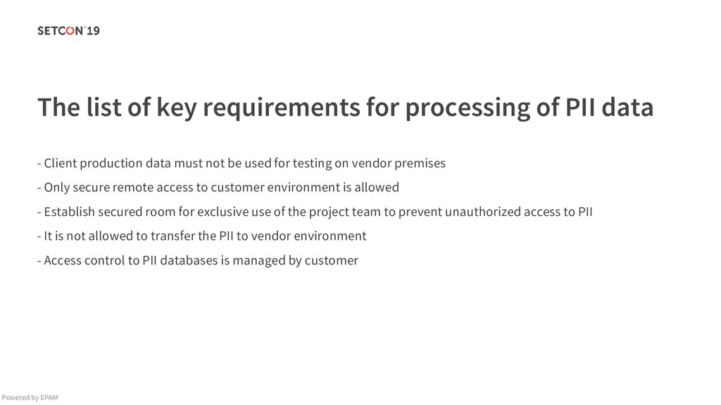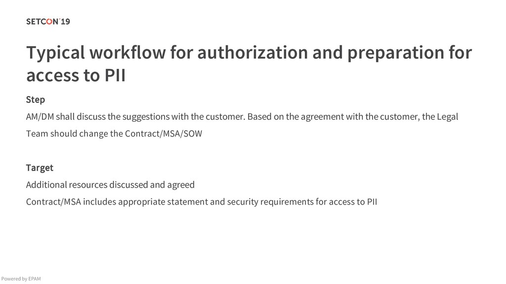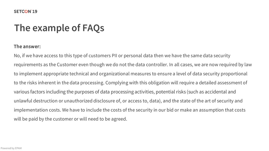 access to this type of customers PII or personal data then we have the same data security requirements as the Customer even though we do not the data controller. In all cases, we are now required by law to implement appropriate technical and organizational measures to ensure a level of data security proportional to the risks inherent in the data processing. Complying with this obligation will require a detailed assessment of various factors including the purposes of data processing activities, potential risks (such as accidental and unlawful destruction or unauthorized disclosure of, or access to, data), and the state of the art of security and implementation costs. We have to include the costs of the security in our bid or make an assumption that costs will be paid by the customer or will need to be agreed. Powered by EPAM