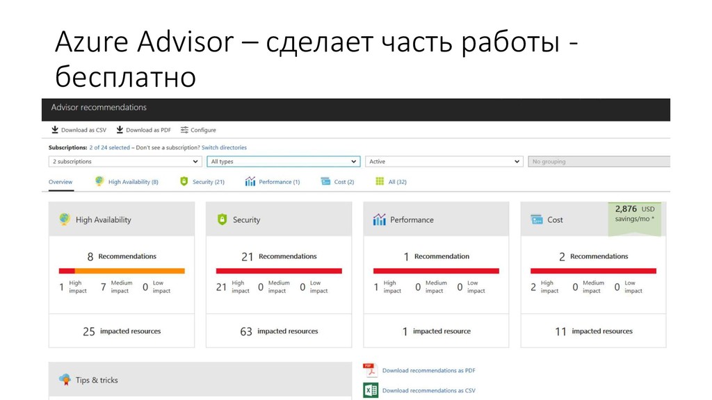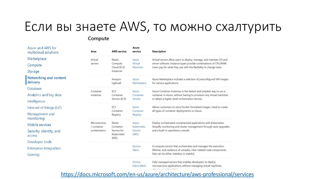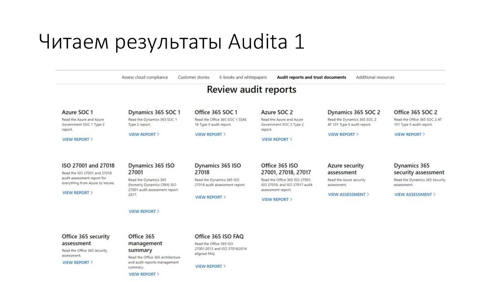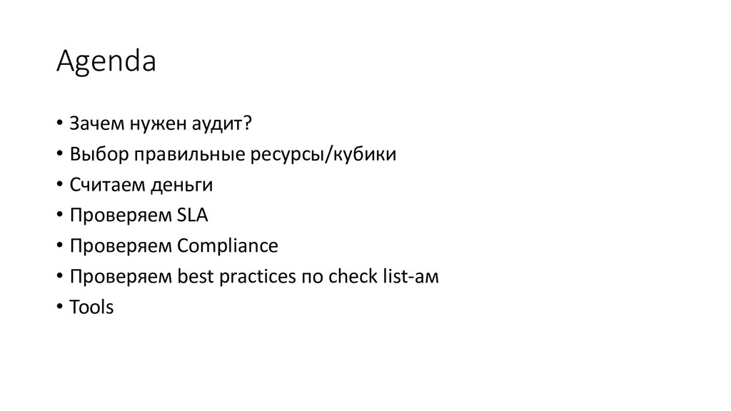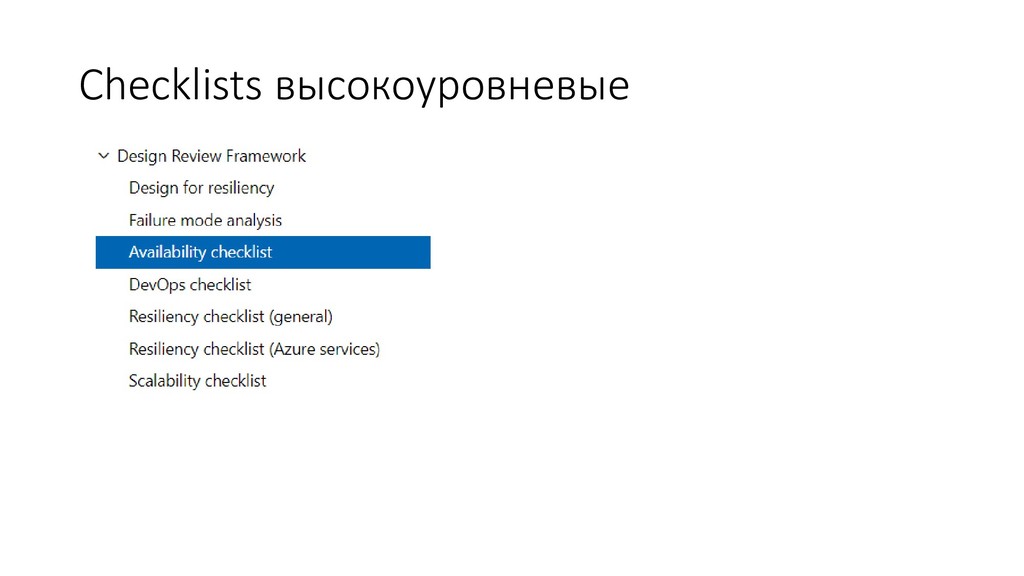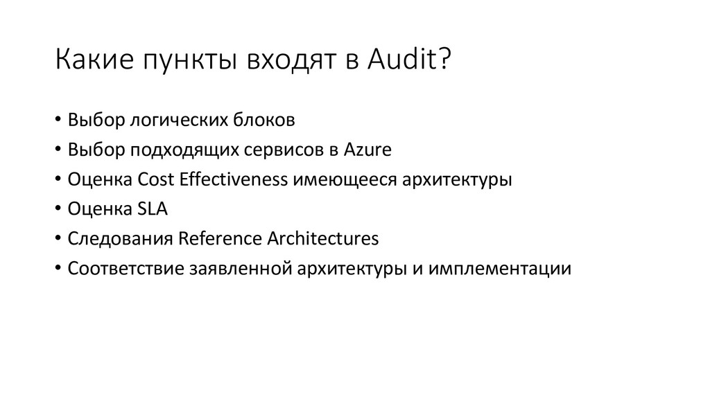 Выбор подходящих сервисов в Azure • Оценка Cost Effectiveness имеющееся архитектуры • Оценка SLA • Следования Reference Architectures • Соответствие заявленной архитектуры и имплементации