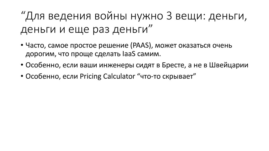 раз деньги” • Часто, самое простое решение (PAAS), может оказаться очень дорогим, что проще сделать IaaS самим. • Особенно, если ваши инженеры сидят в Бресте, а не в Швейцарии • Особенно, если Pricing Calculator “что-то скрывает”