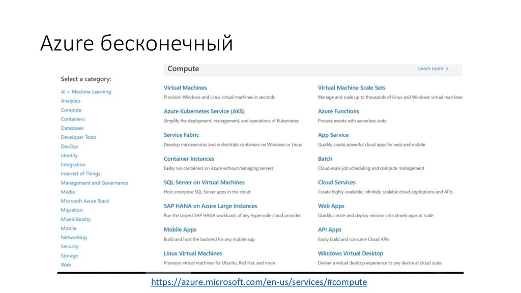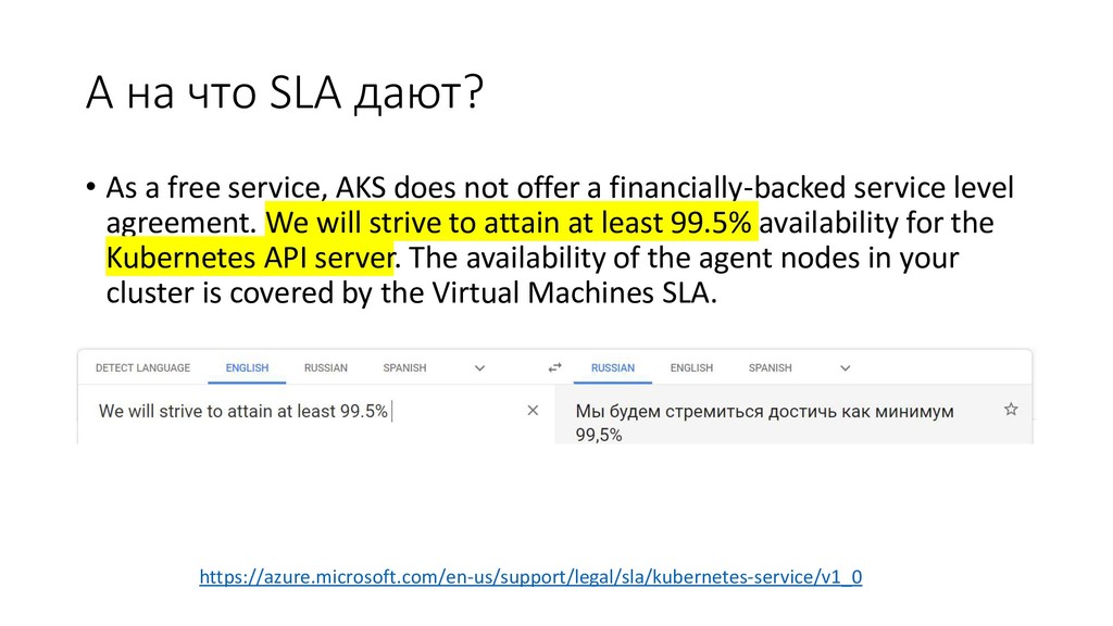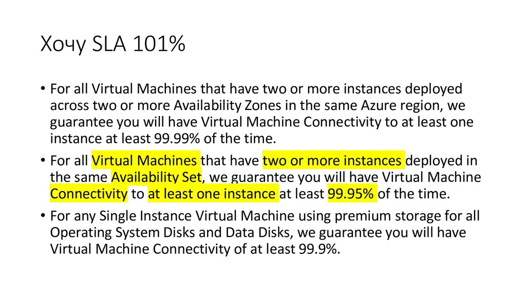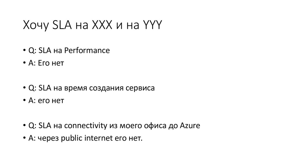 на Performance • A: Его нет • Q: SLA на время создания сервиса • A: его нет • Q: SLA на connectivity из моего офиса до Azure • A: через public internet его нет.