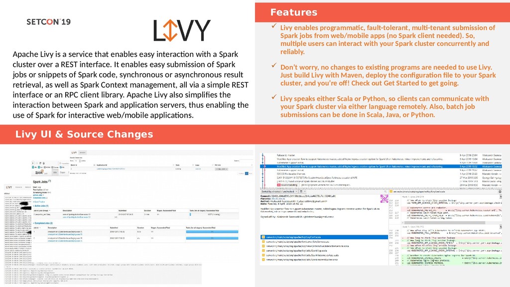 with a Spark cluster over a REST interface. It enables easy submission of Spark jobs or snippets of Spark code, synchronous or asynchronous result retrieval, as well as Spark Context management, all via a simple REST interface or an RPC client library. Apache Livy also simplifies the interaction between Spark and application servers, thus enabling the use of Spark for interactive web/mobile applications. Livy enables programmatic, fault-tolerant, multi-tenant submission of Spark jobs from web/mobile apps (no Spark client needed). So, multiple users can interact with your Spark cluster concurrently and reliably. Don’t worry, no changes to existing programs are needed to use Livy. Just build Livy with Maven, deploy the configuration file to your Spark cluster, and you’re off! Check out Get Started to get going. Livy speaks either Scala or Python, so clients can communicate with your Spark cluster via either language remotely. Also, batch job submissions can be done in Scala, Java, or Python. Livy UI & Source Changes