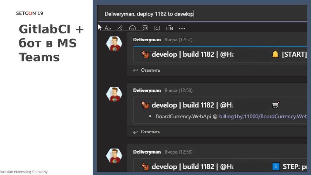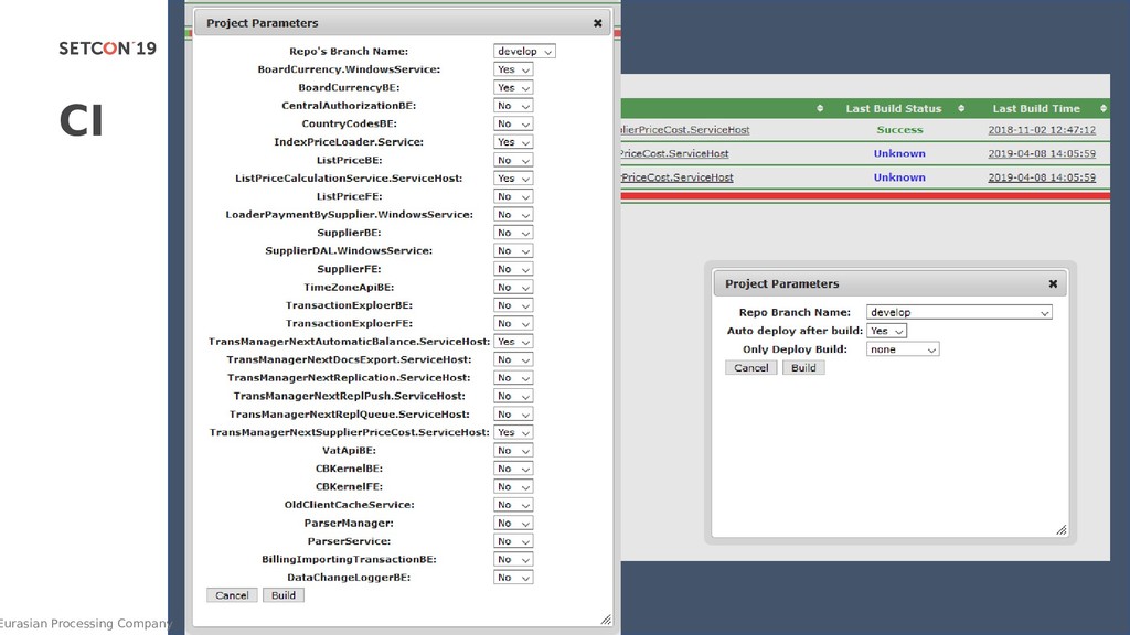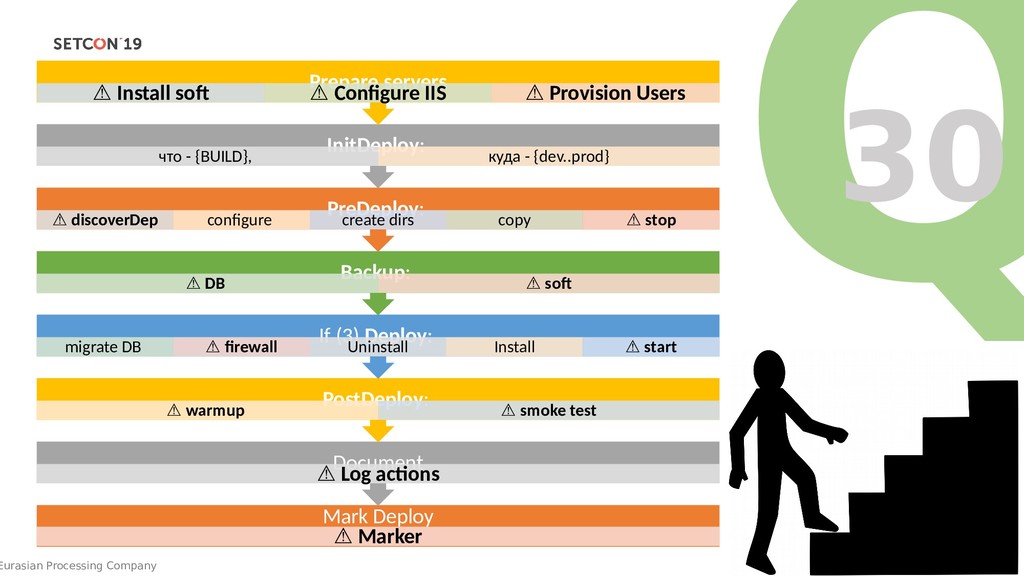 ⚠ Log actions PostDeploy: ⚠ warmup ⚠ smoke test If (3) Deploy: migrate DB ⚠ firewall Uninstall Install ⚠ start Backup: ⚠ DB ⚠ soft PreDeploy: ⚠ discoverDep configure create dirs copy ⚠ stop InitDeploy: что - {BUILD},BUILD}, куда - {BUILD},dev..prod} Prepare servers ⚠ Install soft ⚠ Configure IIS ⚠ Provision Users