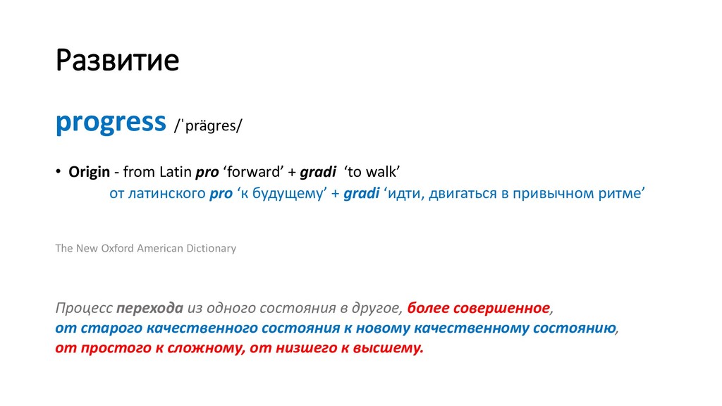 + gradi ‘to walk’ от латинского pro ‘к будущему’ + gradi ‘идти, двигаться в привычном ритме’ The New Oxford American Dictionary Процесс перехода из одного состояния в другое, более совершенное, от старого качественного состояния к новому качественному состоянию, от простого к сложному, от низшего к высшему.