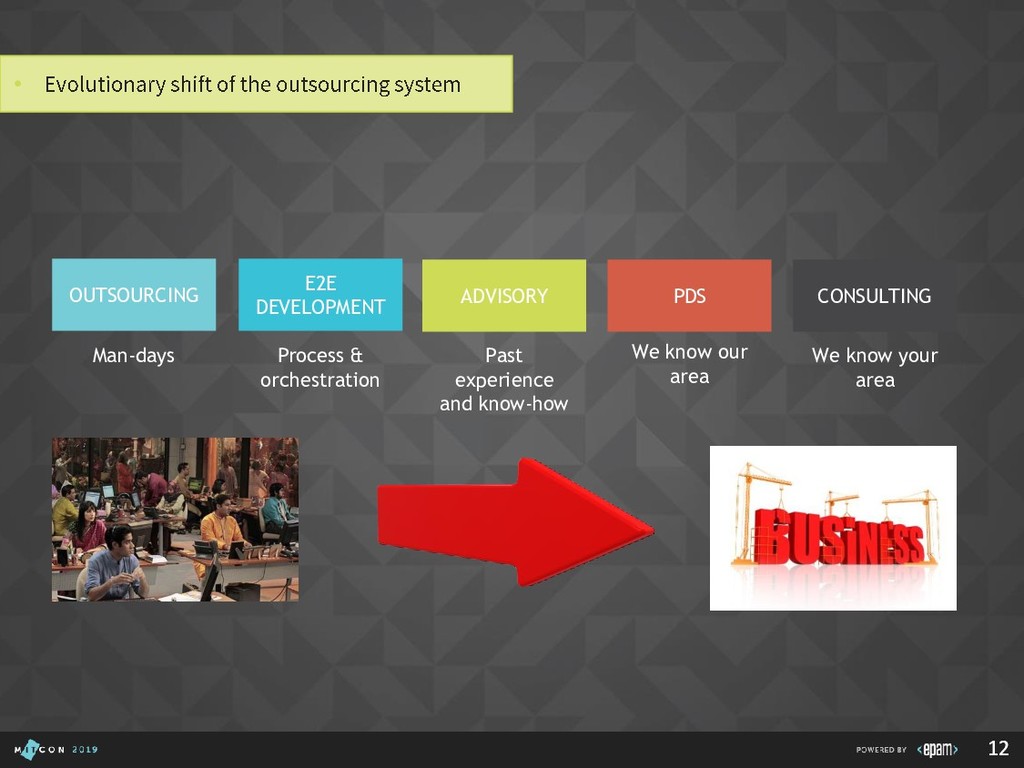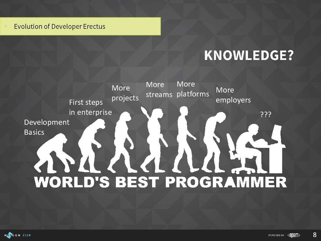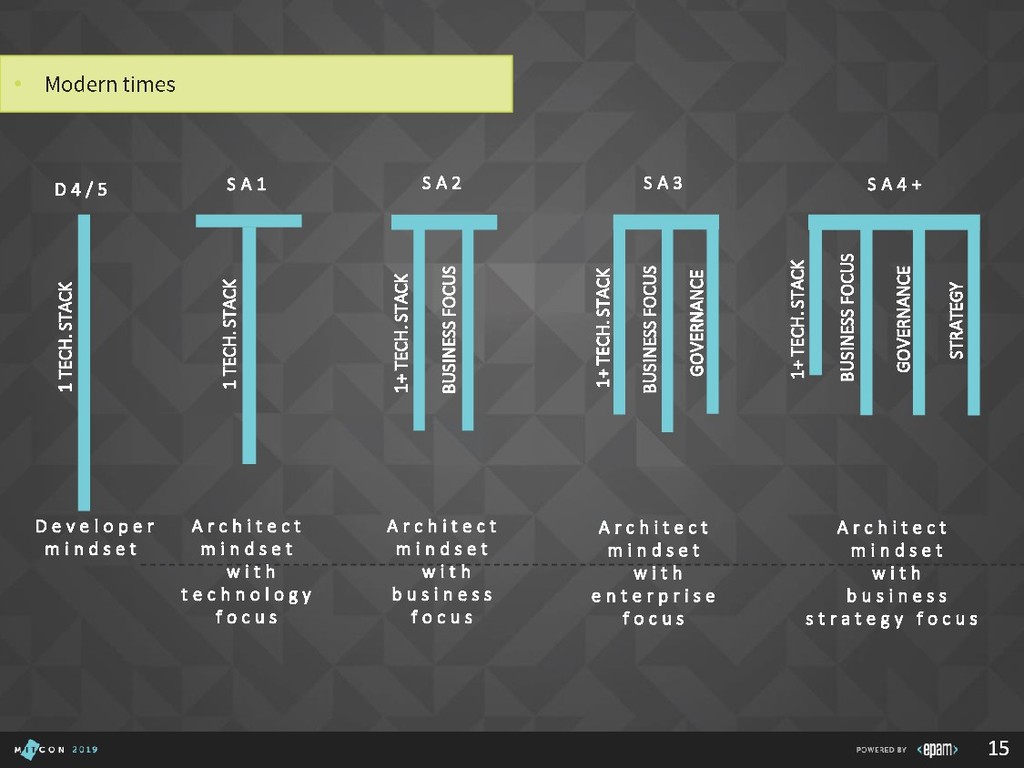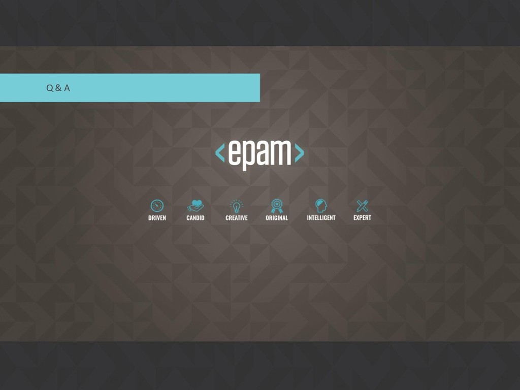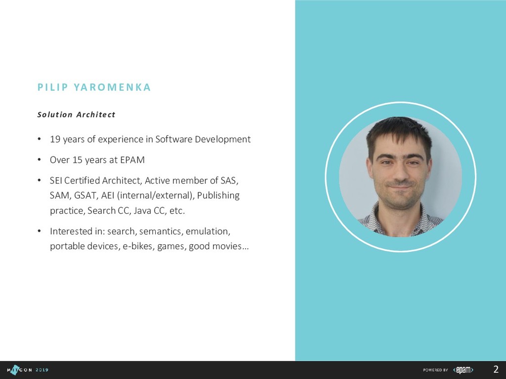 Over 15 years at EPAM • SEI Certified Architect, Active member of SAS, SAM, GSAT, AEI (internal/external), Publishing practice, Search CC, Java CC, etc. • Interested in: search, semantics, emulation, portable devices, e-bikes, games, good movies… P I L I P YA R O M E N K A Solution Architect