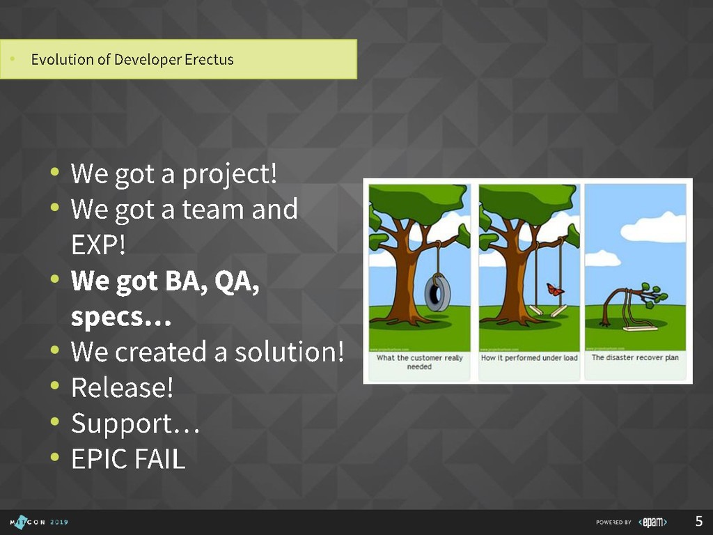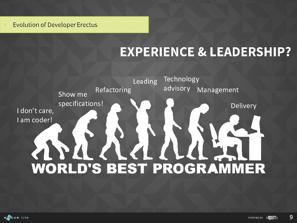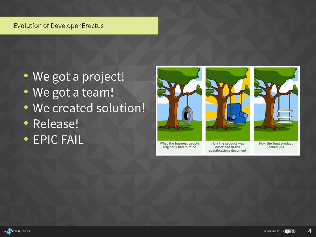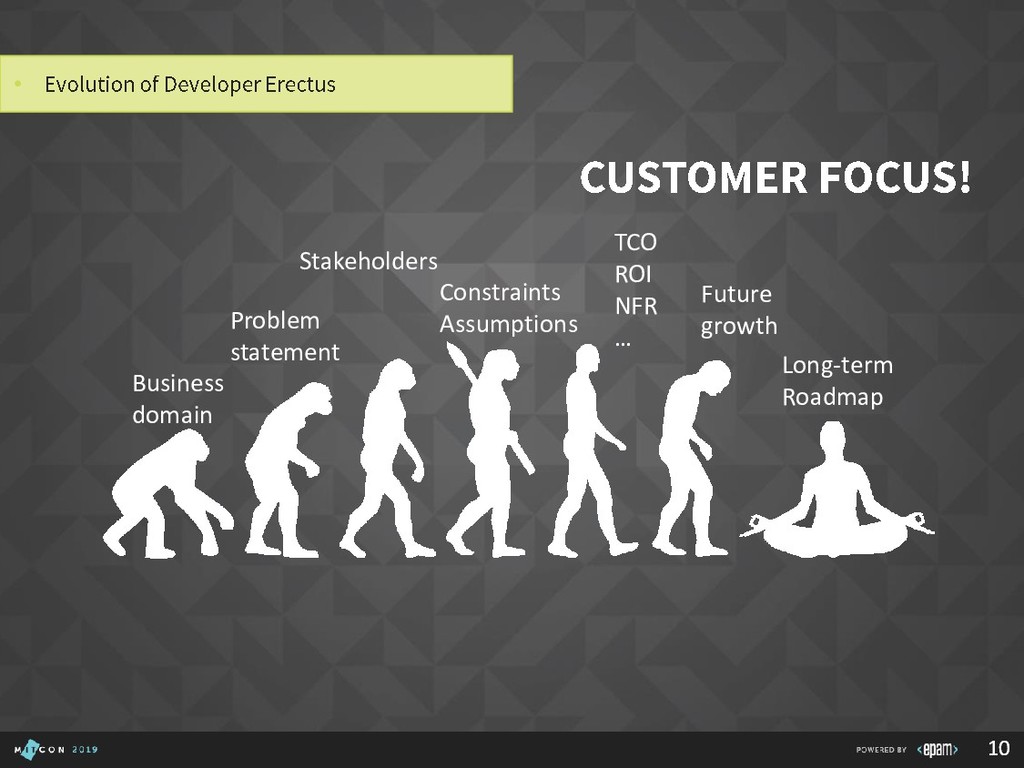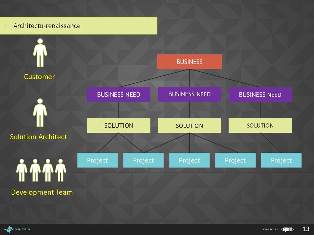 Over 15 years at EPAM • SEI Certified Architect, Active member of SAS, SAM, GSAT, AEI (internal/external), Publishing practice, Search CC, Java CC, etc. • Interested in: search, semantics, emulation, portable devices, e-bikes, games, good movies… P I L I P YA R O M E N K A Solution Architect