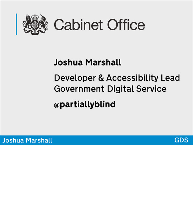 full-time Accessibility guy. Advocate across GDS, wider govt, British Gov representitive w/ other govs. Freelance developer. Started on Alpha in April 2011 “for six weeks”. Still here. Worked on everything from Publishing tools, UI, every tool and service, guidelines.