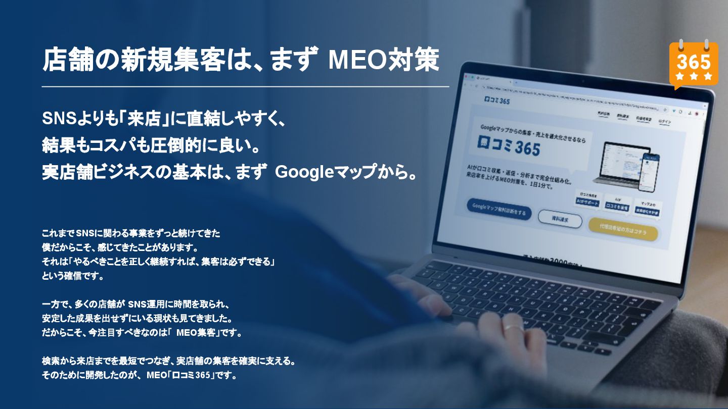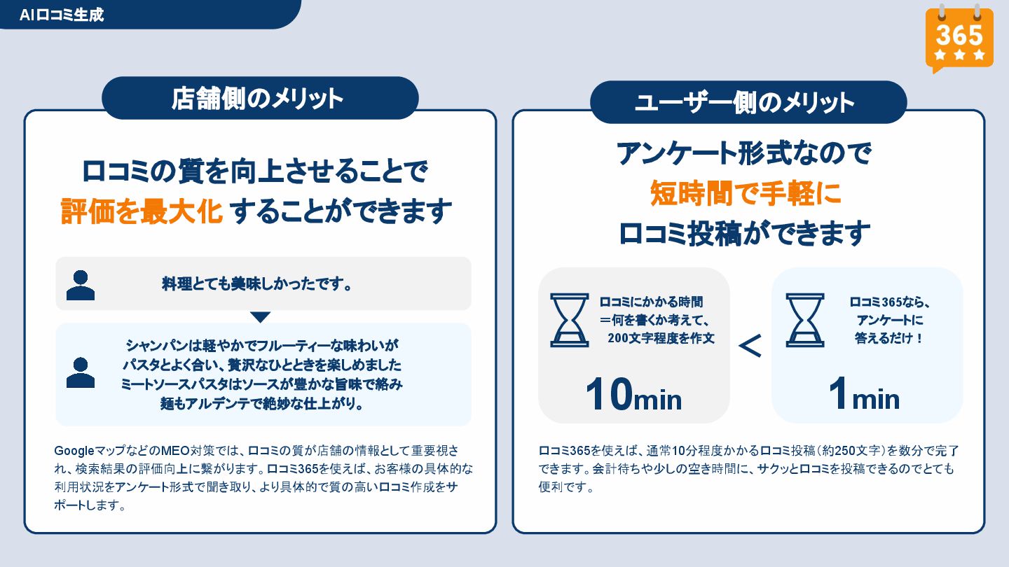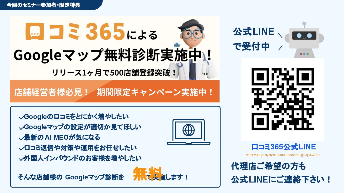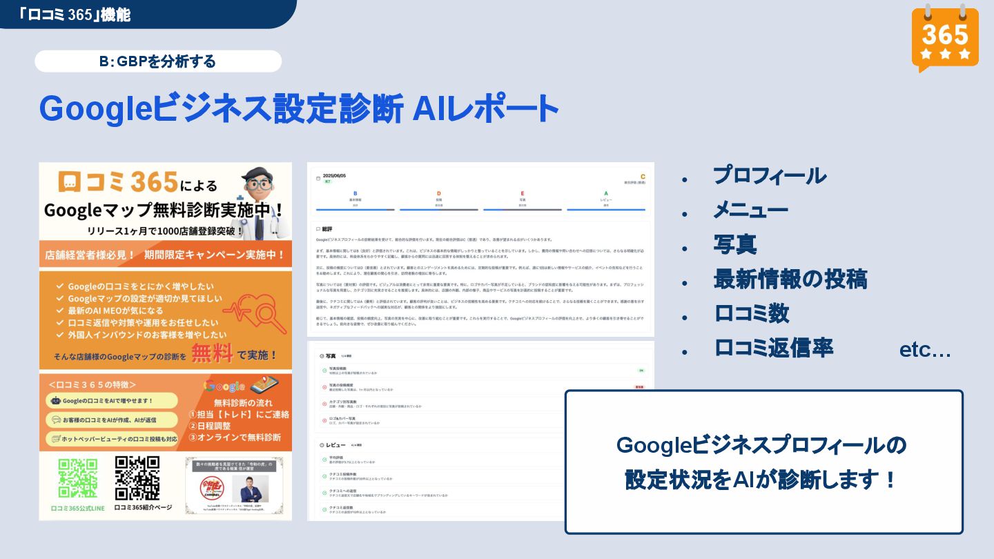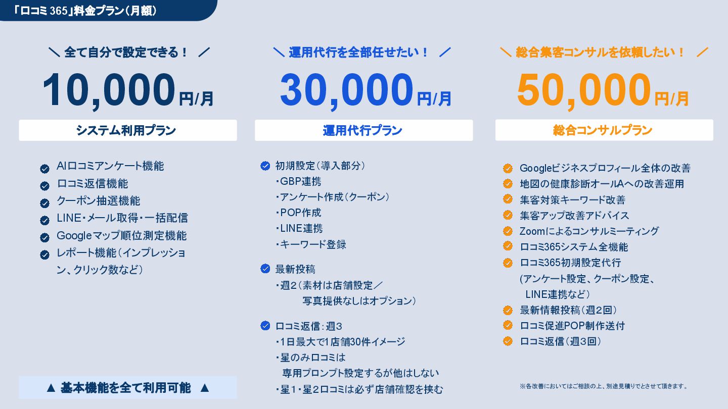 50,000円/月 総合コンサルプラン \ 全て自分で設定できる! / 10,000円/月 システム利用プラン AI口コミアンケート機能 口コミ返信機能 クーポン抽選機能 LINE・メール取得・一括配信 Googleマップ順位測定機能 レポート機能(インプレッショ ン、クリック数など) 初期設定(導入部分) ・GBP連携 ・アンケート作成(クーポン) ・POP作成 ・LINE連携 ・キーワード登録 最新投稿 ・週2(素材は店舗設定/ 写真提供なしはオプション) 口コミ返信:週3 ・1日最大で1店舗30件イメージ ・星のみ口コミは 専用プロンプト設定するが他はしない ・星1・星2口コミは必ず店舗確認を挟む ▲ 基本機能を全て利用可能 ▲ Googleビジネスプロフィール全体の改善 地図の健康診断オール Aへの改善運用 集客対策キーワード改善 集客アップ改善アドバイス Zoomによるコンサルミーティング 口コミ365システム全機能 口コミ365初期設定代行 (アンケート設定、クーポン設定、 LINE連携など) 最新情報投稿(週2回) 口コミ促進POP制作送付 口コミ返信(週3回) ※各改善においてはご相談の上、別途見積りでとさせて頂きます。