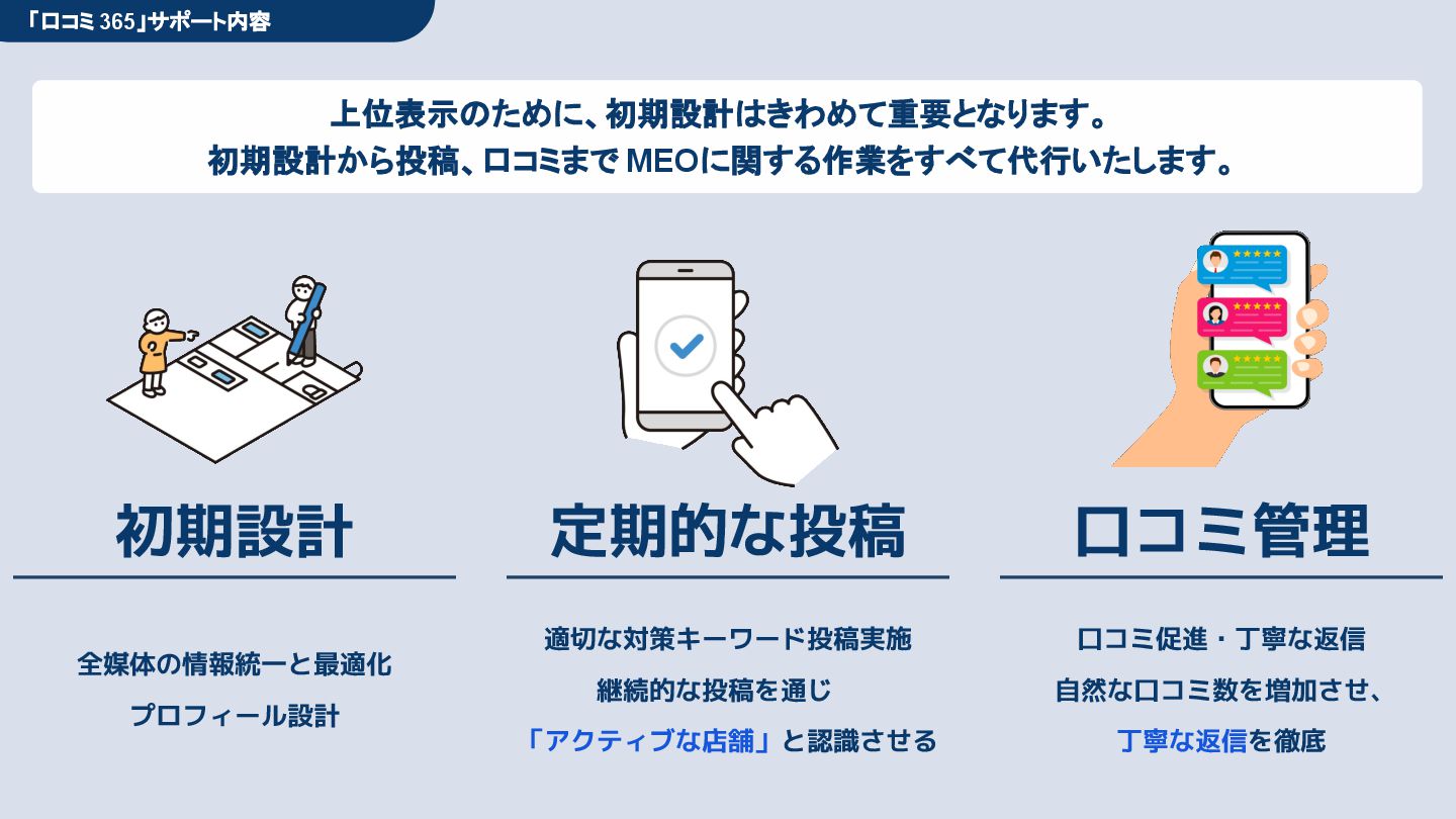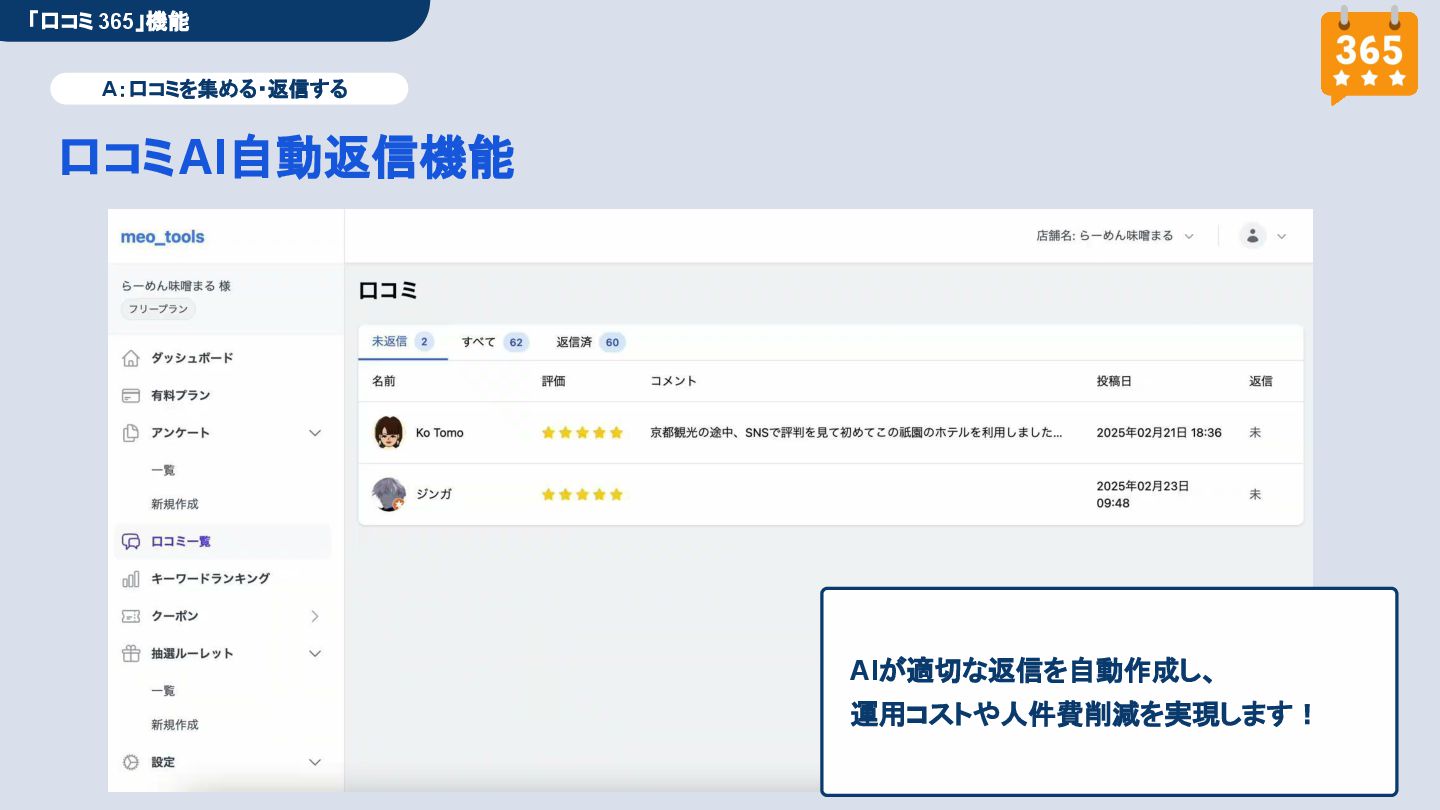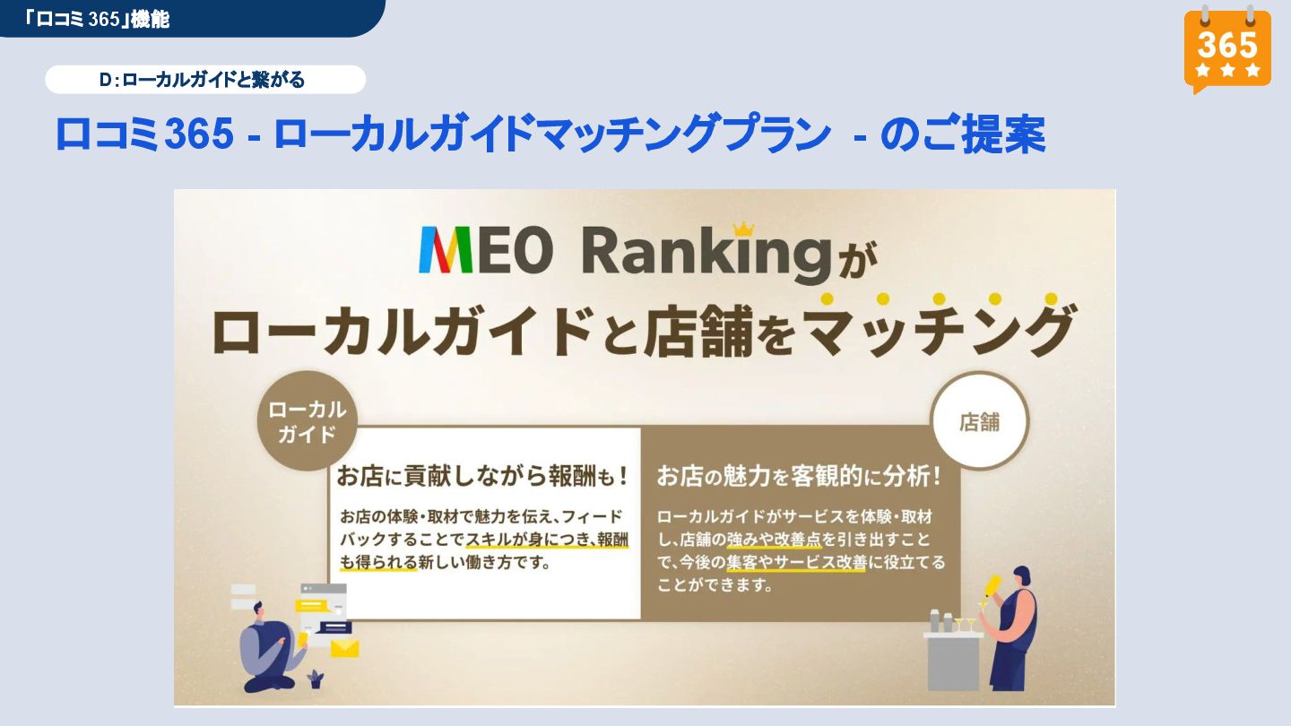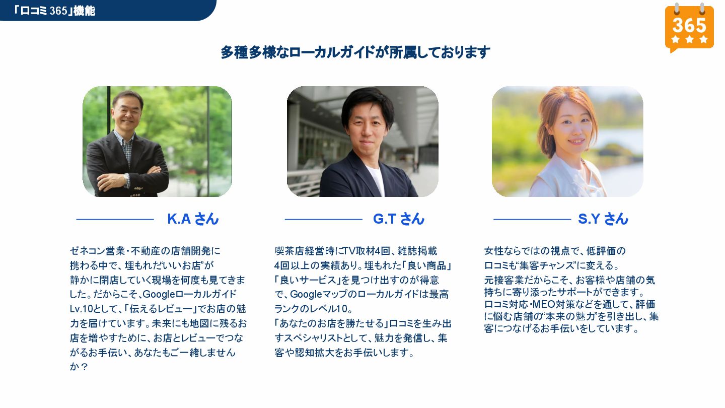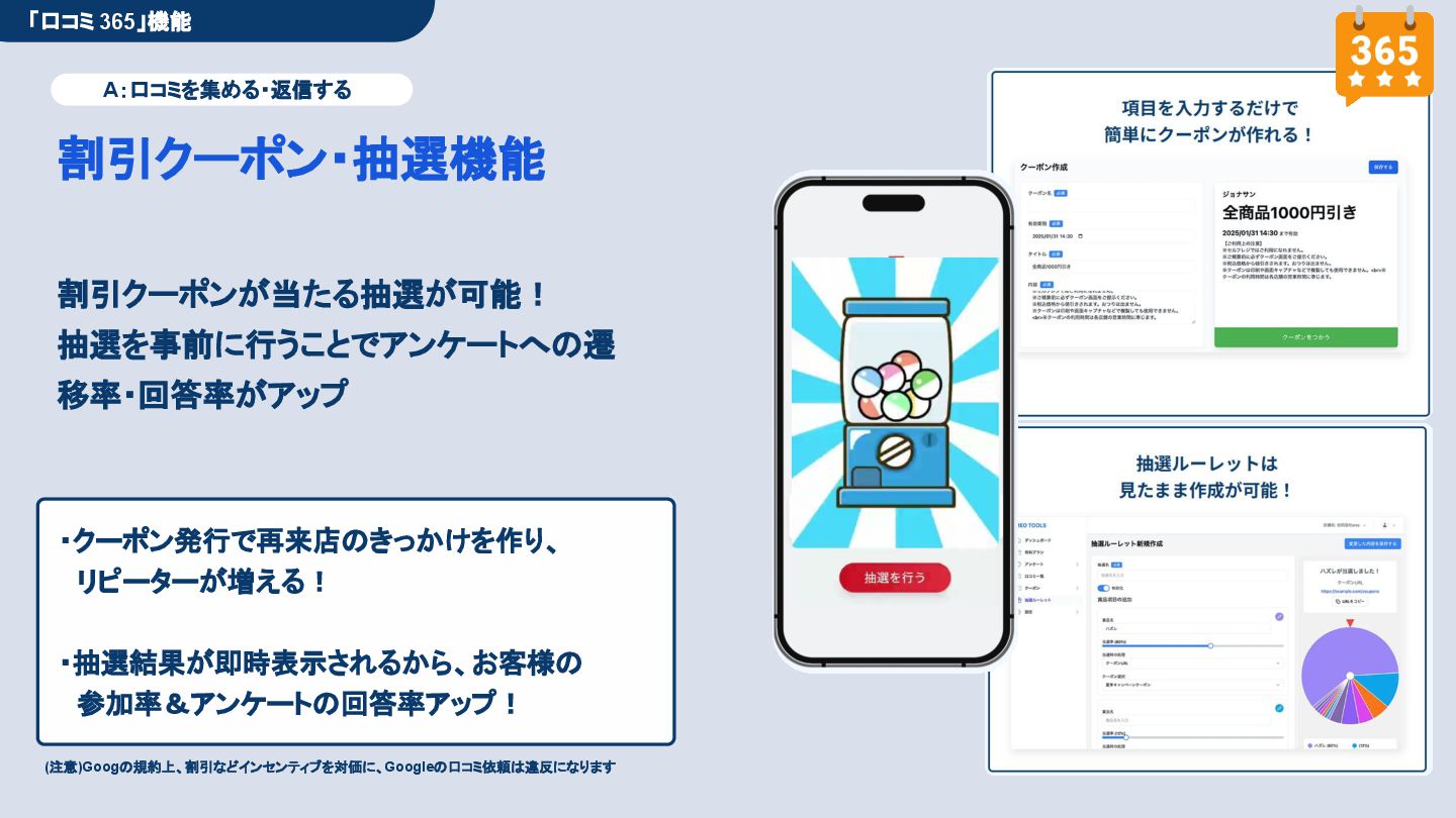 50,000円/月 総合コンサルプラン \ 全て自分で設定できる! / 10,000円/月 システム利用プラン AI口コミアンケート機能 口コミ返信機能 クーポン抽選機能 LINE・メール取得・一括配信 Googleマップ順位測定機能 レポート機能(インプレッショ ン、クリック数など) 初期設定(導入部分) ・GBP連携 ・アンケート作成(クーポン) ・POP作成 ・LINE連携 ・キーワード登録 最新投稿 ・週2(素材は店舗設定/ 写真提供なしはオプション) 口コミ返信:週3 ・1日最大で1店舗30件イメージ ・星のみ口コミは 専用プロンプト設定するが他はしない ・星1・星2口コミは必ず店舗確認を挟む ▲ 基本機能を全て利用可能 ▲ Googleビジネスプロフィール全体の改善 地図の健康診断オール Aへの改善運用 集客対策キーワード改善 集客アップ改善アドバイス Zoomによるコンサルミーティング 口コミ365システム全機能 口コミ365初期設定代行 (アンケート設定、クーポン設定、 LINE連携など) 最新情報投稿(週2回) 口コミ促進POP制作送付 口コミ返信(週3回) ※各改善においてはご相談の上、別途見積りでとさせて頂きます。