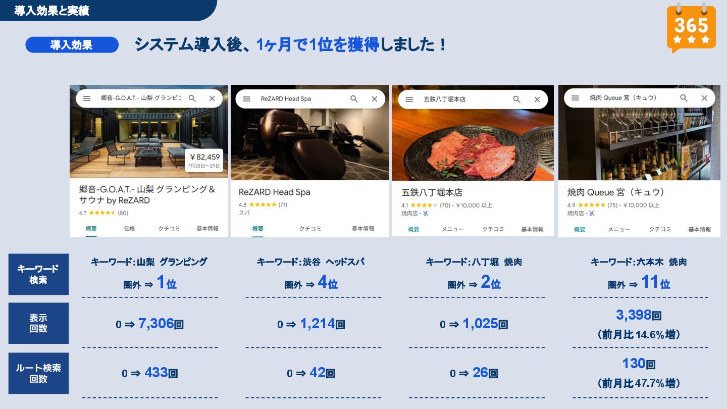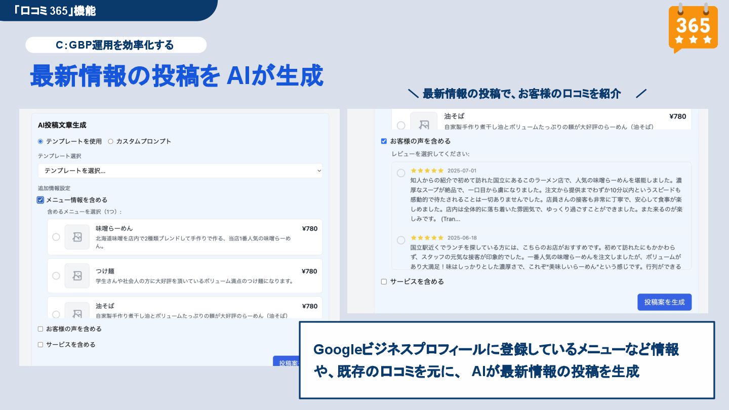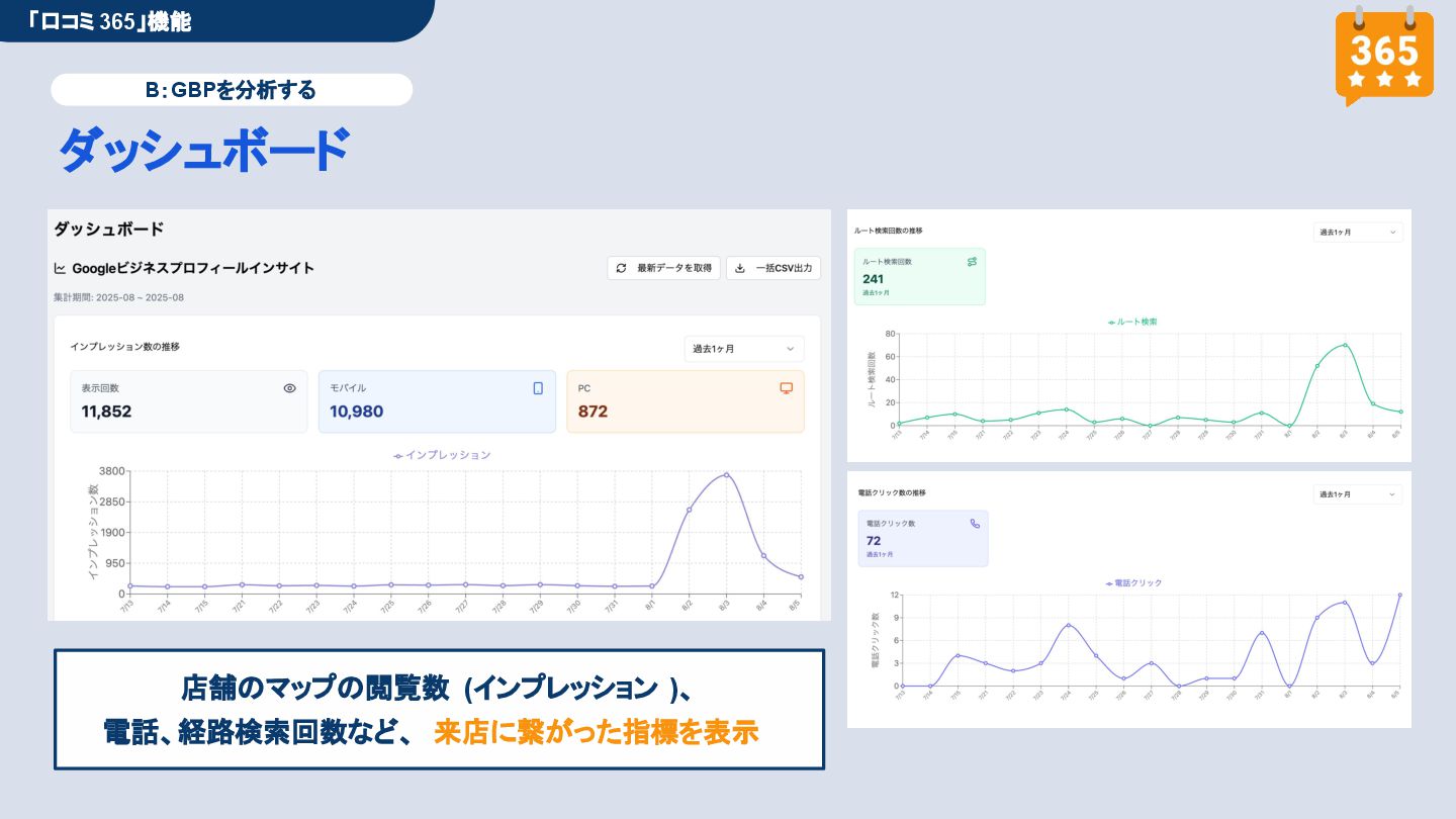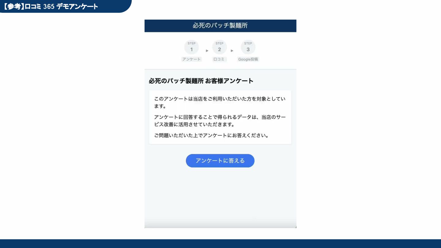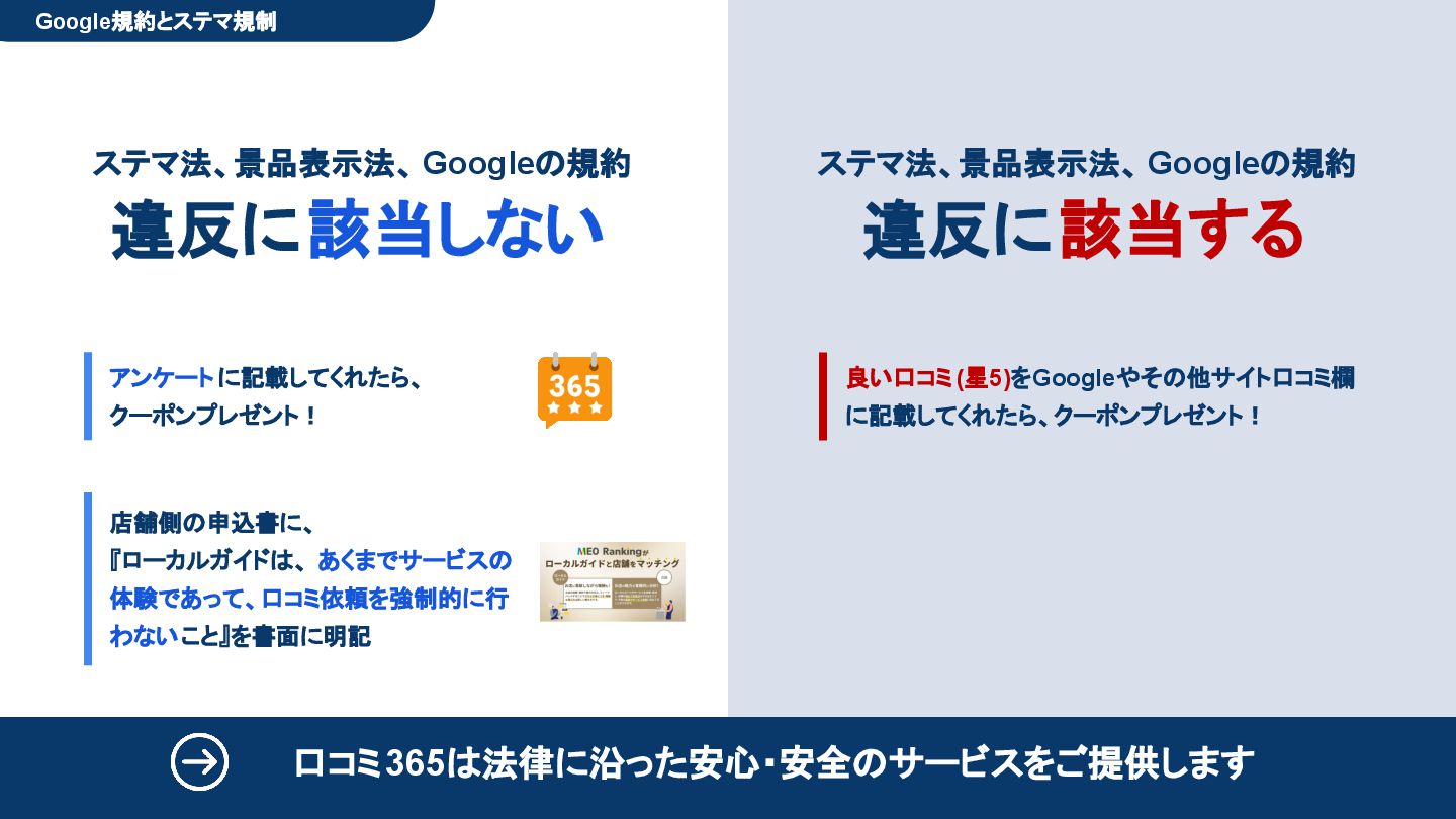 50,000円/月 総合コンサルプラン \ 全て自分で設定できる! / 10,000円/月 システム利用プラン AI口コミアンケート機能 口コミ返信機能 クーポン抽選機能 LINE・メール取得・一括配信 Googleマップ順位測定機能 レポート機能(インプレッショ ン、クリック数など) 初期設定(導入部分) ・GBP連携 ・アンケート作成(クーポン) ・POP作成 ・LINE連携 ・キーワード登録 最新投稿 ・週2(素材は店舗設定/ 写真提供なしはオプション) 口コミ返信:週3 ・1日最大で1店舗30件イメージ ・星のみ口コミは 専用プロンプト設定するが他はしない ・星1・星2口コミは必ず店舗確認を挟む ▲ 基本機能を全て利用可能 ▲ Googleビジネスプロフィール全体の改善 地図の健康診断オール Aへの改善運用 集客対策キーワード改善 集客アップ改善アドバイス Zoomによるコンサルミーティング 口コミ365システム全機能 口コミ365初期設定代行 (アンケート設定、クーポン設定、 LINE連携など) 最新情報投稿(週2回) 口コミ促進POP制作送付 口コミ返信(週3回) ※各改善においてはご相談の上、別途見積りでとさせて頂きます。