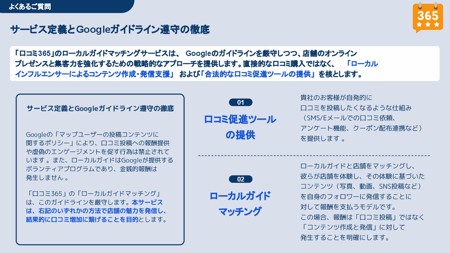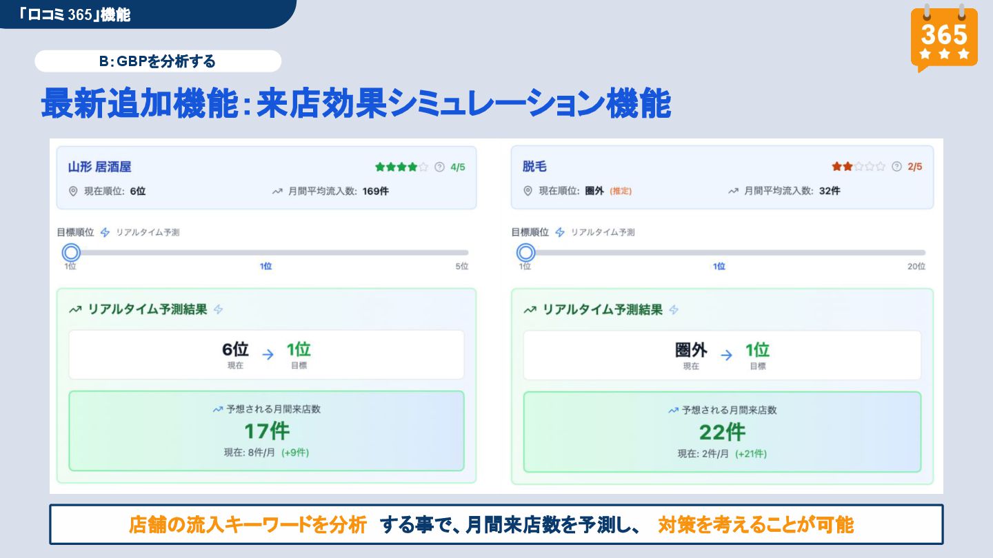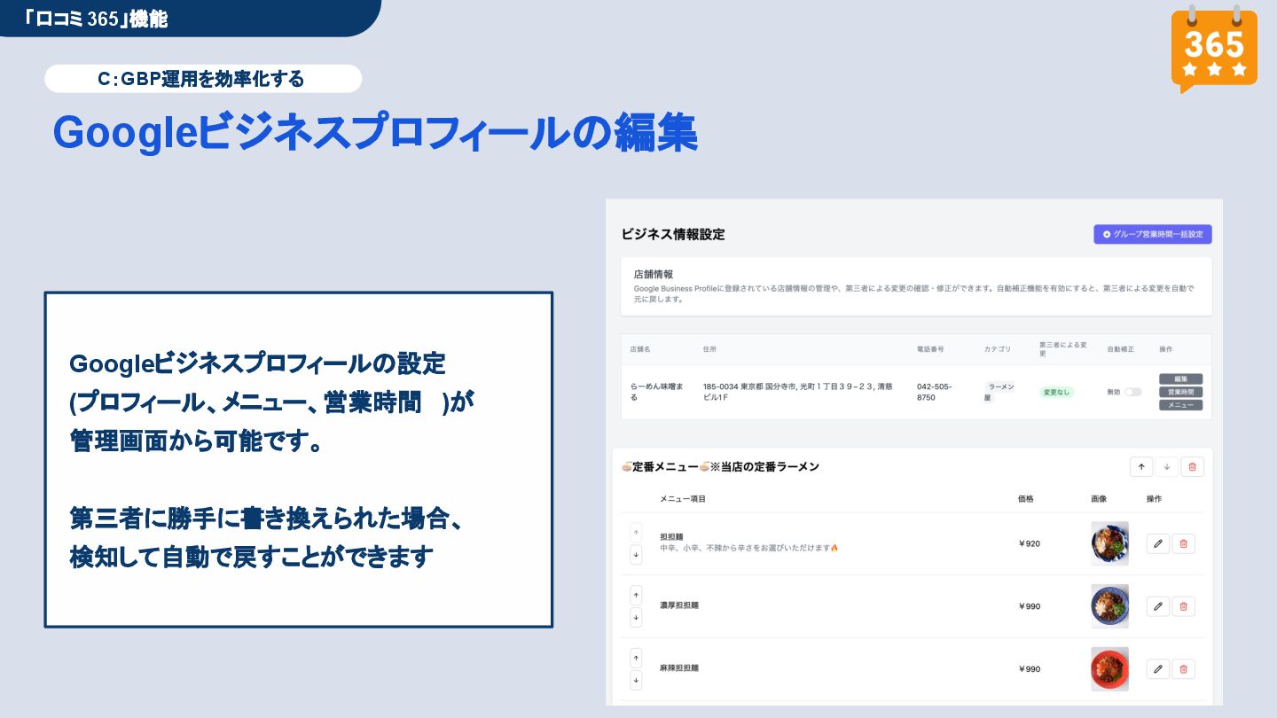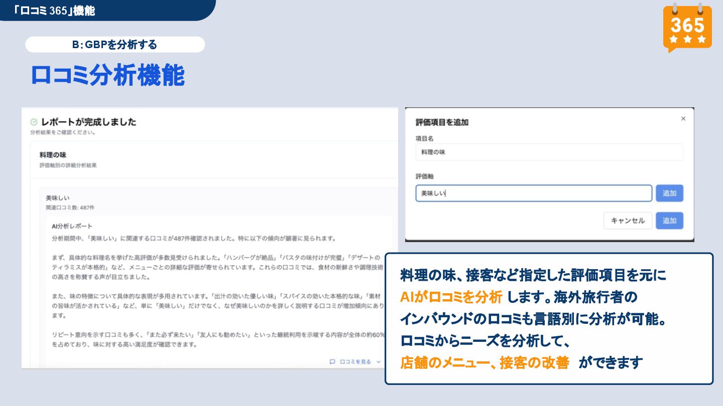 50,000円/月 総合コンサルプラン \ 全て自分で設定できる! / 10,000円/月 システム利用プラン AI口コミアンケート機能 口コミ返信機能 クーポン抽選機能 LINE・メール取得・一括配信 Googleマップ順位測定機能 レポート機能(インプレッショ ン、クリック数など) 初期設定(導入部分) ・GBP連携 ・アンケート作成(クーポン) ・POP作成 ・LINE連携 ・キーワード登録 最新投稿 ・週2(素材は店舗設定/ 写真提供なしはオプション) 口コミ返信:週3 ・1日最大で1店舗30件イメージ ・星のみ口コミは 専用プロンプト設定するが他はしない ・星1・星2口コミは必ず店舗確認を挟む ▲ 基本機能を全て利用可能 ▲ Googleビジネスプロフィール全体の改善 地図の健康診断オール Aへの改善運用 集客対策キーワード改善 集客アップ改善アドバイス Zoomによるコンサルミーティング 口コミ365システム全機能 口コミ365初期設定代行 (アンケート設定、クーポン設定、 LINE連携など) 最新情報投稿(週2回) 口コミ促進POP制作送付 口コミ返信(週3回) ※各改善においてはご相談の上、別途見積りでとさせて頂きます。