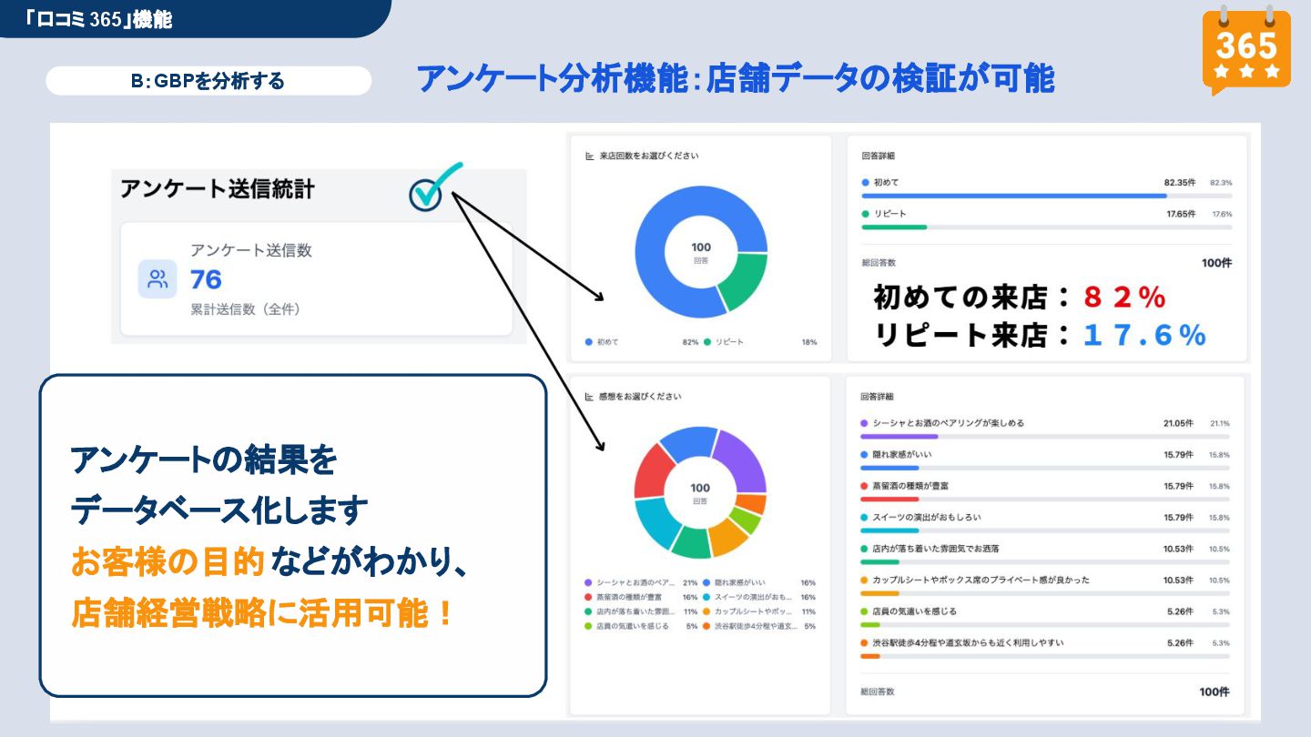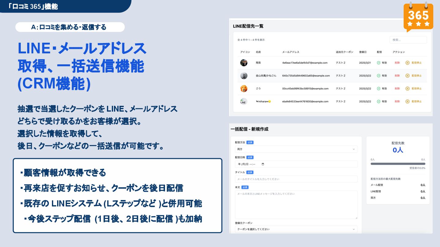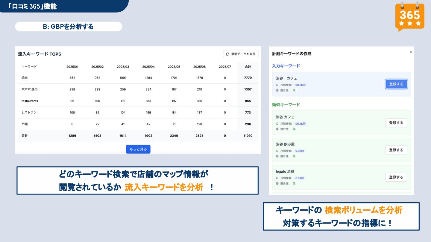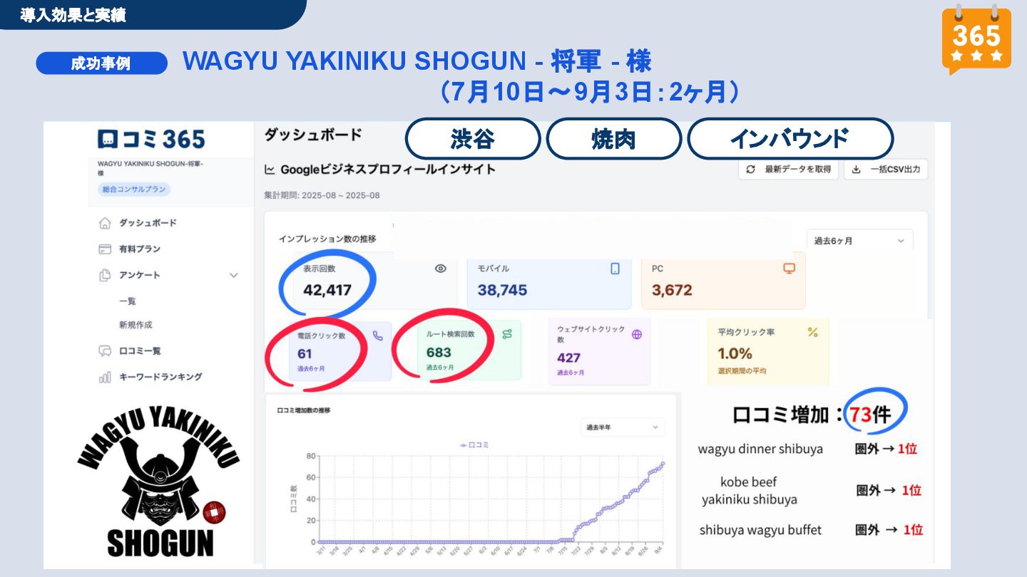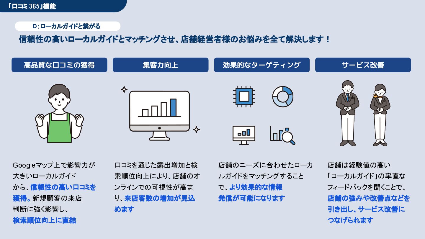 50,000円/月 総合コンサルプラン \ 全て自分で設定できる! / 10,000円/月 システム利用プラン AI口コミアンケート機能 口コミ返信機能 クーポン抽選機能 LINE・メール取得・一括配信 Googleマップ順位測定機能 レポート機能(インプレッショ ン、クリック数など) 初期設定(導入部分) ・GBP連携 ・アンケート作成(クーポン) ・POP作成 ・LINE連携 ・キーワード登録 最新投稿 ・週2(素材は店舗設定/ 写真提供なしはオプション) 口コミ返信:週3 ・1日最大で1店舗30件イメージ ・星のみ口コミは 専用プロンプト設定するが他はしない ・星1・星2口コミは必ず店舗確認を挟む ▲ 基本機能を全て利用可能 ▲ Googleビジネスプロフィール全体の改善 地図の健康診断オール Aへの改善運用 集客対策キーワード改善 集客アップ改善アドバイス Zoomによるコンサルミーティング 口コミ365システム全機能 口コミ365初期設定代行 (アンケート設定、クーポン設定、 LINE連携など) 最新情報投稿(週2回) 口コミ促進POP制作送付 口コミ返信(週3回) ※各改善においてはご相談の上、別途見積りでとさせて頂きます。