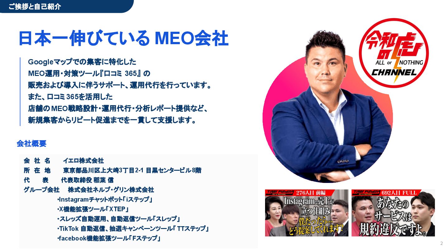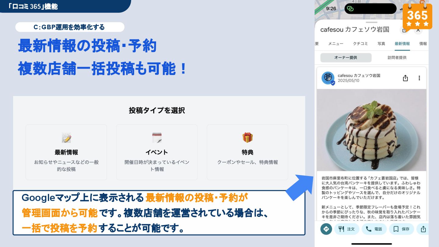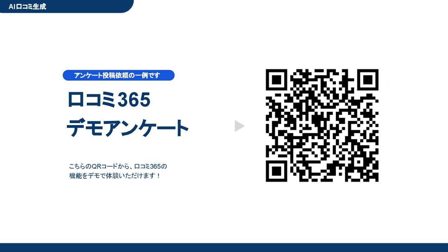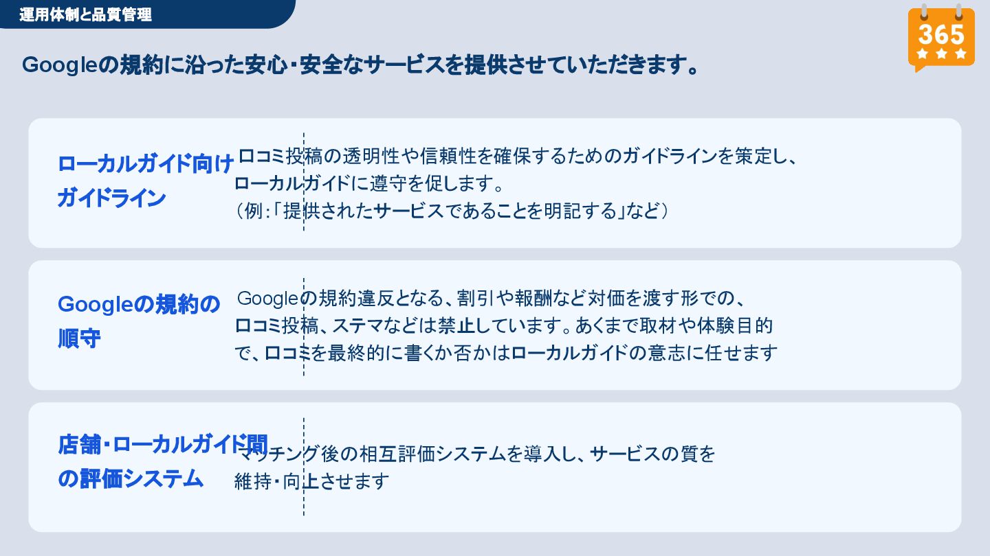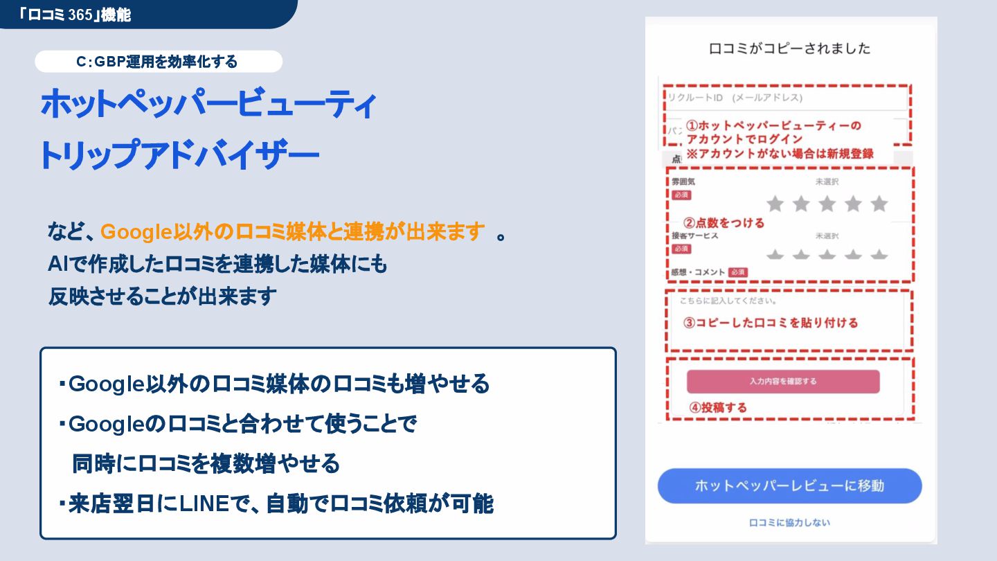 50,000円/月 総合コンサルプラン \ 全て自分で設定できる! / 10,000円/月 システム利用プラン AI口コミアンケート機能 口コミ返信機能 クーポン抽選機能 LINE・メール取得・一括配信 Googleマップ順位測定機能 レポート機能(インプレッショ ン、クリック数など) 初期設定(導入部分) ・GBP連携 ・アンケート作成(クーポン) ・POP作成 ・LINE連携 ・キーワード登録 最新投稿 ・週2(素材は店舗設定/ 写真提供なしはオプション) 口コミ返信:週3 ・1日最大で1店舗30件イメージ ・星のみ口コミは 専用プロンプト設定するが他はしない ・星1・星2口コミは必ず店舗確認を挟む ▲ 基本機能を全て利用可能 ▲ Googleビジネスプロフィール全体の改善 地図の健康診断オール Aへの改善運用 集客対策キーワード改善 集客アップ改善アドバイス Zoomによるコンサルミーティング 口コミ365システム全機能 口コミ365初期設定代行 (アンケート設定、クーポン設定、 LINE連携など) 最新情報投稿(週2回) 口コミ促進POP制作送付 口コミ返信(週3回) ※各改善においてはご相談の上、別途見積りでとさせて頂きます。