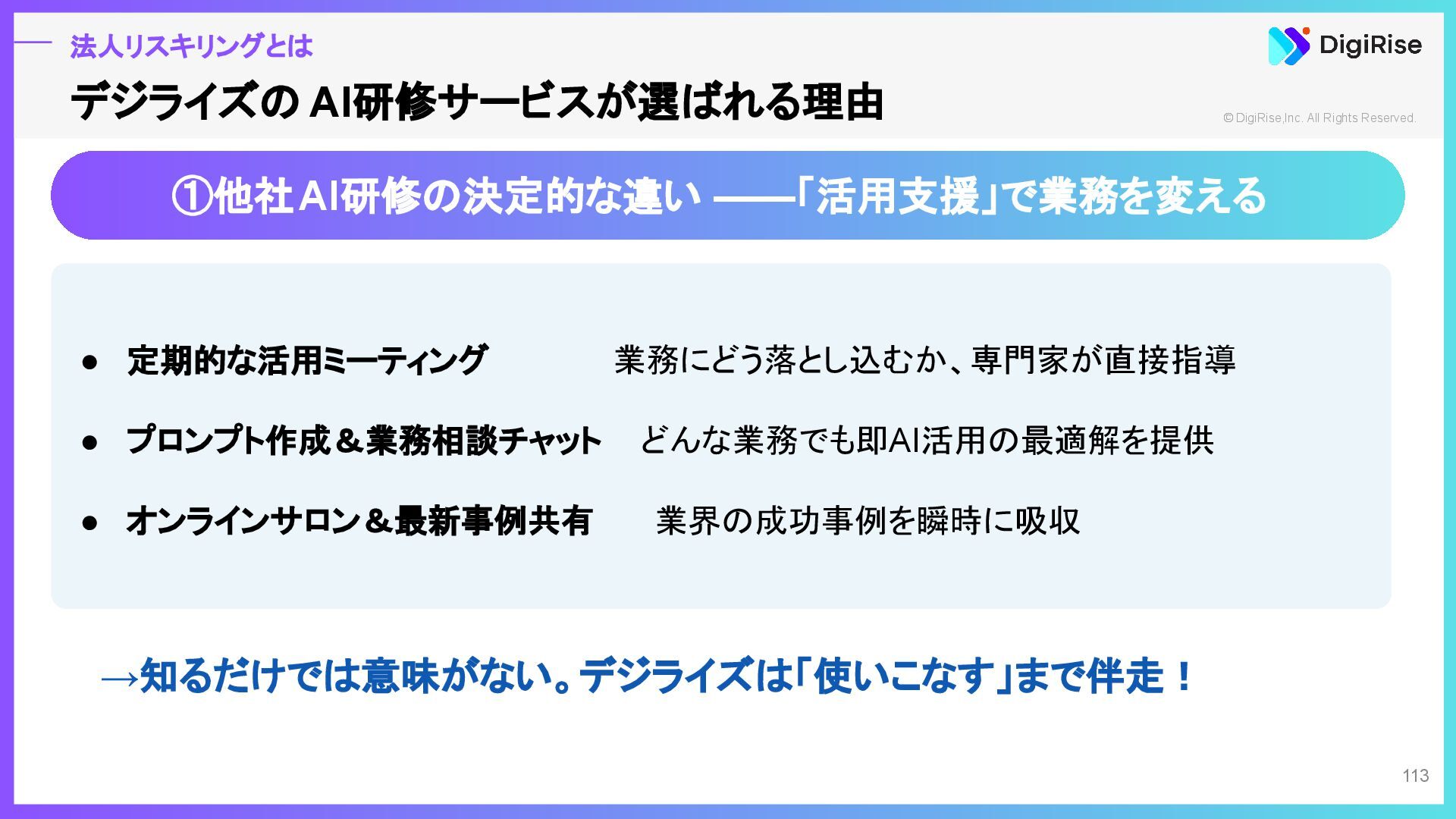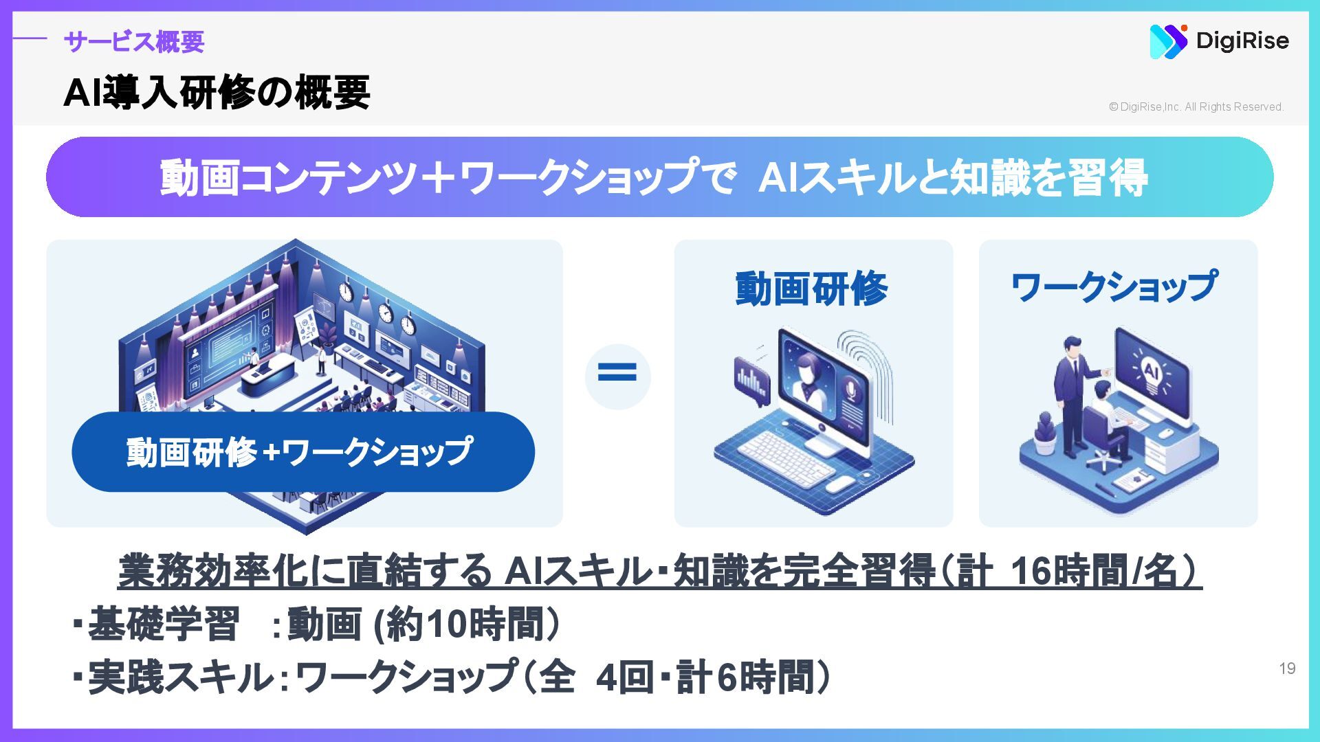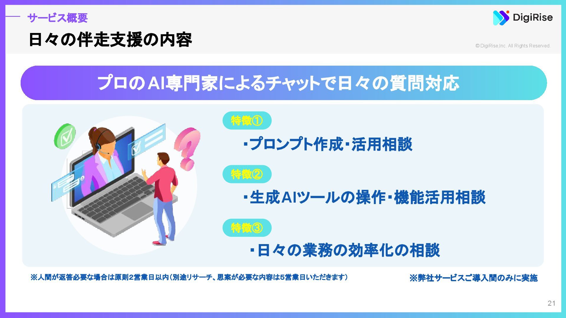 MTG ・業務把握、目標・目的のすり合わせ、動機付け 動画:学習管理サポート ・動画コンテンツとワークショップを完遂するための学習管理 ・受講者のテスト点数、受講状況をレポートで提出 4 研修:中間報告会・完了報告会 ・研修受講中から業務効率化の進捗を会社に報告 ・完了後に研修効果と社内促進ガイドラインをレポート support 6 AI活用MTG(月1回×2ヶ月) ・既存業務→生成AI作業への代替支援 ・業務活用・定着サポートMTG support 7 チャットサポート ・プロンプト作成、活用相談 ・日々の業務効率化の相談 support 8 オンラインサロン ・毎月1回、チャエンが皆様に最新情報をお届け ・他社活用事例、最新AI活用法について support 5 フォローアップ MTG ・社内業務改革のロードマップ策定支援 ・社内AI活用計画の策定 2 生成AIツール説明会 ・最新AIツールのご紹介 ・基本的な使い方、機能、管理面の説明 support support support support 4 サービス概要