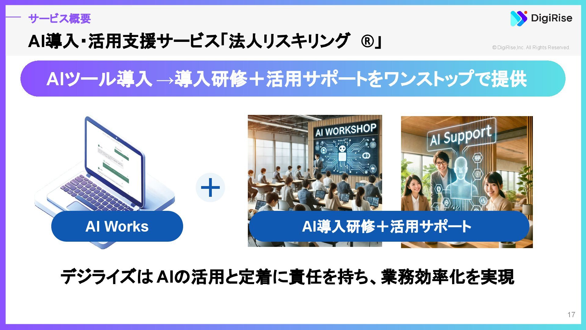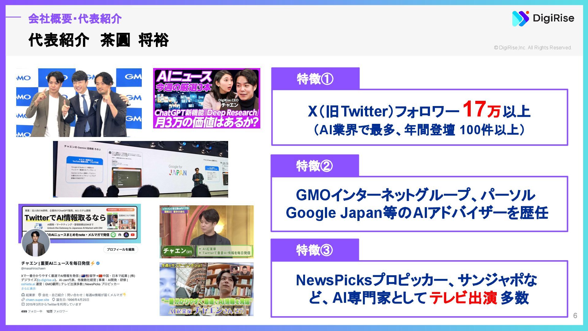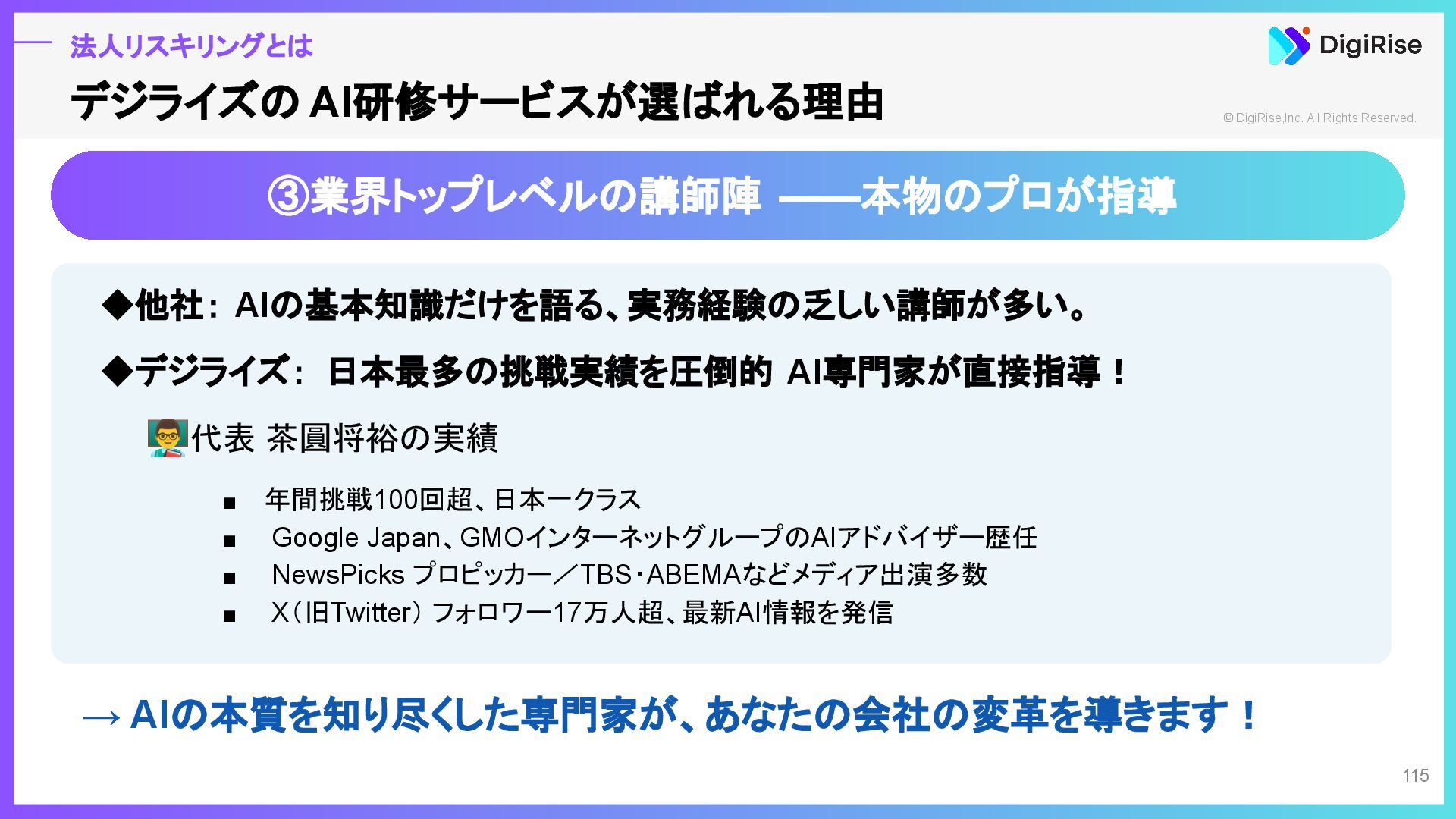 MTG ・業務把握、目標・目的のすり合わせ、動機付け 動画:学習管理サポート ・動画コンテンツとワークショップを完遂するための学習管理 ・受講者のテスト点数、受講状況をレポートで提出 4 研修:中間報告会・完了報告会 ・研修受講中から業務効率化の進捗を会社に報告 ・完了後に研修効果と社内促進ガイドラインをレポート support 6 AI活用MTG(月1回×2ヶ月) ・既存業務→生成AI作業への代替支援 ・業務活用・定着サポートMTG support 7 チャットサポート ・プロンプト作成、活用相談 ・日々の業務効率化の相談 support 8 オンラインサロン ・毎月1回、チャエンが皆様に最新情報をお届け ・他社活用事例、最新AI活用法について support 5 フォローアップ MTG ・社内業務改革のロードマップ策定支援 ・社内AI活用計画の策定 2 生成AIツール説明会 ・最新AIツールのご紹介 ・基本的な使い方、機能、管理面の説明 support support support support 4 サービス概要