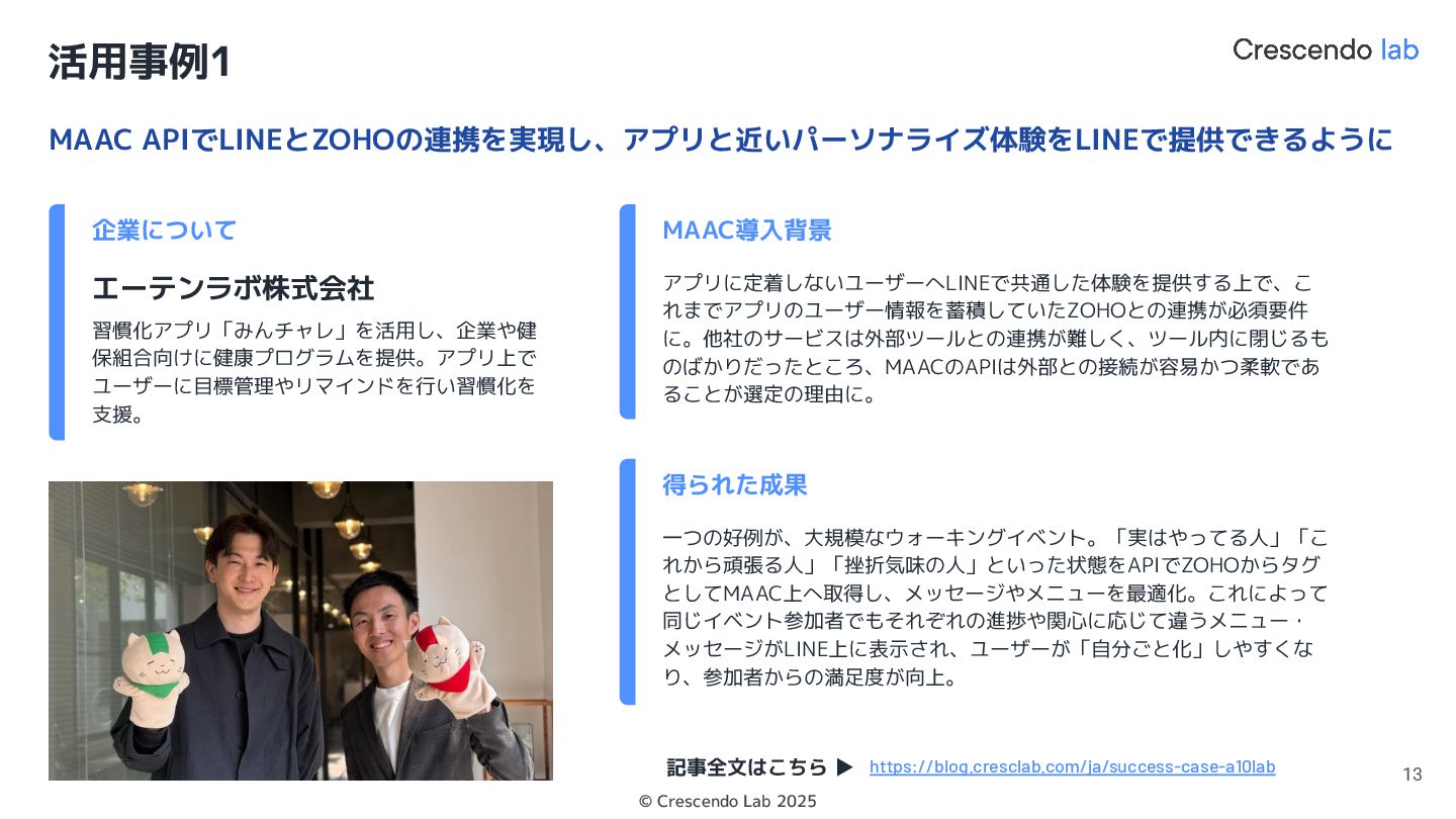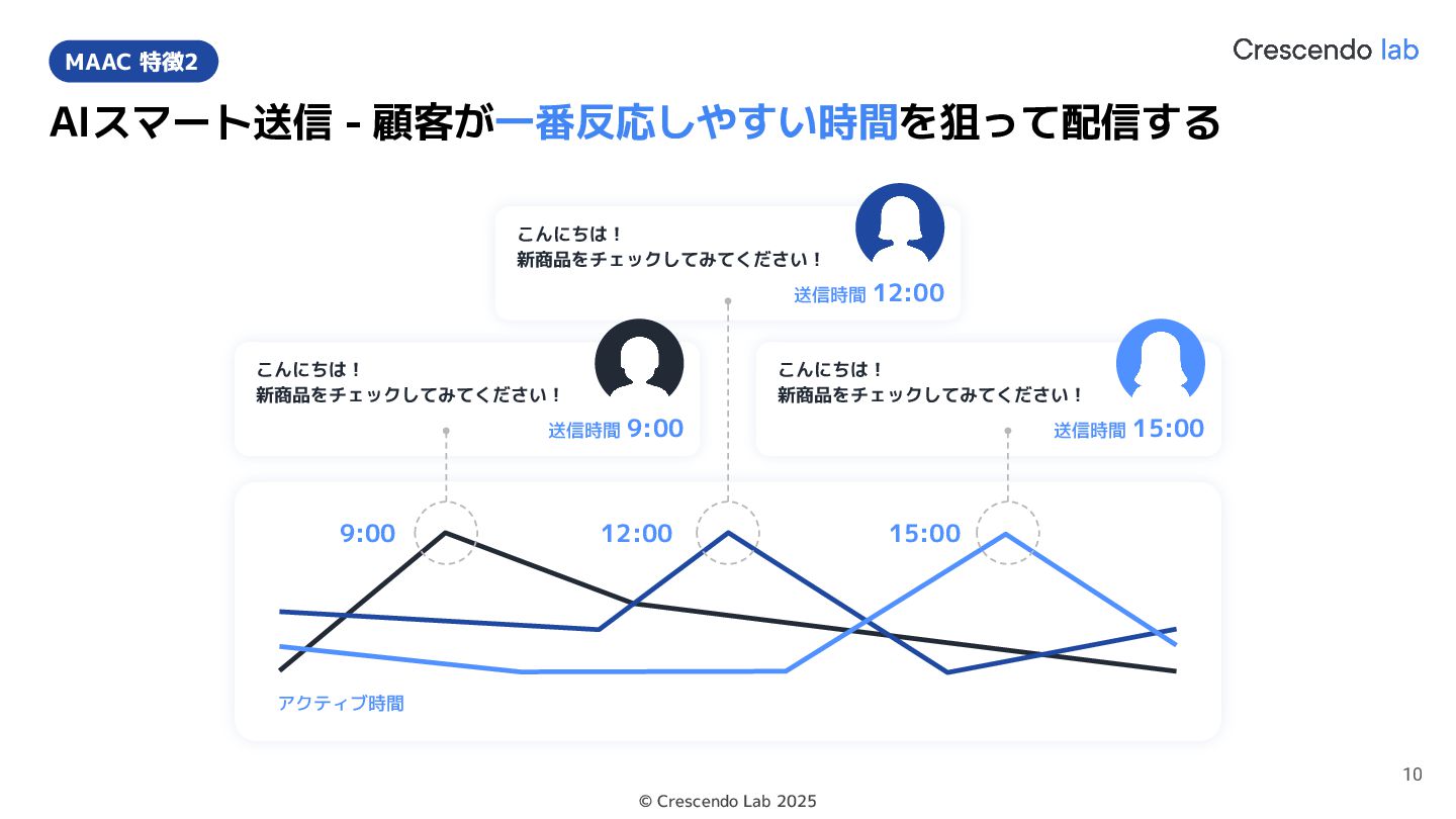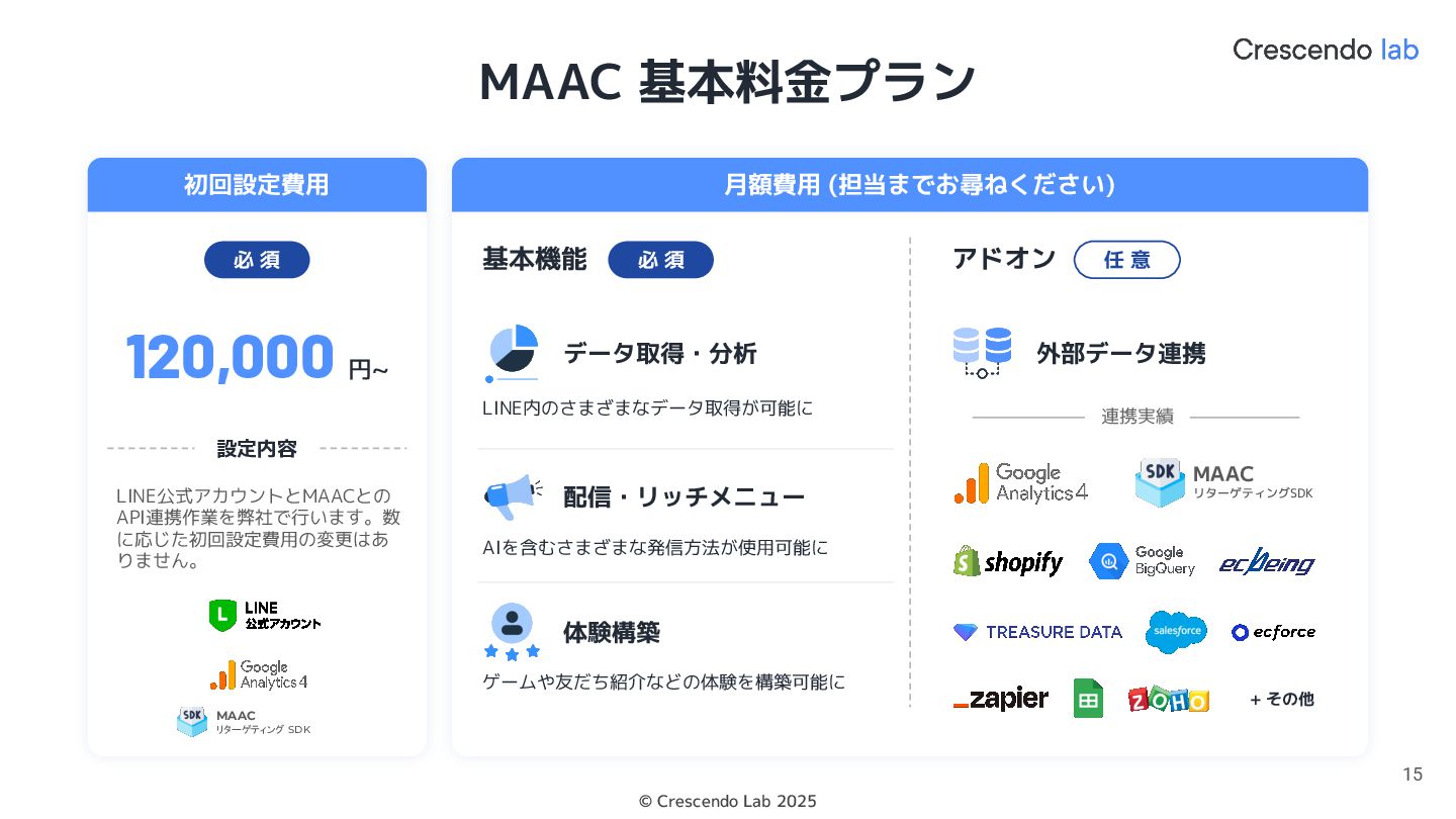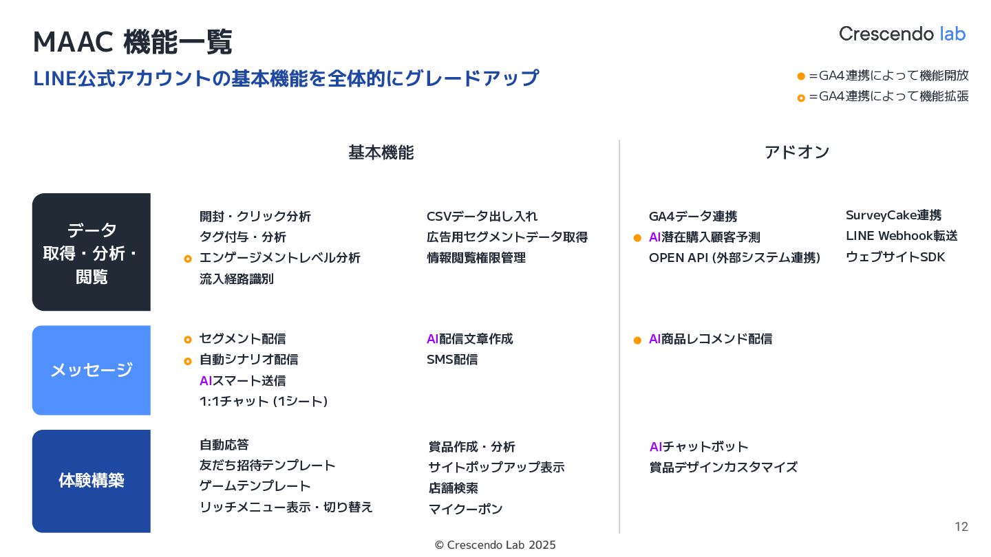 でデータのやりとりが可能に クレッシェンドラボ Open API シームレスなID連携方法の実装 双方向のプロフィール、ステータス情報の取 得、更新、削除 パラメータ差し込みメッセージ配信 LINEパフォーマンスレポートの取得 1 2 3 4 Messaging Analytics & Automation Cloud MAAC LINEUID 行動データ Behavioral data GA4からページ閲覧、カートイン、購入の3イ ベントをLINEUIDと紐付けて取得し、ユーザー の行動に基づいたセグメント作成、カゴ落ち配 信、レコメンド配信等が可能に MAAC リターゲティング SDK MAAC独自のSDKをウェブサイトに埋め込 むことでデータラグを無くしたカゴ落ち配 信が可能に。取得データ範囲を順次拡大中 LINEUID、アイコン、ユーザー 名、(Email)、開封、クリック、 流入経路、アンケート回答内容 など、基本的な情報を網羅 MAAC 特徴1 LINE外のデータをLINEユーザーIDに紐付けて取得/活用可能に LINE内取得可能データ