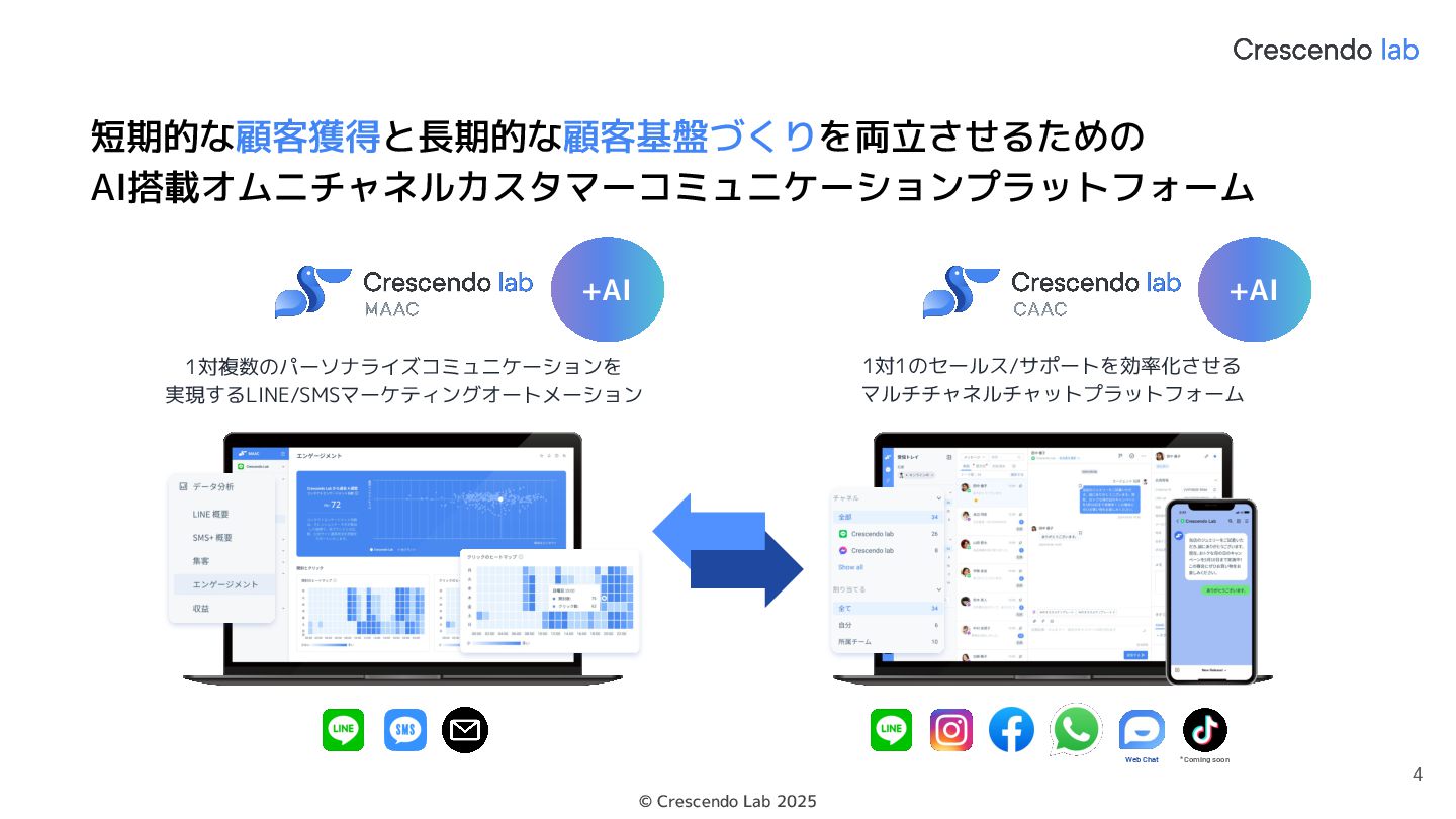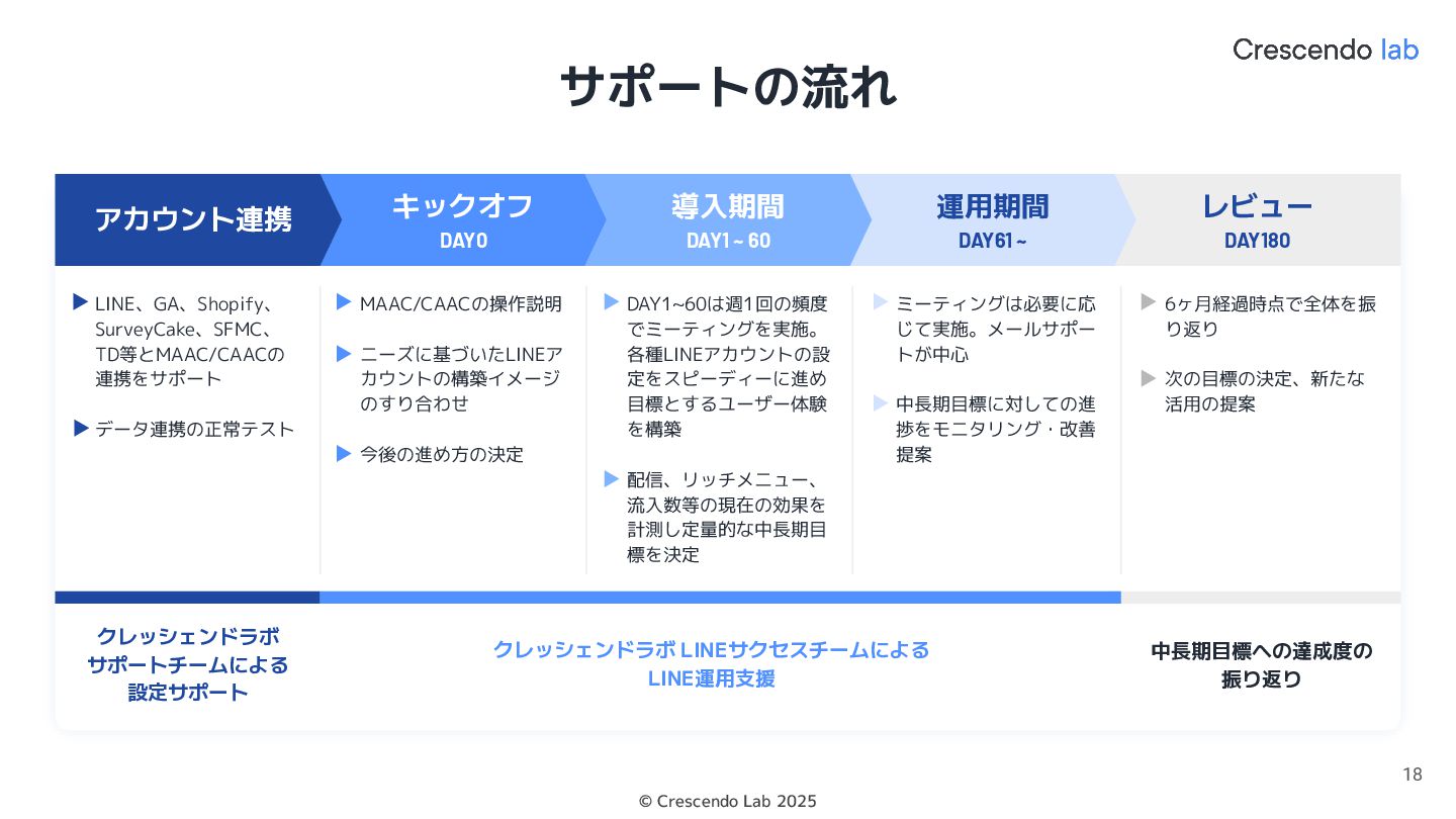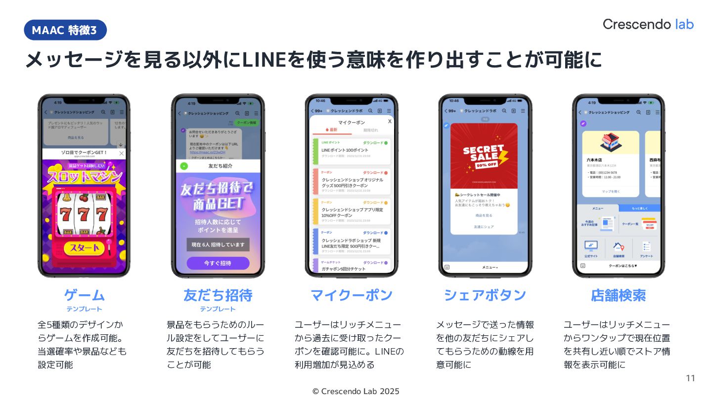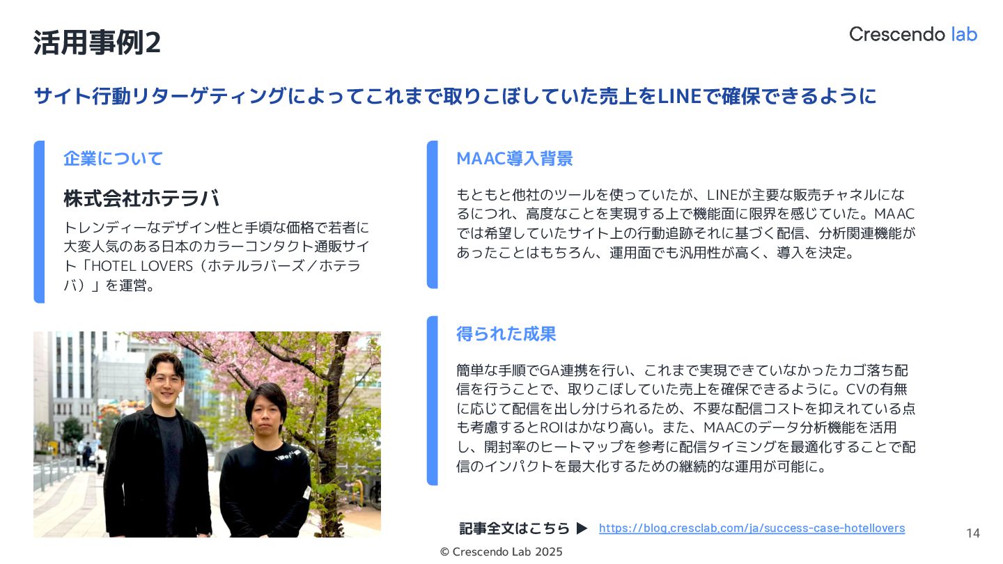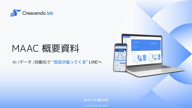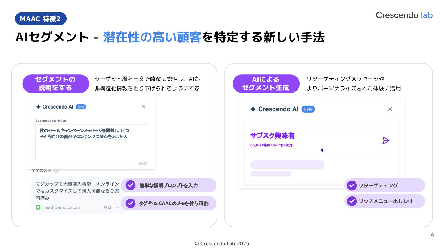でデータのやりとりが可能に クレッシェンドラボ Open API シームレスなID連携方法の実装 双方向のプロフィール、ステータス情報の取 得、更新、削除 パラメータ差し込みメッセージ配信 LINEパフォーマンスレポートの取得 1 2 3 4 Messaging Analytics & Automation Cloud MAAC LINEUID 行動データ Behavioral data GA4からページ閲覧、カートイン、購入の3イ ベントをLINEUIDと紐付けて取得し、ユーザー の行動に基づいたセグメント作成、カゴ落ち配 信、レコメンド配信等が可能に MAAC リターゲティング SDK MAAC独自のSDKをウェブサイトに埋め込 むことでデータラグを無くしたカゴ落ち配 信が可能に。取得データ範囲を順次拡大中 LINEUID、アイコン、ユーザー 名、(Email)、開封、クリック、 流入経路、アンケート回答内容 など、基本的な情報を網羅 MAAC 特徴1 LINE外のデータをLINEユーザーIDに紐付けて取得/活用可能に LINE内取得可能データ