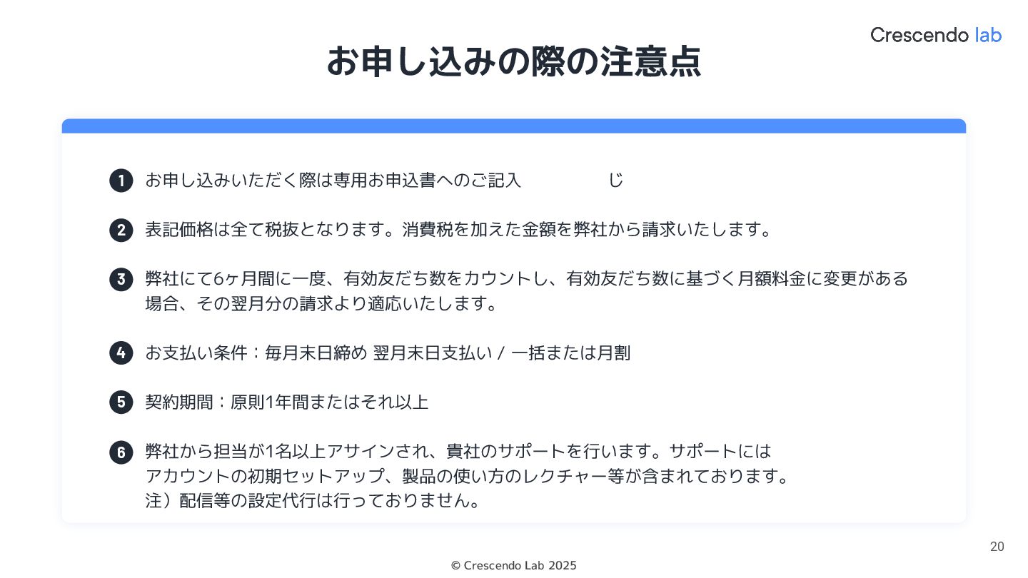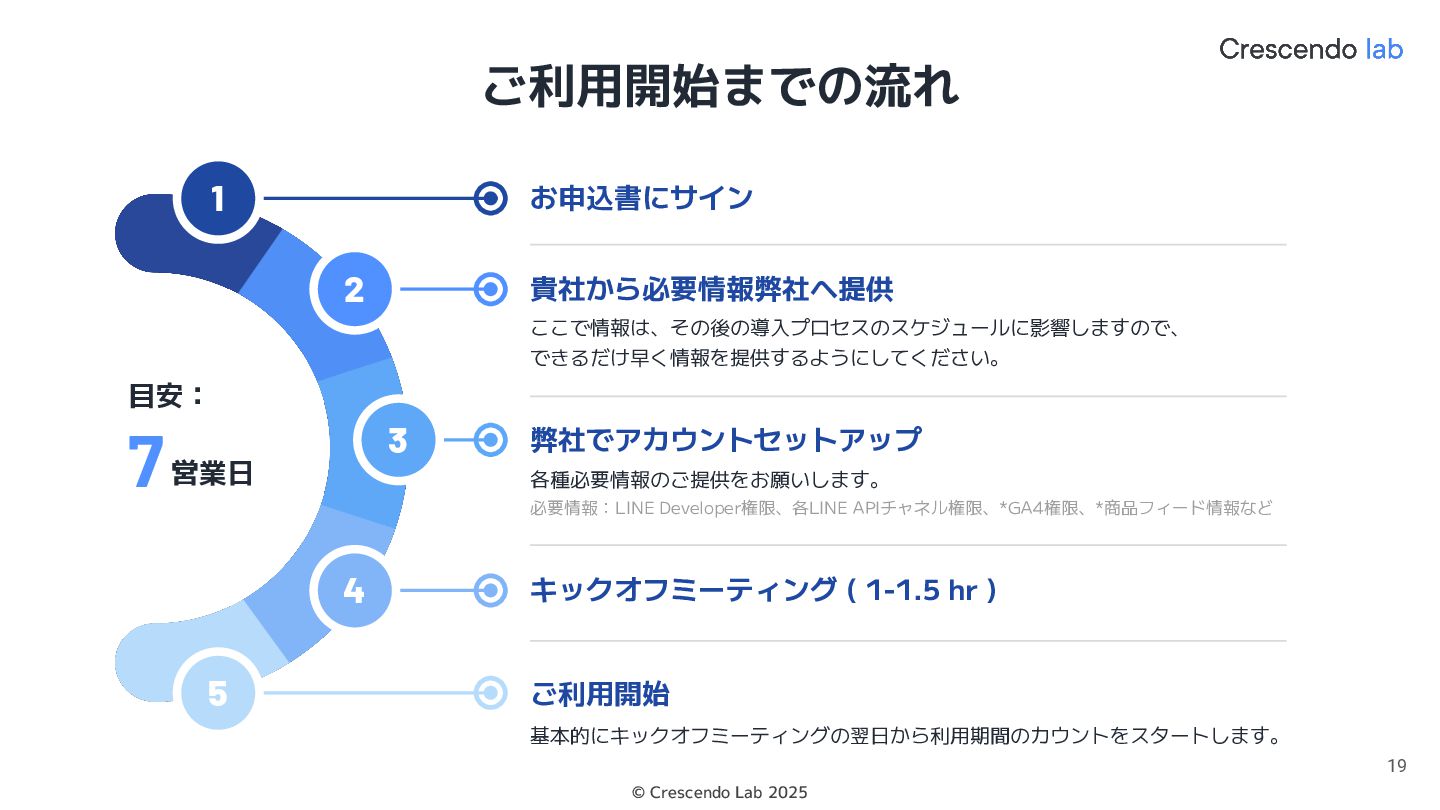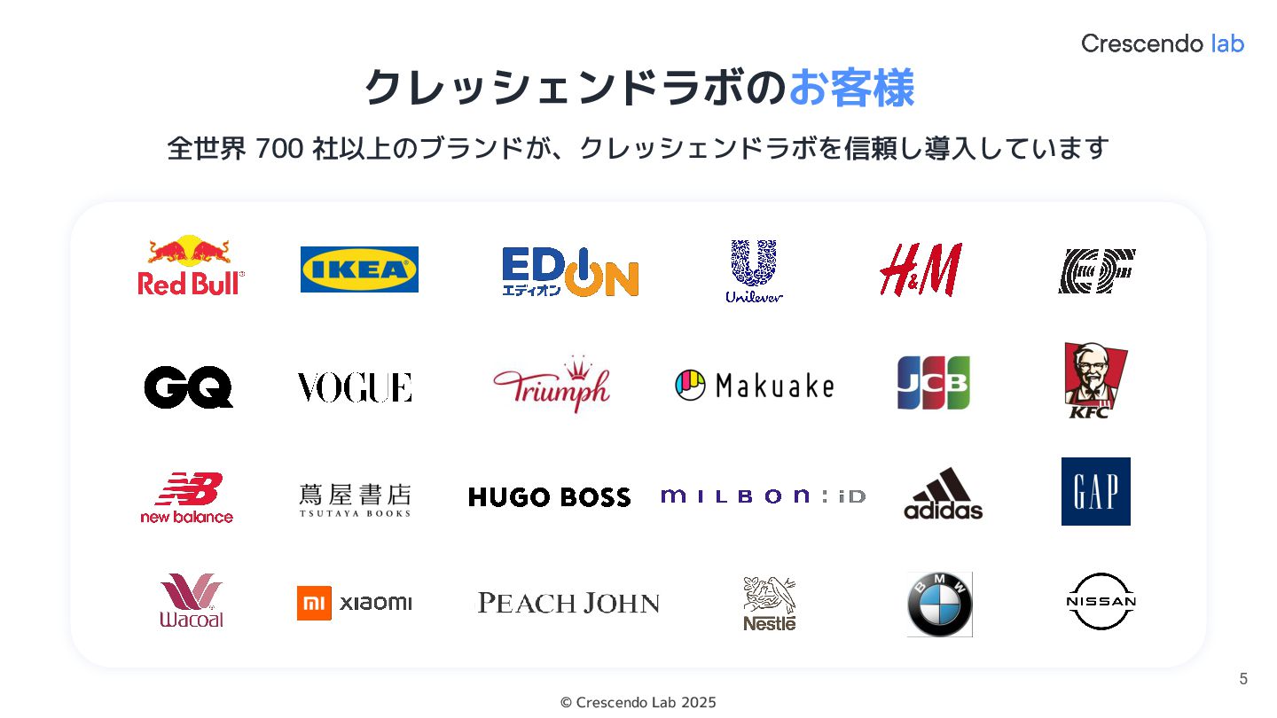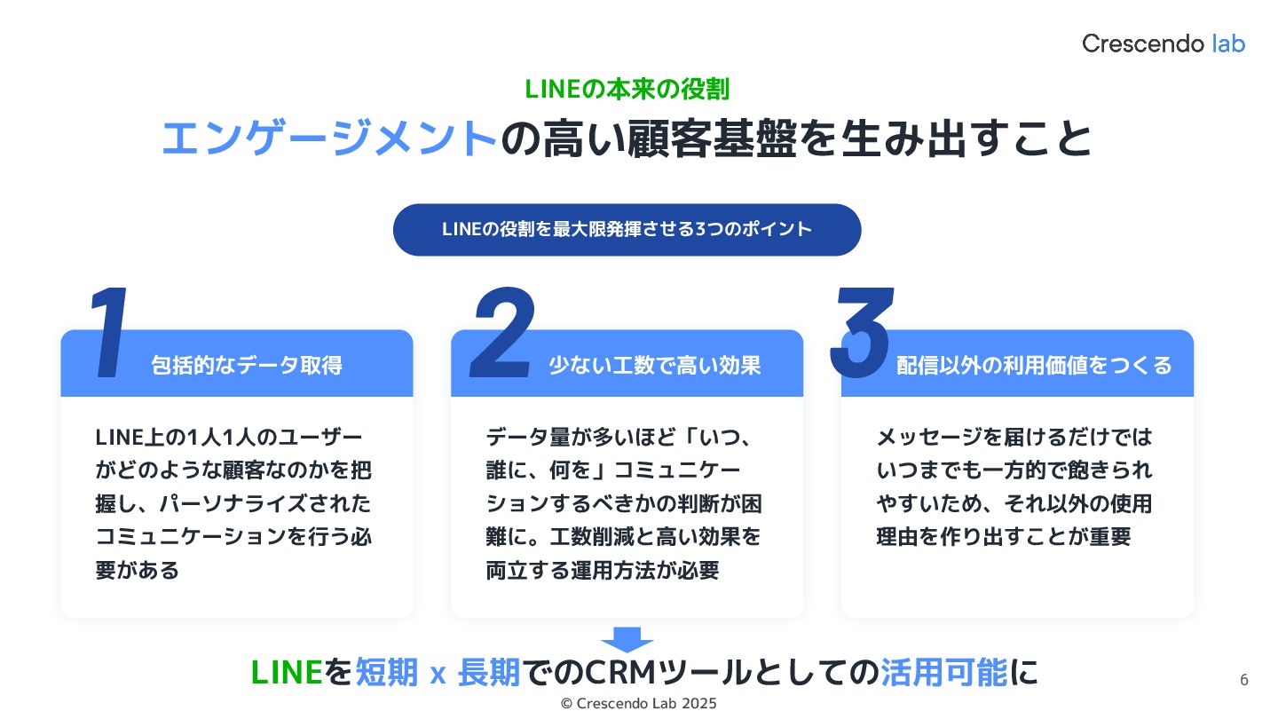でデータのやりとりが可能に クレッシェンドラボ Open API シームレスなID連携方法の実装 双方向のプロフィール、ステータス情報の取 得、更新、削除 パラメータ差し込みメッセージ配信 LINEパフォーマンスレポートの取得 1 2 3 4 Messaging Analytics & Automation Cloud MAAC LINEUID 行動データ Behavioral data GA4からページ閲覧、カートイン、購入の3イ ベントをLINEUIDと紐付けて取得し、ユーザー の行動に基づいたセグメント作成、カゴ落ち配 信、レコメンド配信等が可能に MAAC リターゲティング SDK MAAC独自のSDKをウェブサイトに埋め込 むことでデータラグを無くしたカゴ落ち配 信が可能に。取得データ範囲を順次拡大中 LINEUID、アイコン、ユーザー 名、(Email)、開封、クリック、 流入経路、アンケート回答内容 など、基本的な情報を網羅 MAAC 特徴1 LINE外のデータをLINEユーザーIDに紐付けて取得/活用可能に LINE内取得可能データ