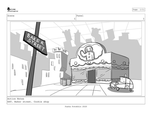 Unicorn Detective is one of my original projects. Here is a sample of a scene where clues leads our hero to the conclusion that living Gingerbread-Man ate himself, who is also was owner of Baker shop on Baker street which is a crime scene.