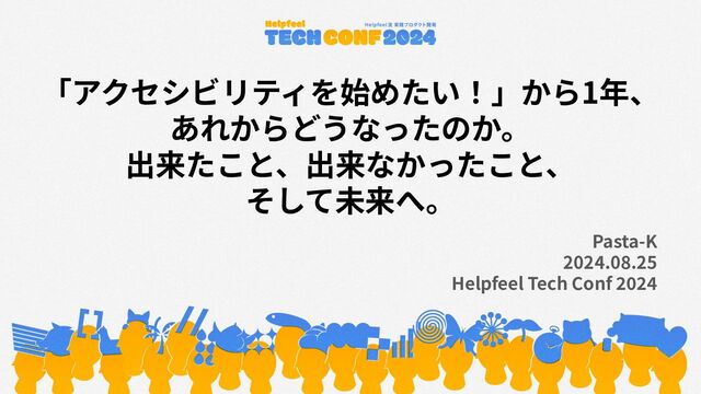 「アクセシビリティを始めたい!」から1年、 あれからどうなったのか。 出来たこと、出来なかったこと、 そして未来へ。 Pasta-K 2024.08.25 Helpfeel Tech Conf 2024