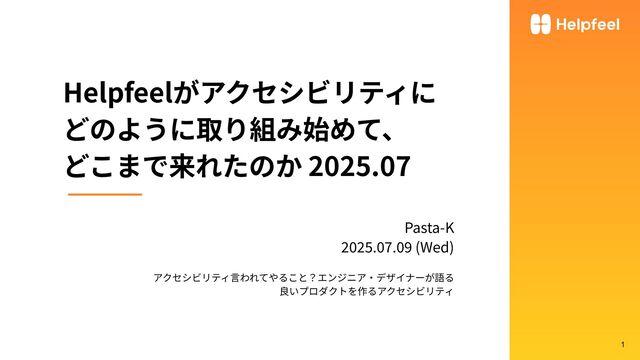 Helpfeelがアクセシビリティに どのように取り組み始めて、 どこまで来れたのか 2025.07 Pasta-K 2025.07.09 (Wed) アクセシビリティ⾔われてやること?エンジニア‧デザイナーが語る 良いプロダクトを作るアクセシビリティ 1