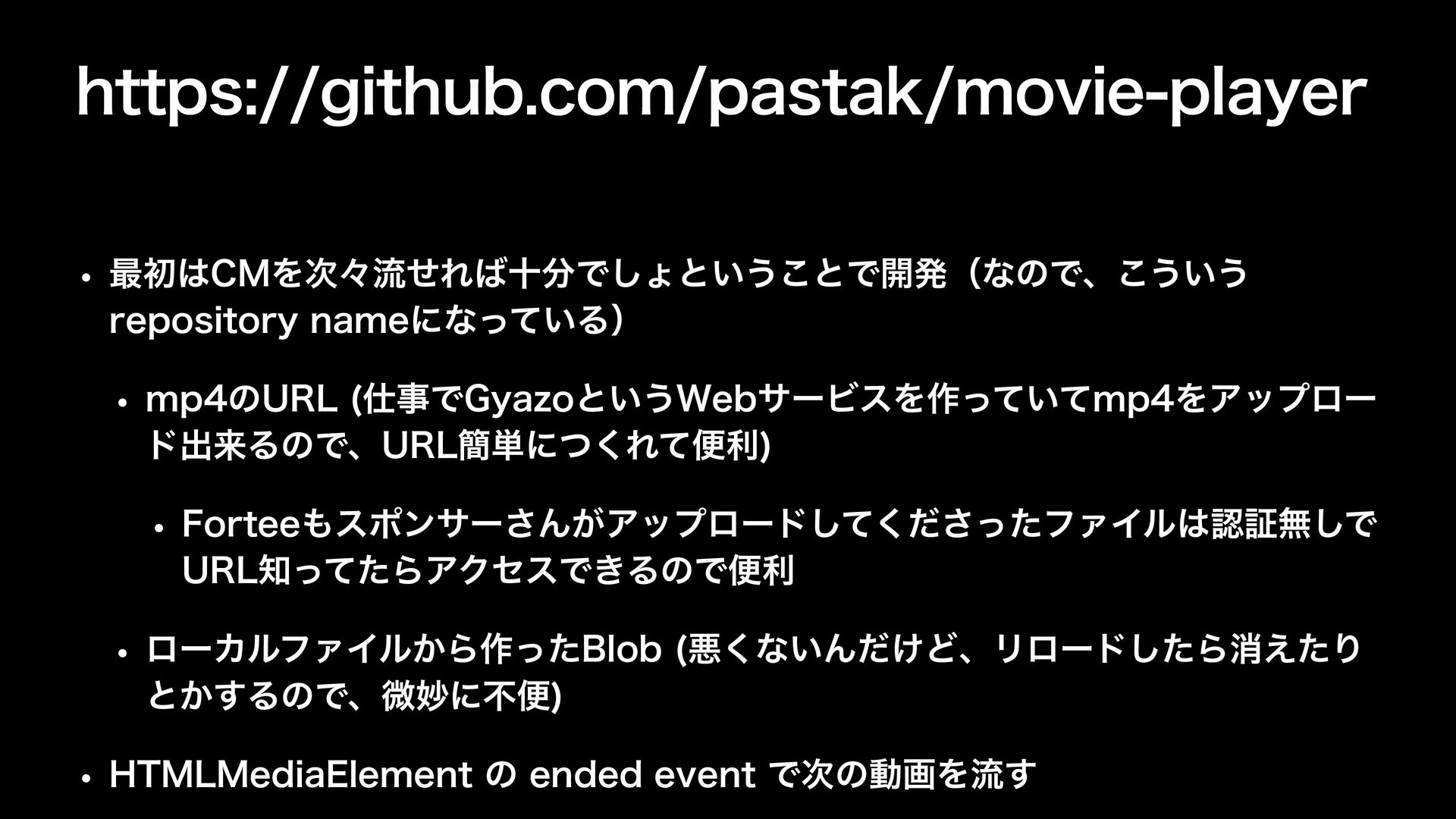 IUUQTHJUIVCDPNQBTUBLNPWJFQMBZFS w ΞλοΫΛग़͍ͨ͠ͱ͍͏͜ͱͰׂΓࠐΈػೳΛ։ൃ w ΞλοΫొஃऀͷ͍հಈըΈ͍ͨͳͭ w ͜ͷׂΓࠐΈػೳศརͰɺ৭ʑͳ͜ͱʹྲྀ༻͞ΕΔΑ͏ʹͳΔ w ҙͷλΠϛϯάͰϑλ ϩΰը૾ͳͲ