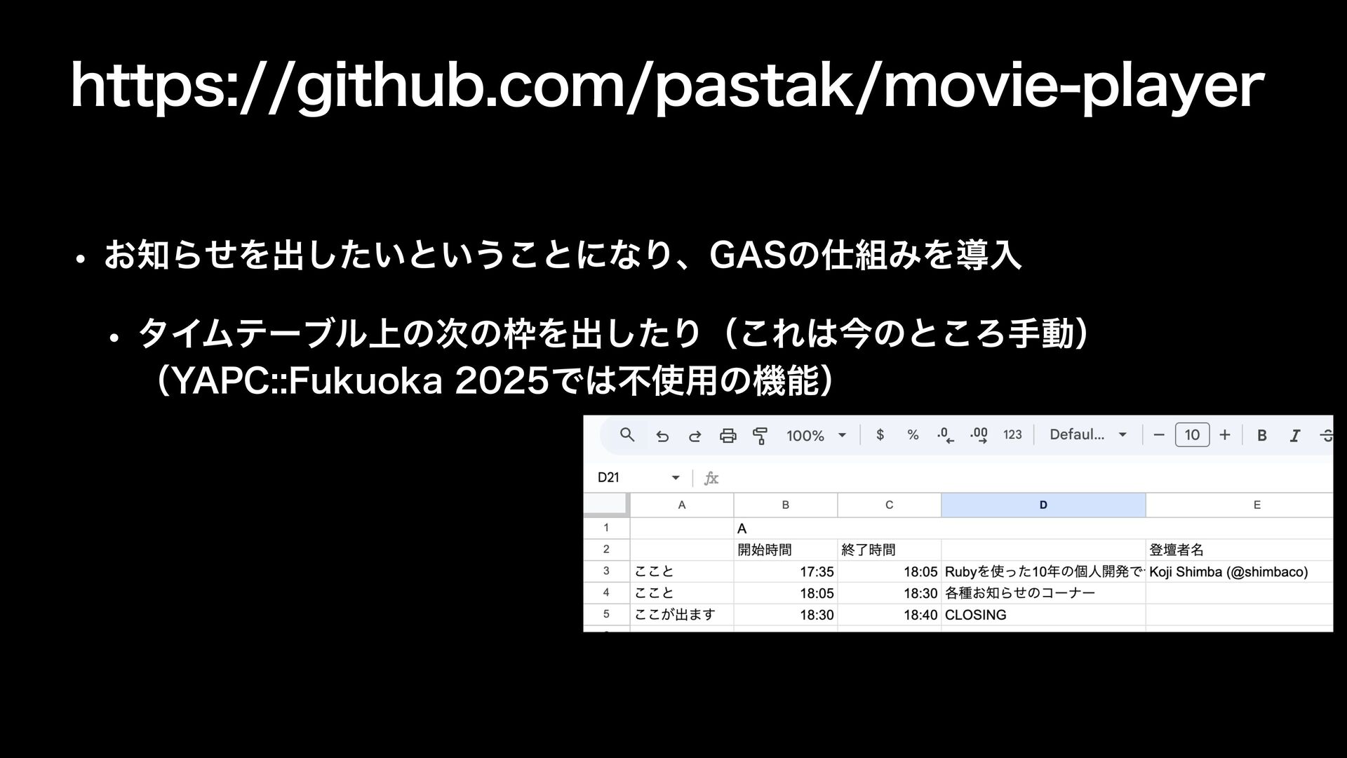 IUUQTHJUIVCDPNQBTUBLNPWJFQMBZFS w ࣾͷΠϕϯτͳͲͰαΠωʔδతͳΈΛಋೖ͢ΔͨΊʹ։ൃ w ͓Βͤදࣔ࣍ͷλΠϜςʔϒϧͷҊ w Πϕϯτ͝ͱʹదʹϑΝΠϧͳͲΛஔͯ͠(JUIVC1BHFTͰಈ͔͍ͯͨ͠ w Ͳͷ1$ͰαΠωʔδΛͤ͞ΒΕͯศར w