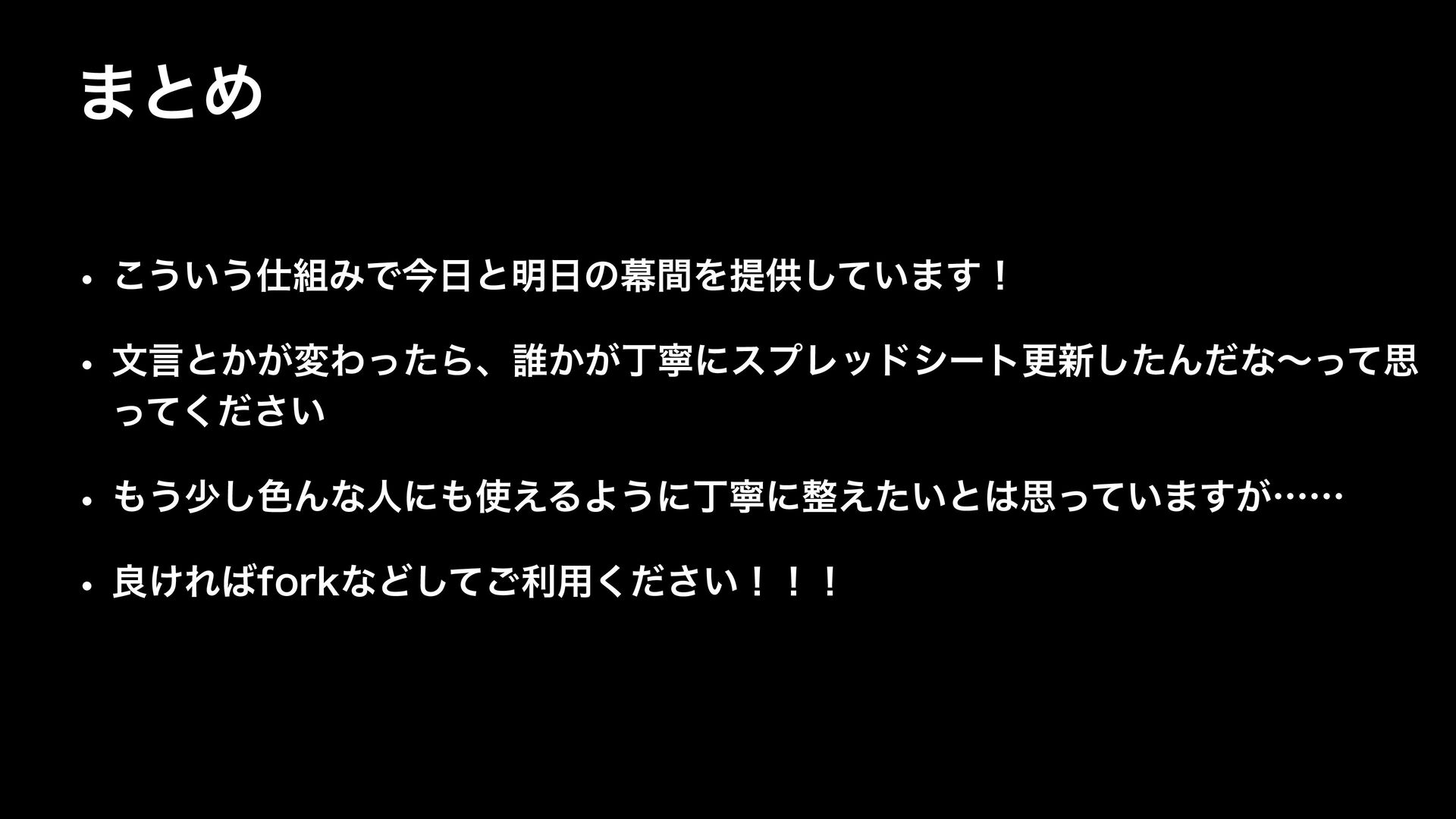 ·ͱΊ w ͜͏͍͏ΈͰࠓͱ໌ͷນؒΛఏڙ͍ͯ͠·͢ʂ w จݴͱ͔͕มΘͬͨΒɺ୭͔͕ஸೡʹεϓϨουγʔτߋ৽ͨ͠Μͩͳʙͬͯࢥ ͍ͬͯͩ͘͞ w ͏গ͠৭Μͳਓʹ͑ΔΑ͏ʹஸೡʹ͍͑ͨͱࢥ͍ͬͯ·͕͢ʜʜ w ྑ͚ΕGPSLͳͲͯ͠͝ར༻͍ͩ͘͞ʂʂʂ
