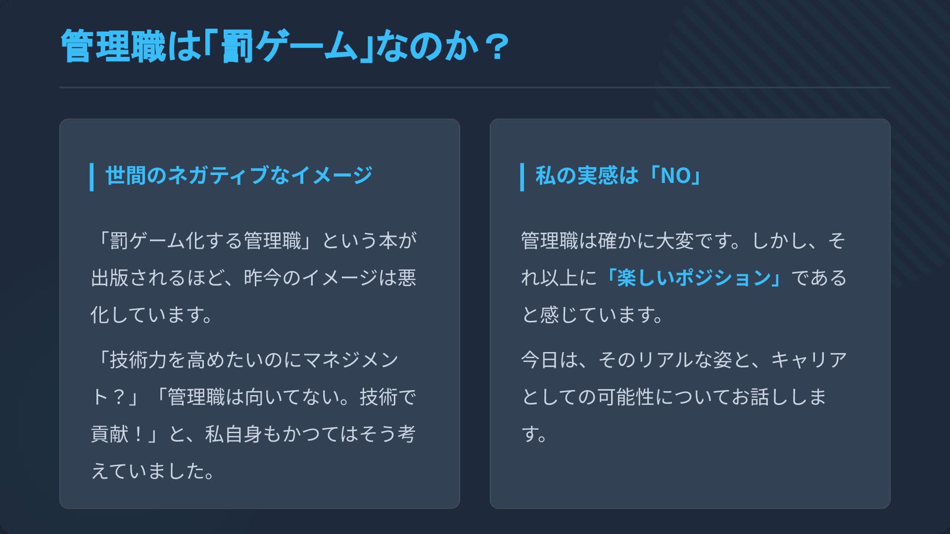 世間のネガティブなイメージ 「罰ゲーム化する管理職」という本が 出版されるほど、昨今のイメージは悪 化しています。 「技術⼒を⾼めたいのにマネジメン ト?」「管理職は向いてない。技術で 貢献!」と、私⾃⾝もかつてはそう考 えていました。 私の実感は「NO」 管理職は確かに⼤変です。しかし、そ