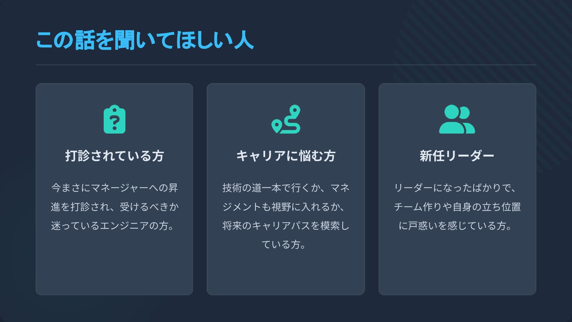 打診されている⽅ 今まさにマネージャーへの昇 進を打診され、受けるべきか 迷っているエンジニアの⽅。 キャリアに悩む⽅ 技術の道⼀本で⾏くか、マネ ジメントも視野に⼊れるか、 将来のキャリアパスを模索し ている⽅。 新任リーダー