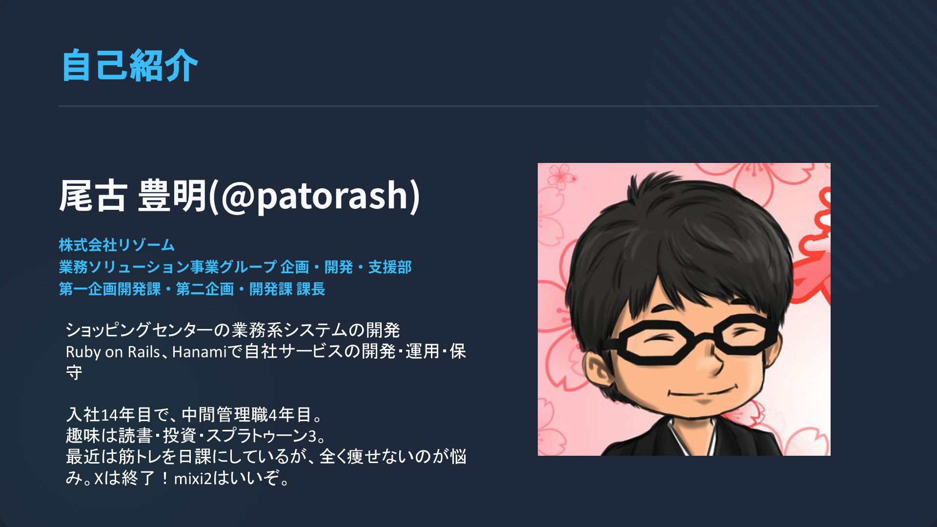 尾古 豊明(@patorash) 株式会社リゾーム 業務ソリューション事業グループ 企画‧開発‧⽀援部 第⼀企画開発課‧第⼆企画‧開発課 課⻑ 自己紹介 ショッピングセンターの業務系システムの開発 Ruby