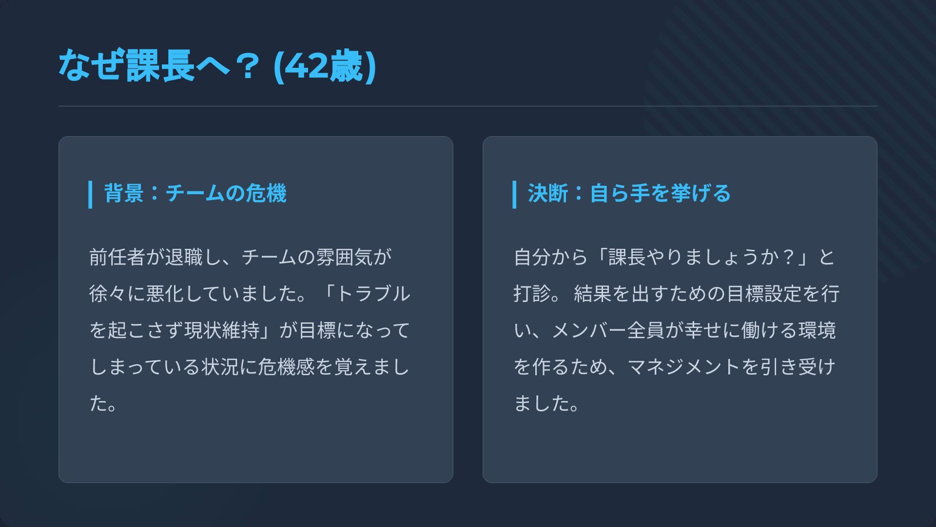 い、メンバー全員が幸せに働ける環境 を作るため、マネジメントを引き受け ました。 なぜ課長へ? (42歳)