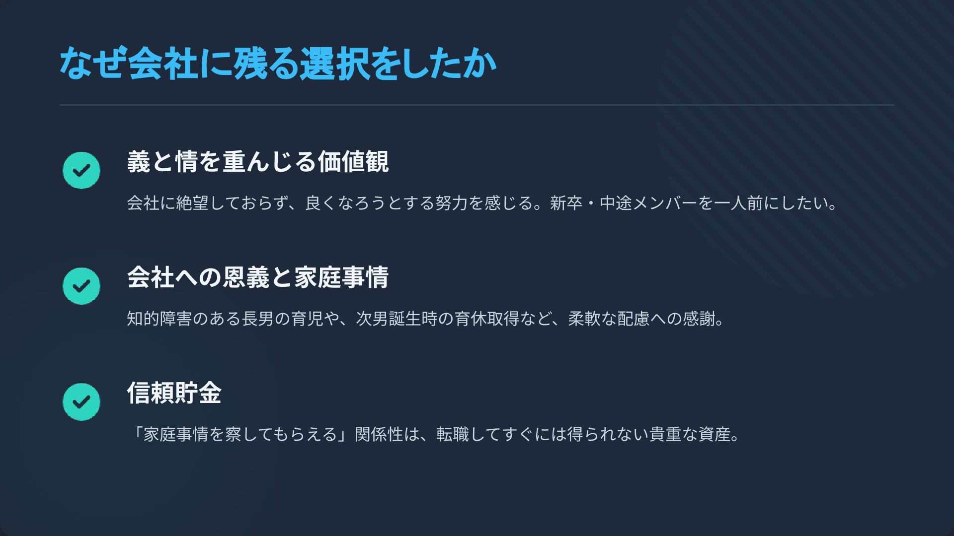 義と情を重んじる価値観 会社に絶望しておらず、良くなろうとする努⼒を感じる。新卒‧中途メンバーを⼀⼈前にしたい。 会社への恩義と家庭事情 知的障害のある⻑男の育児や、次男誕⽣時の育休取得など、柔軟な配慮への感謝。 信頼貯⾦ 「家庭事情を察してもらえる」関係性は、転職してすぐには得られない貴重な資産。 なぜ会社に残る選択をしたか