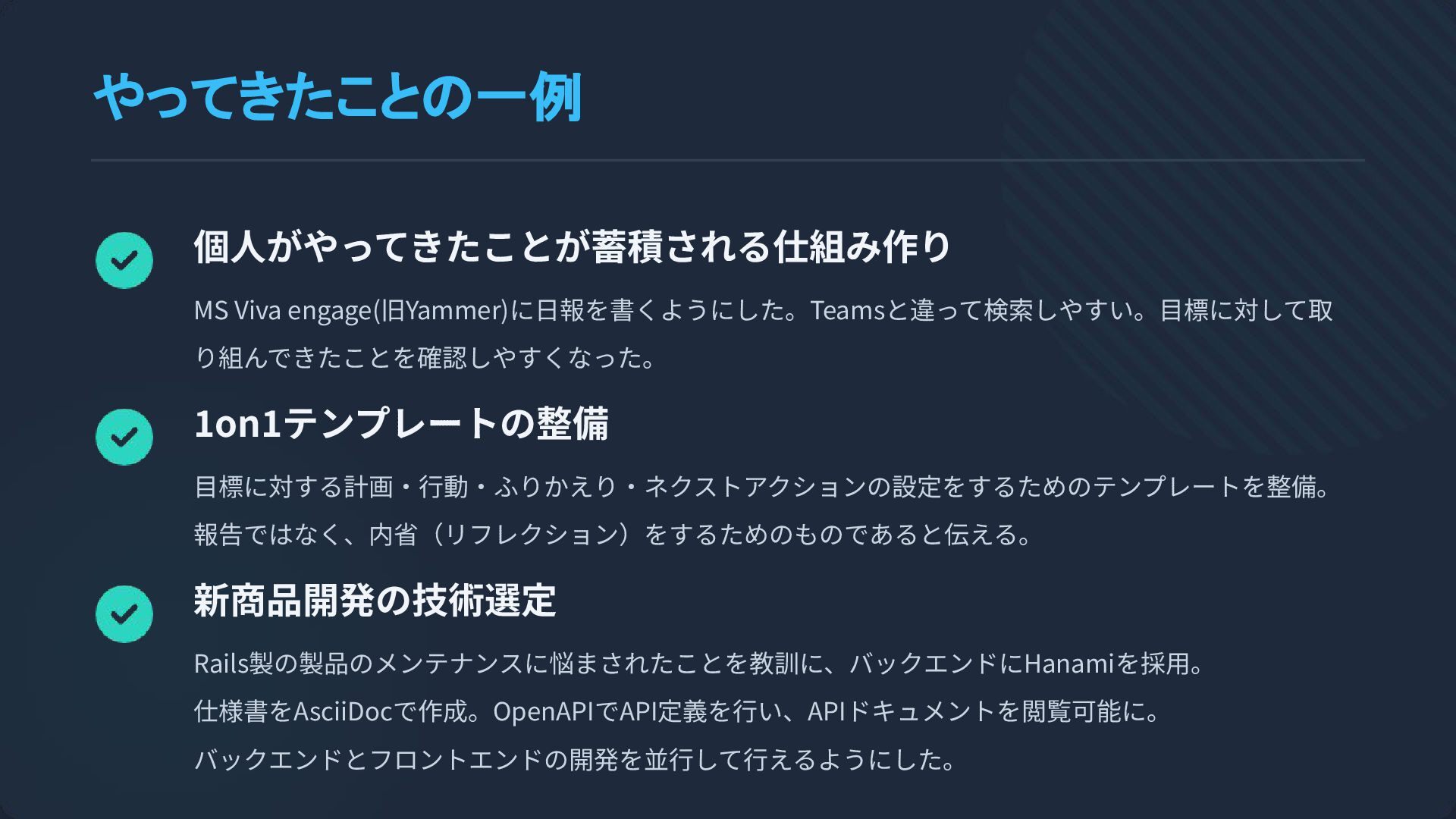 個⼈がやってきたことが蓄積される仕組み作り MS Viva engage(旧Yammer)に⽇報を書くようにした。Teamsと違って検索しやすい。⽬標に対して取 り組んできたことを確認しやすくなった。 1on1テンプレートの整備 ⽬標に対する計画‧⾏動‧ふりかえり‧ネクストアクションの設定をするためのテンプレートを整備。 報告ではなく、内省(リフレクション)をするためのものであると伝える。 新商品開発の技術選定 Rails製の製品のメンテナンスに悩まされたことを教訓に、バックエンドにHanamiを採⽤。
