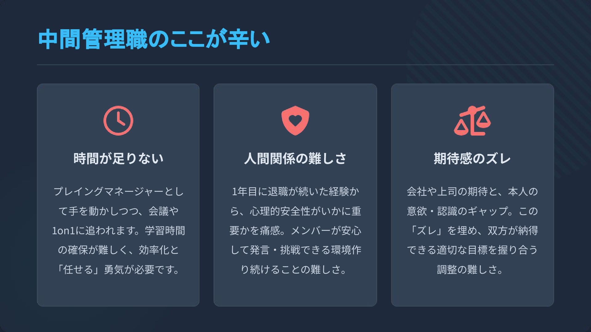 時間が⾜りない プレイングマネージャーとし て⼿を動かしつつ、会議や 1on1に追われます。学習時間 の確保が難しく、効率化と 「任せる」勇気が必要です。 ⼈間関係の難しさ 1年⽬に退職が続いた経験か ら、⼼理的安全性がいかに重 要かを痛感。メンバーが安⼼