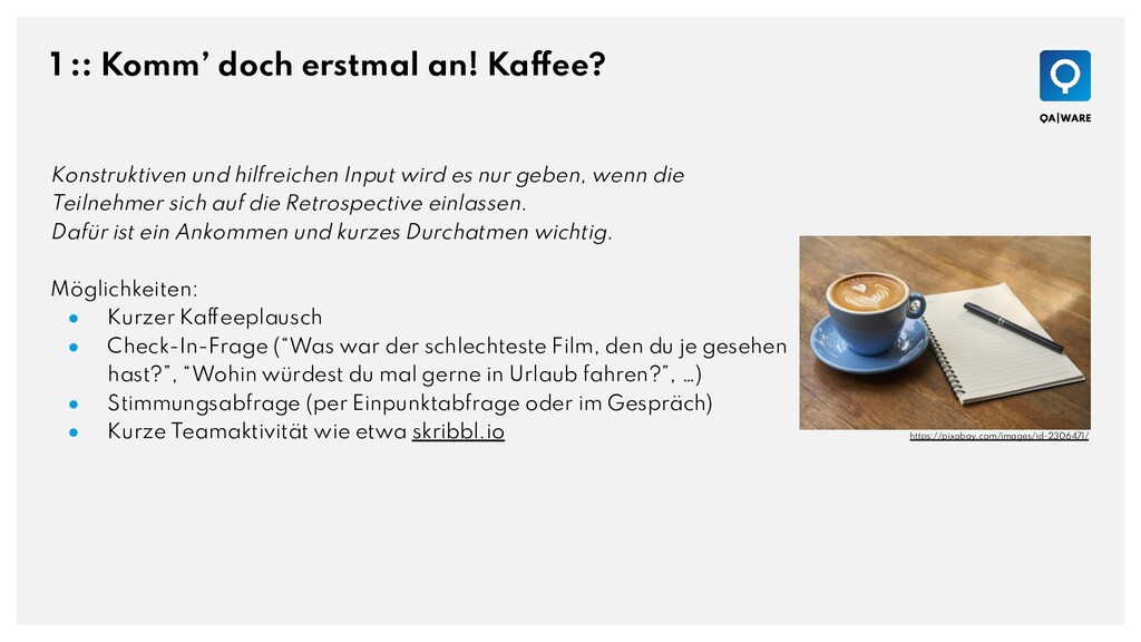 Input wird es nur geben, wenn die Teilnehmer sich auf die Retrospective einlassen. Dafür ist ein Ankommen und kurzes Durchatmen wichtig. Möglichkeiten: • Kurzer Kaffeeplausch • Check-In-Frage (“Was war der schlechteste Film, den du je gesehen hast?”, “Wohin würdest du mal gerne in Urlaub fahren?”, …) • Stimmungsabfrage (per Einpunktabfrage oder im Gespräch) • Kurze Teamaktivität wie etwa skribbl.io https://pixabay.com/images/id-2306471/