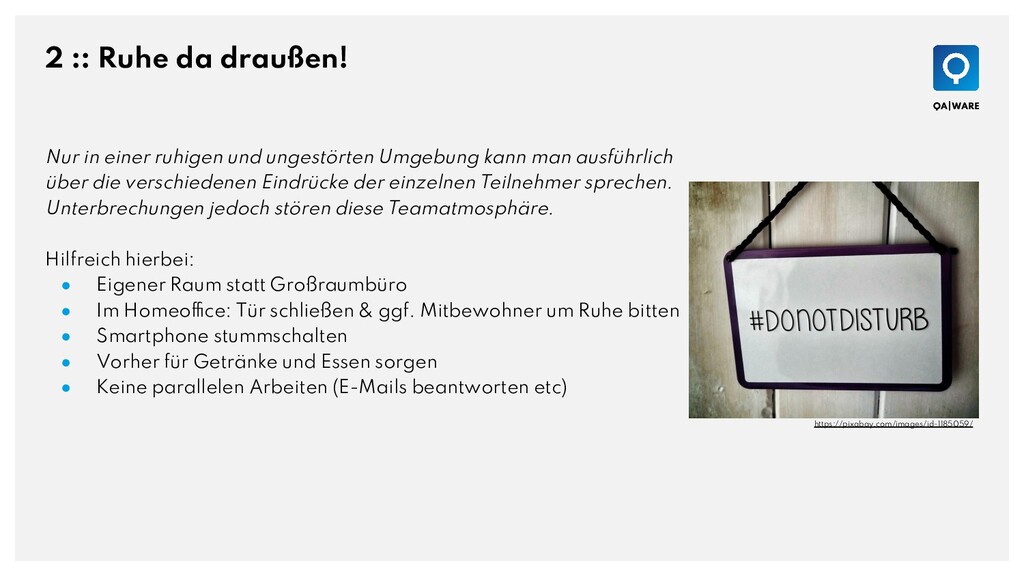 ungestörten Umgebung kann man ausführlich über die verschiedenen Eindrücke der einzelnen Teilnehmer sprechen. Unterbrechungen jedoch stören diese Teamatmosphäre. Hilfreich hierbei: • Eigener Raum statt Großraumbüro • Im Homeoffice: Tür schließen & ggf. Mitbewohner um Ruhe bitten • Smartphone stummschalten • Vorher für Getränke und Essen sorgen • Keine parallelen Arbeiten (E-Mails beantworten etc) https://pixabay.com/images/id-1185059/