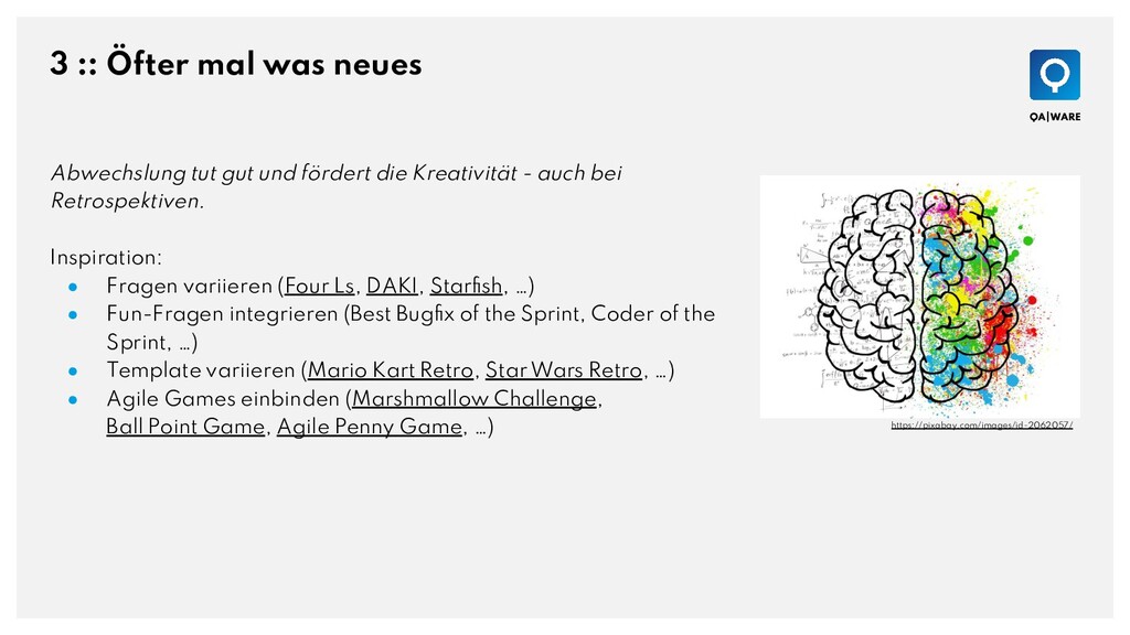 fördert die Kreativität - auch bei Retrospektiven. Inspiration: • Fragen variieren (Four Ls, DAKI, Starfish, …) • Fun-Fragen integrieren (Best Bugfix of the Sprint, Coder of the Sprint, …) • Template variieren (Mario Kart Retro, Star Wars Retro, …) • Agile Games einbinden (Marshmallow Challenge, Ball Point Game, Agile Penny Game, …) https://pixabay.com/images/id-2062057/