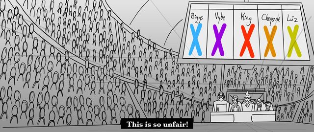 Trying to get through into the next round, two contestants fight for their spot against a panel of judges.