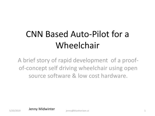 Summary: This lightening talk describes the development & results that were successfully used to create a proof-of-concept (POC) prototype for a CNN based auto-pilot function that was able to autonomously drive a wheelchair based on a single input image stream from forward facing camera . A brief explanation of how the CNN is used to autonomously drive the wheelchair is provided, including a short video demo. As well, a description of the low-cost hardware/software system, & the learnings that were obtained, now being used as a basis for the next stage of development, will also be presented.